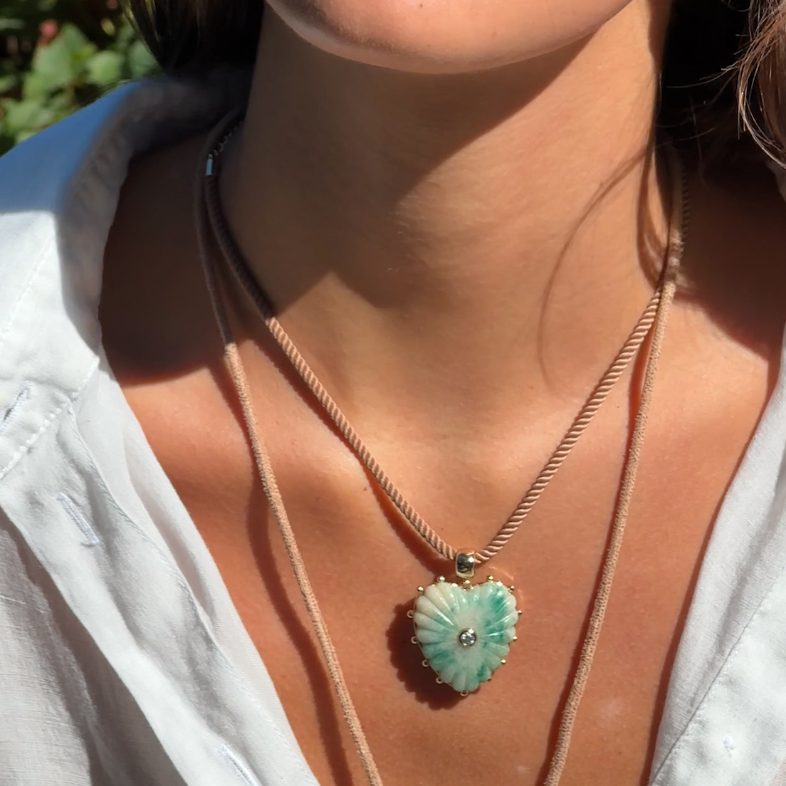 Our Malene heart charm in the unique speckled green dot jasper—hand-carved stone, cubic zirconia, and high-shine gold on a large round bail for versatility. Everything you want and need to make a statement.