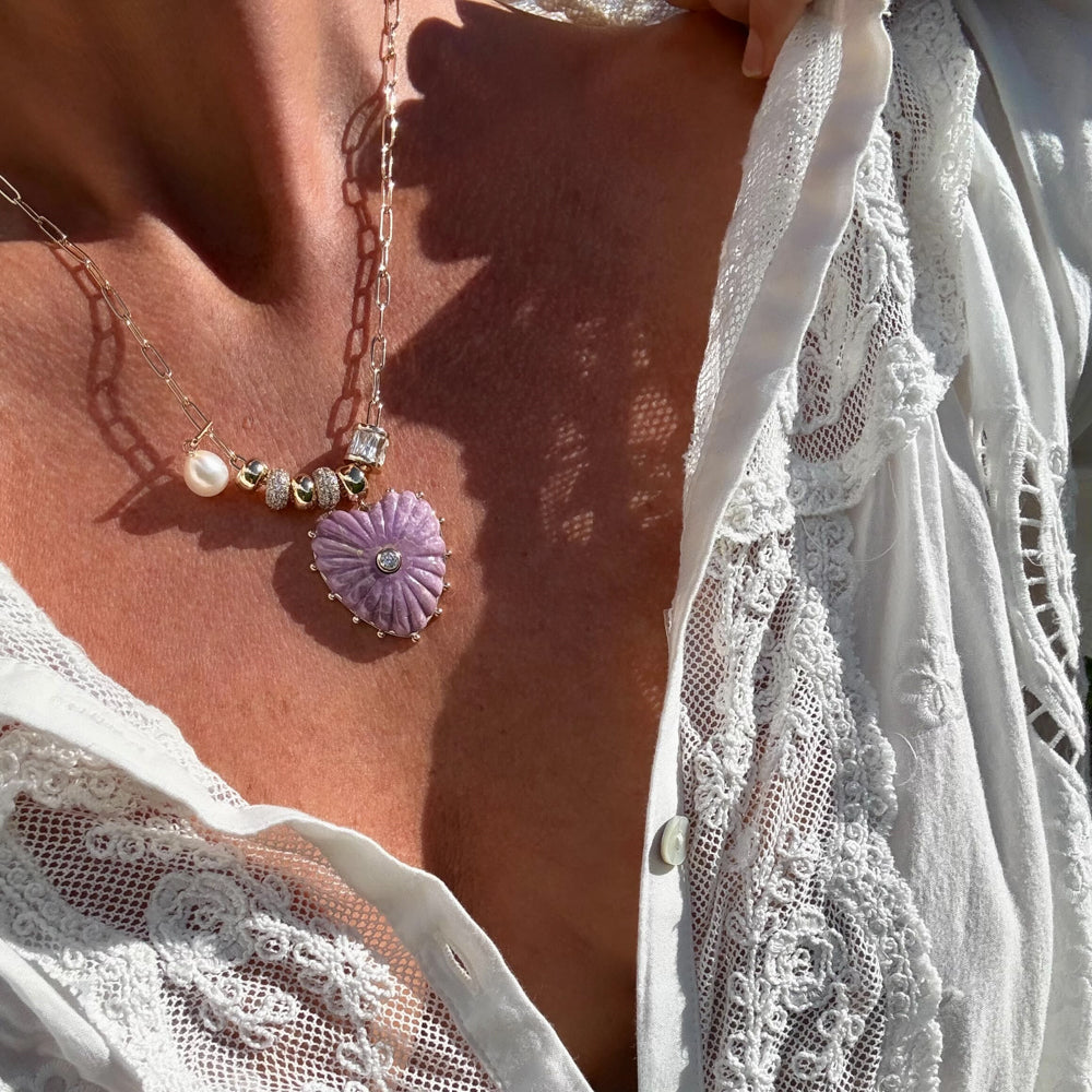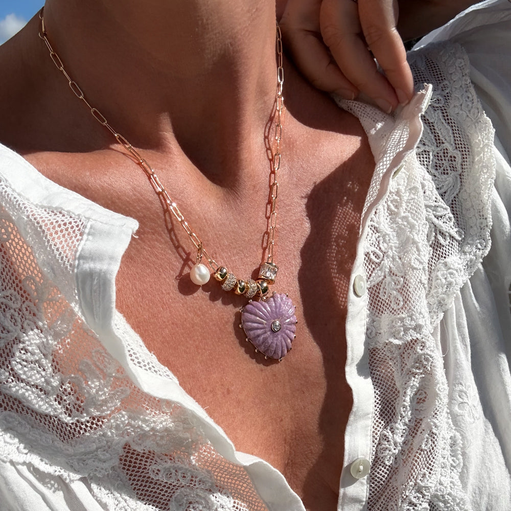 A must-have piece featuring our favorite hand-carved Malene heart charm surrounded by your favorite beads and pearl charms. The playful asymmetric design makes this a statement necklace worthy of a double take. Effortless fun for every occasion. She'll turn heads.