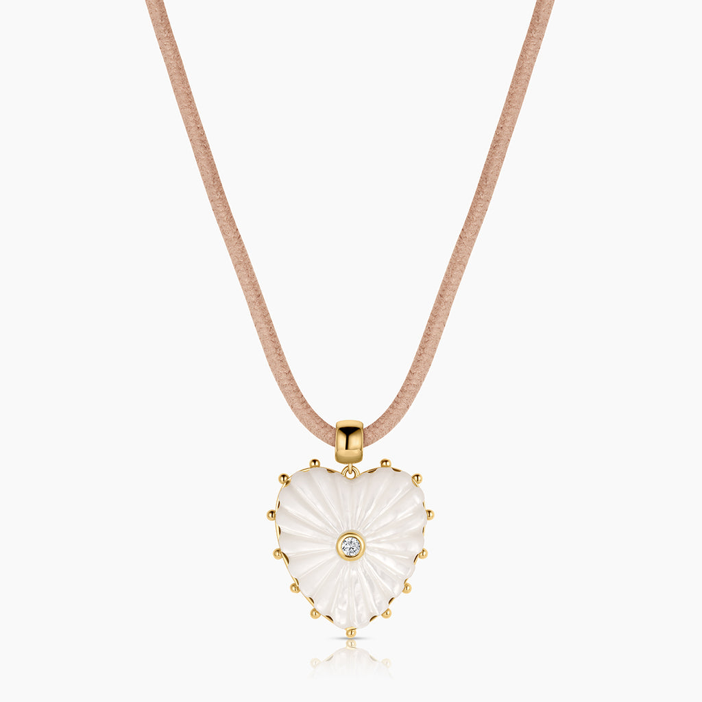 Our Malene heart charm in luminous mother of pearl—hand-carved stone, cubic zirconia, and high-shine gold on a large round bail for versatility. Everything you want and need to make a statement.