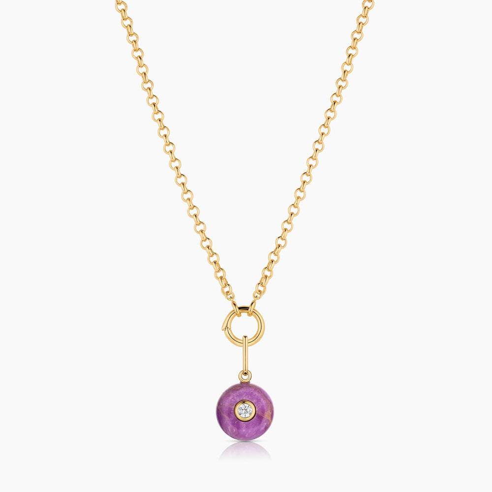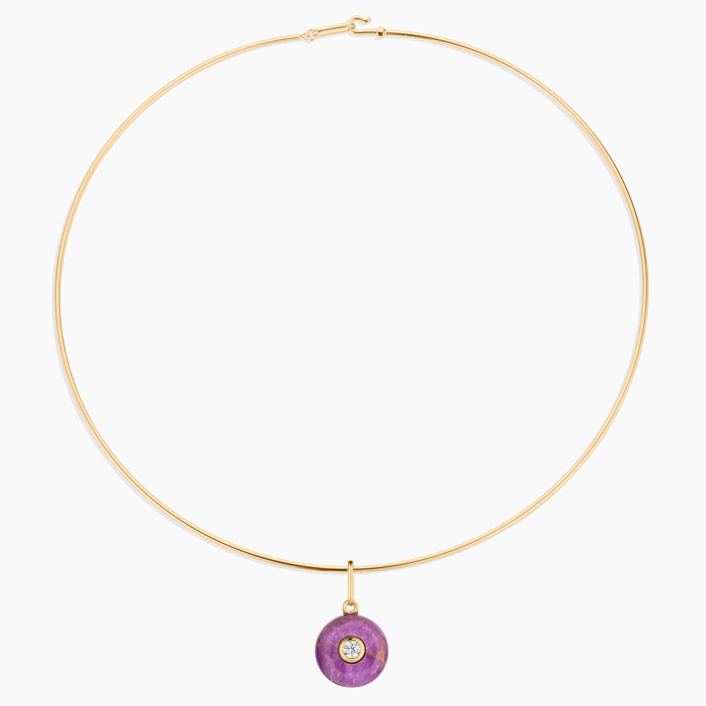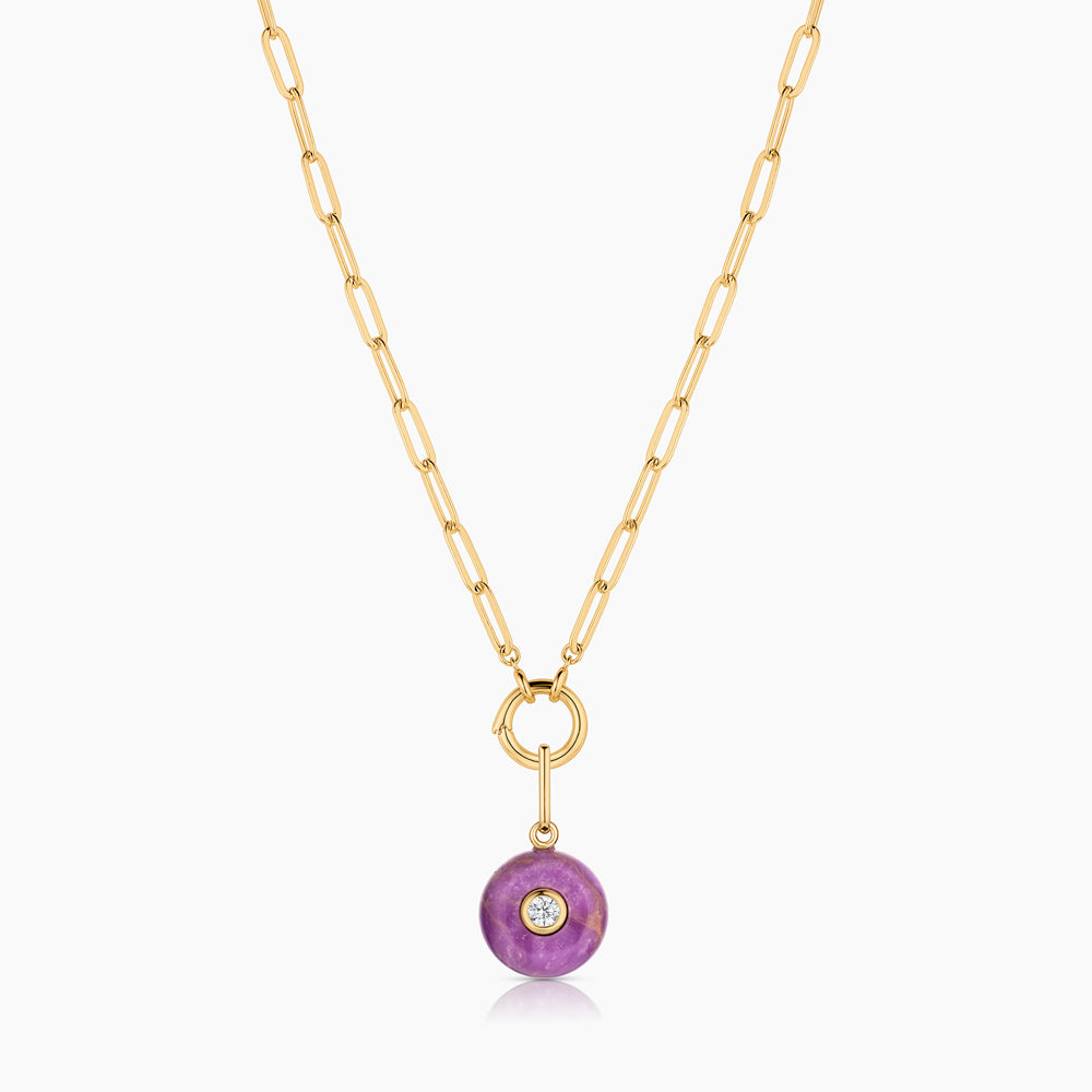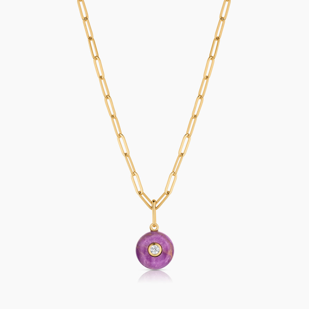 Materials: 14k gold plated, hand-carved purple mica, cubic zirconia