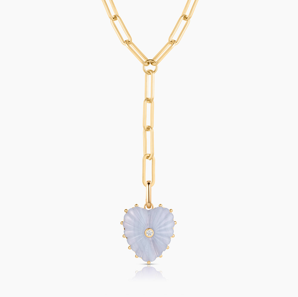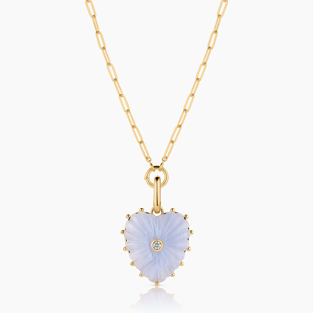Our Malene heart charm in dreamy blue lace agate—hand-carved stone, cubic zirconia, and high-shine gold on a hinge clip for removability. Everything you want and need to make a statement.