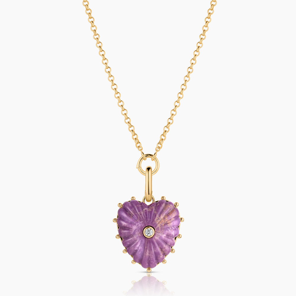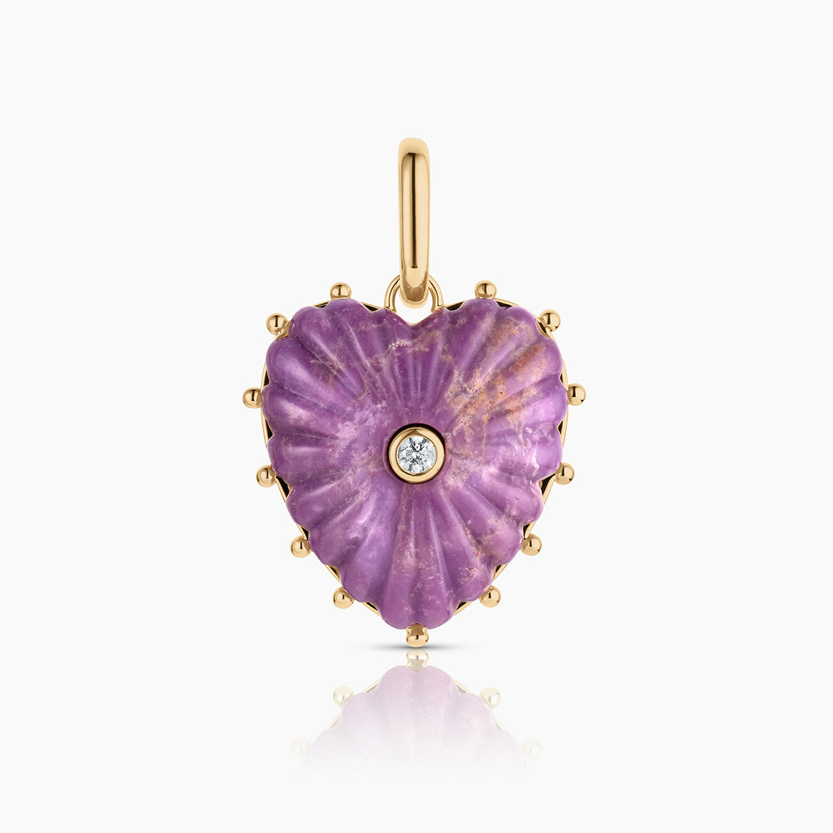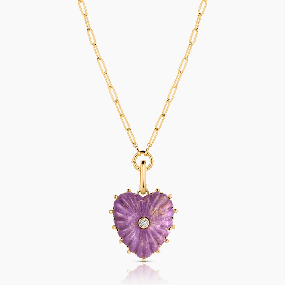 Our Malene heart charm in intoxicating purple mica — hand-carved stone, cubic zirconia, and high-shine gold on a hinge clip for removability. Everything you want and need to make a statement.