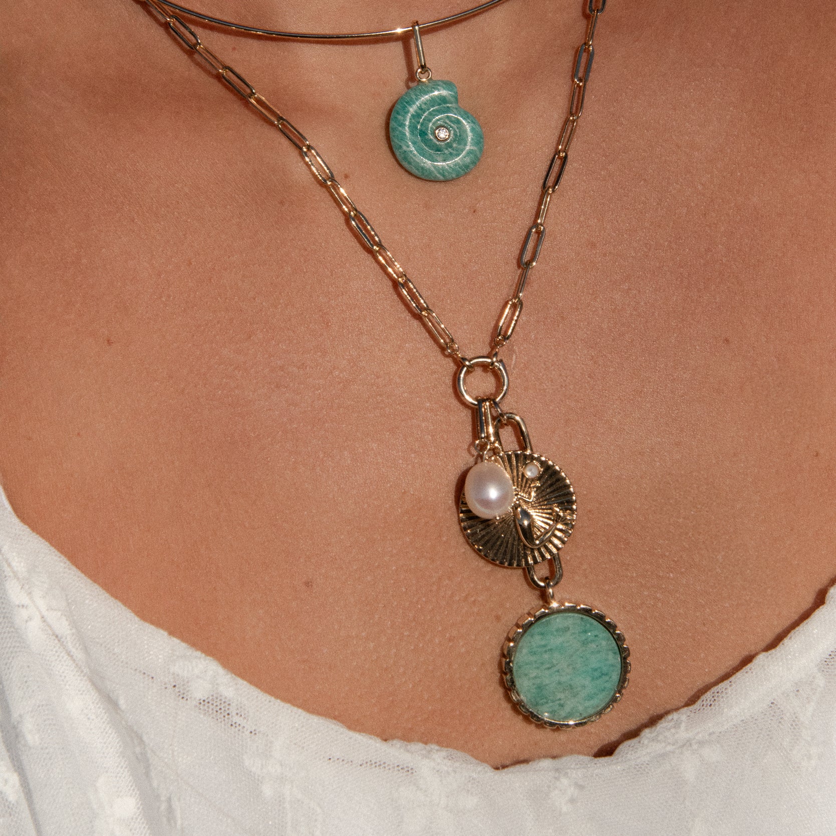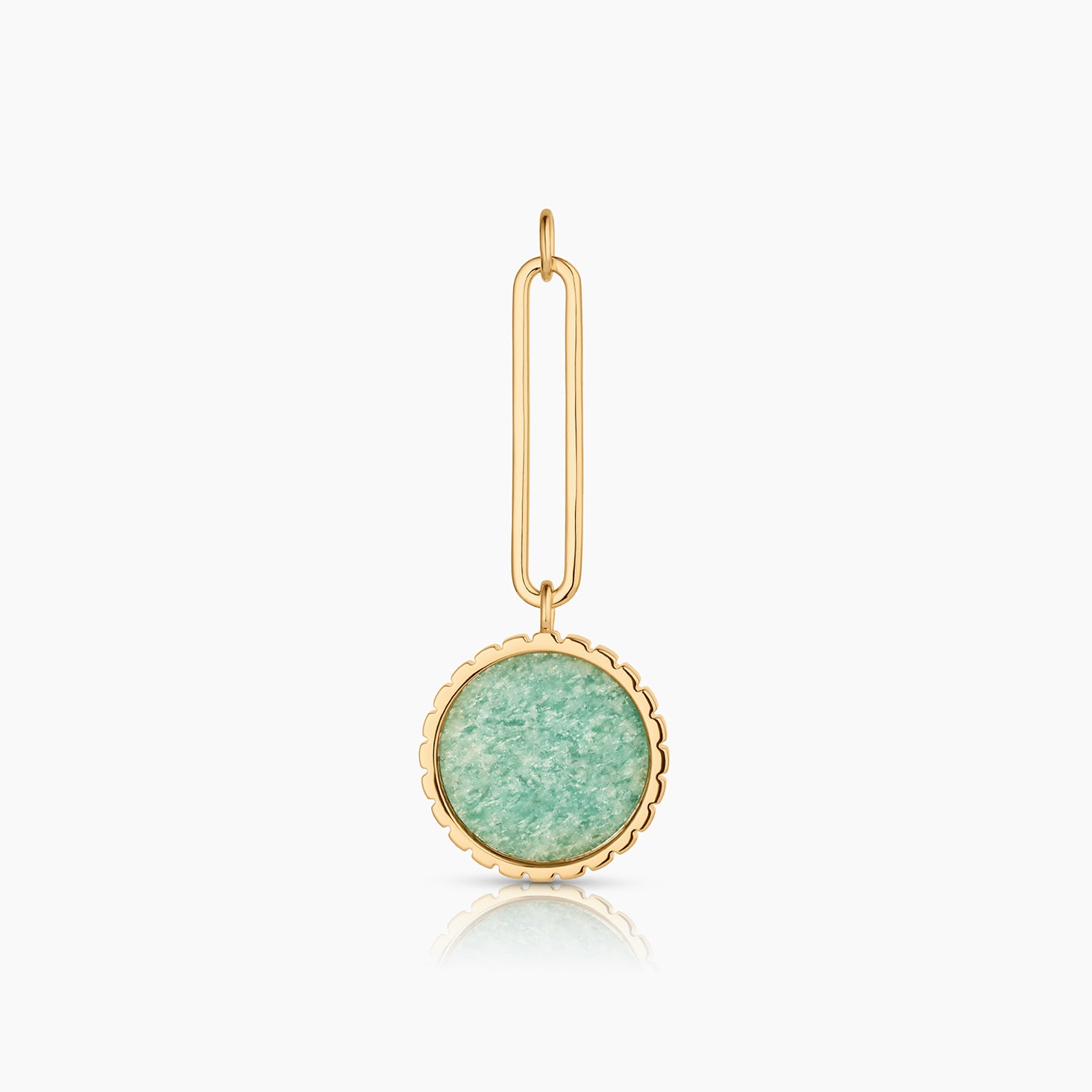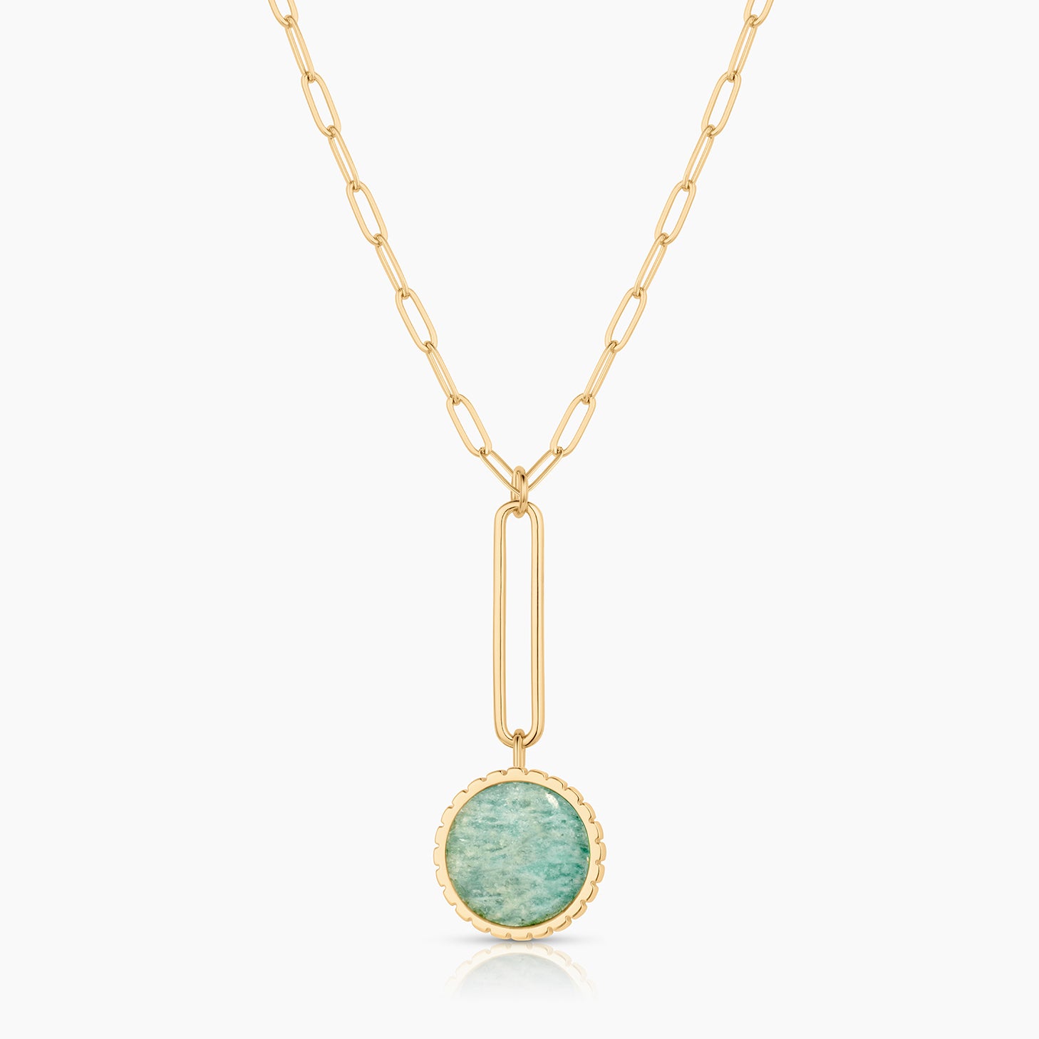 Embrace the beauty of our 100% natural gemstones with this exaggerated and modern drop charm made with hand-carved amazonite. Perfect for extra long chains, deep V-necks, and coastal getaways.