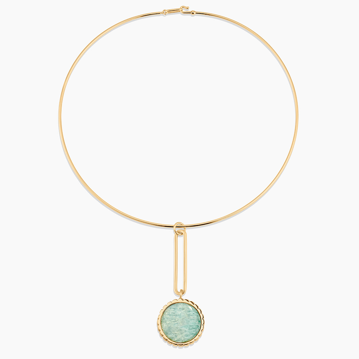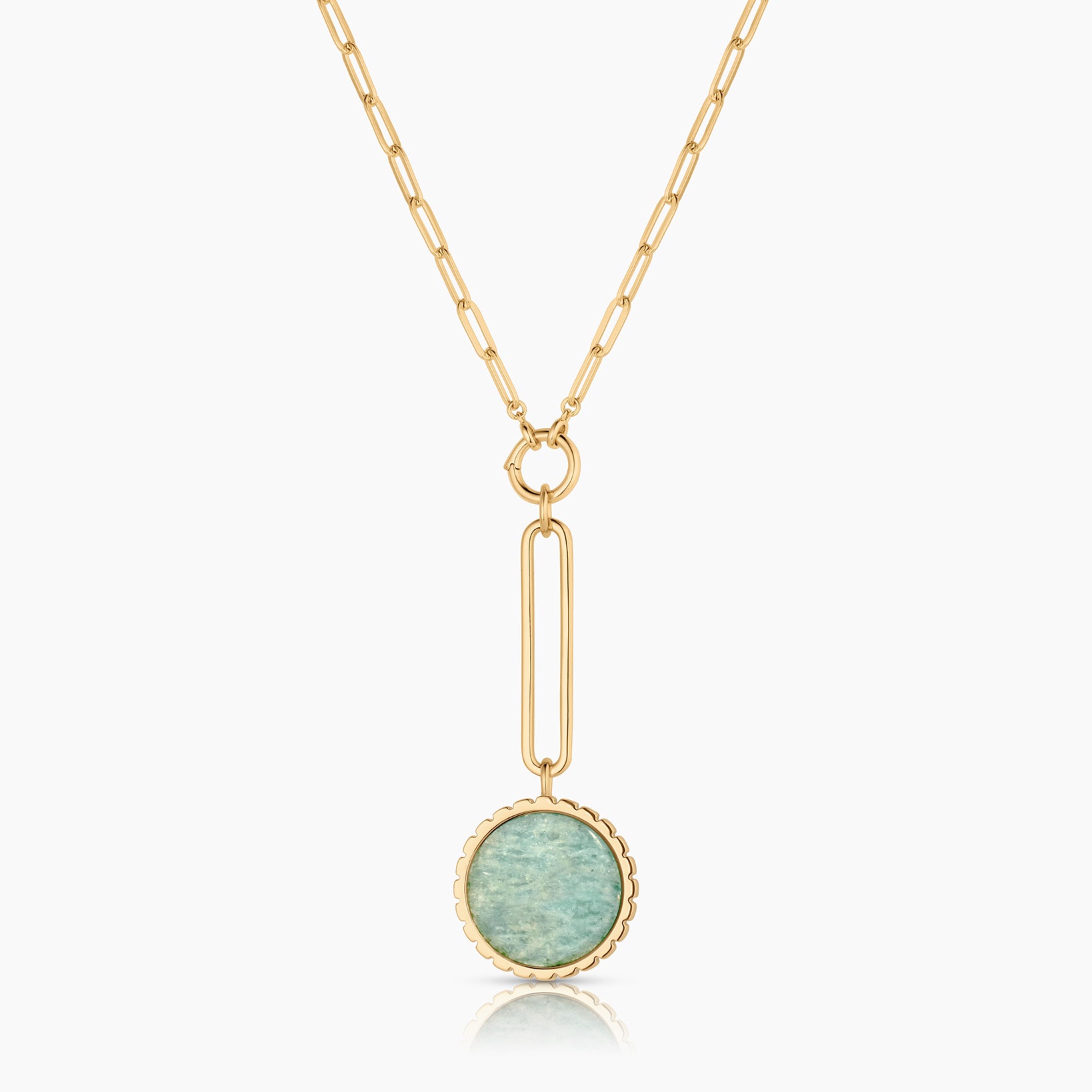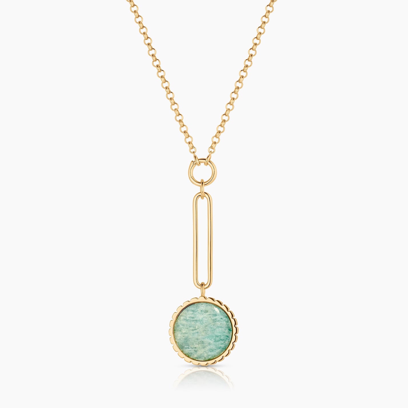 Embrace the beauty of our 100% natural gemstones with this exaggerated and modern drop charm made with hand-carved amazonite. Perfect for extra long chains, deep V-necks, and coastal getaways.