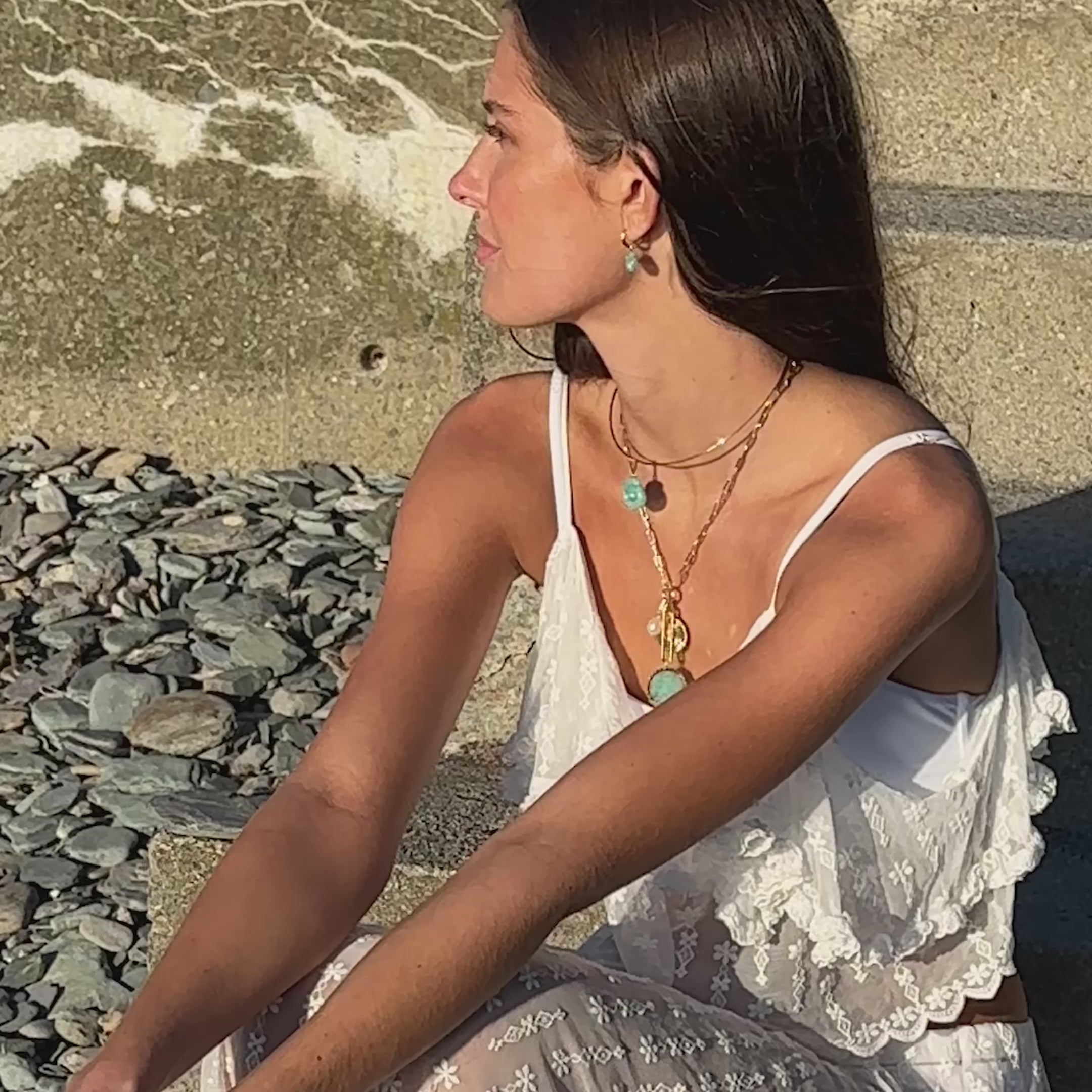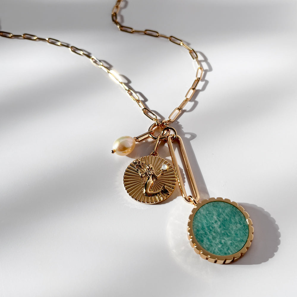 A mix of gemstone and wanderlust charms on our newest Finn Charm chain, featuring hand-carved amazonite and a freshwater pearl. Paradiso instantly adds playful dimension to every look. Charms are removable for ultimate transformability.