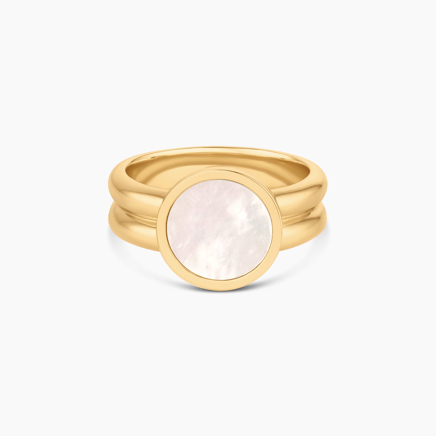 A bold double band meets 100% natural mother of pearl for the statement ring of your dreams.