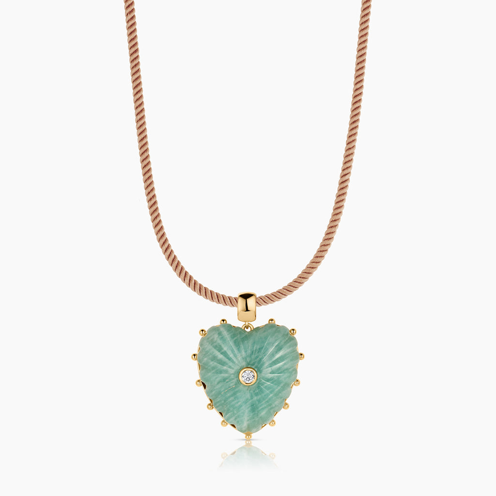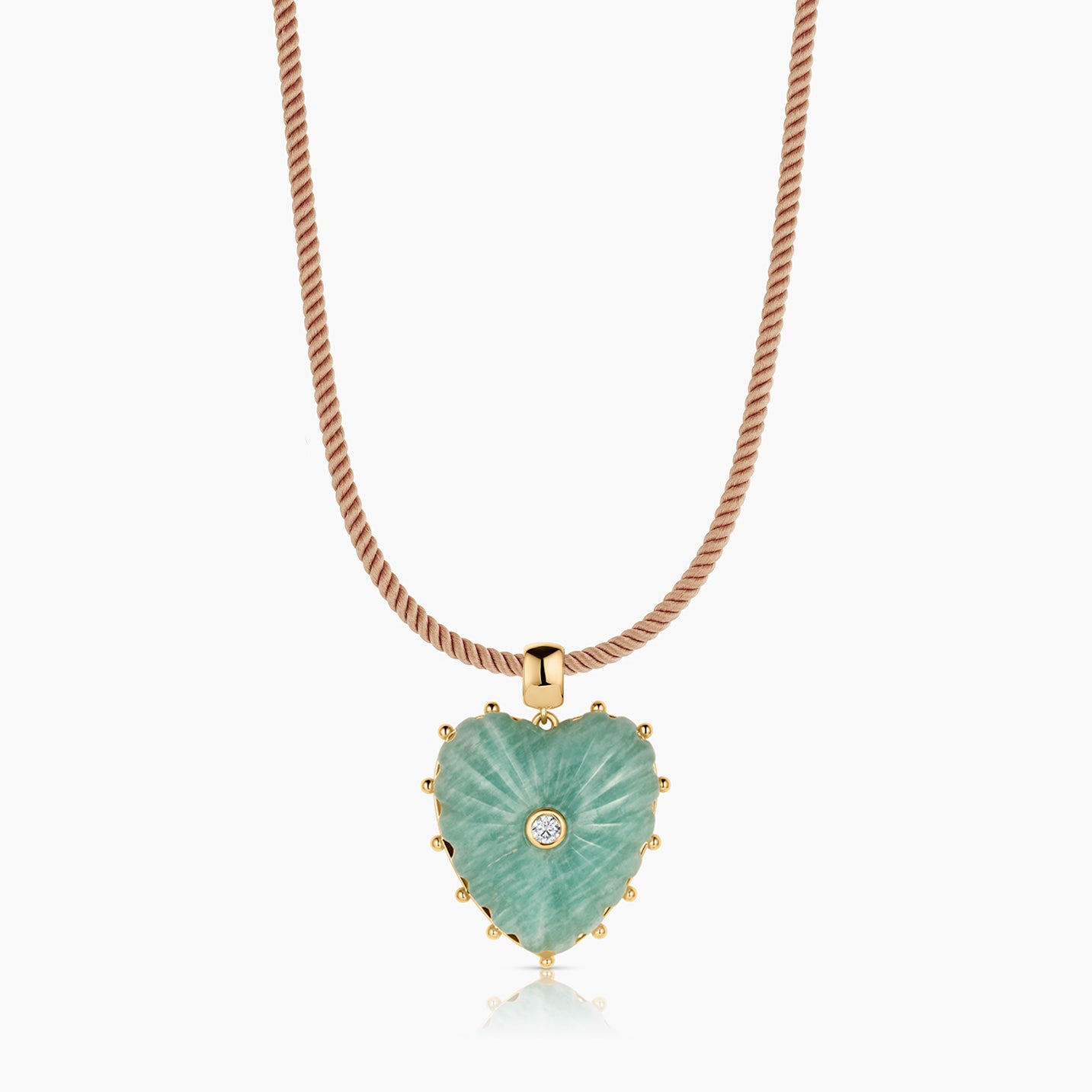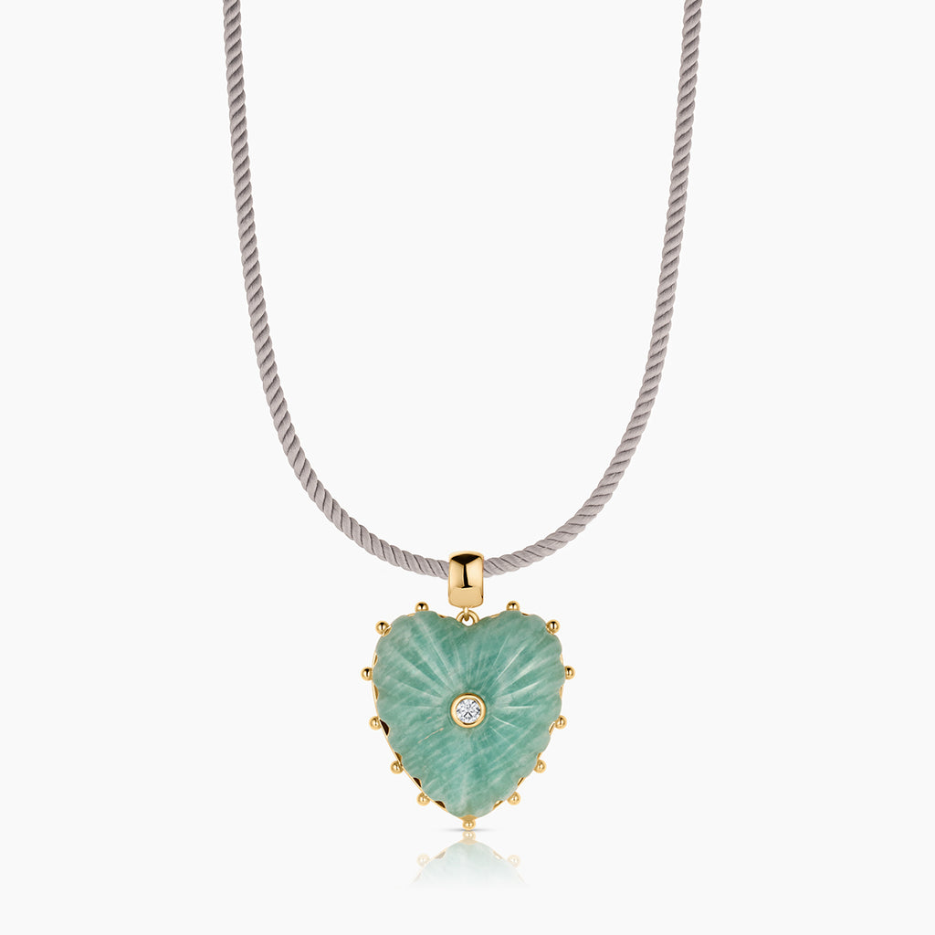 Your favorite hand-carved heart charm just got a gemstone upgrade—amazonite. This cool blue-green shade of amazonite is a favorite gemstone from our Resort Collection. Carved stone, cubic zirconia, and high-shine gold on our bail charm—everything you want and need in a charm.