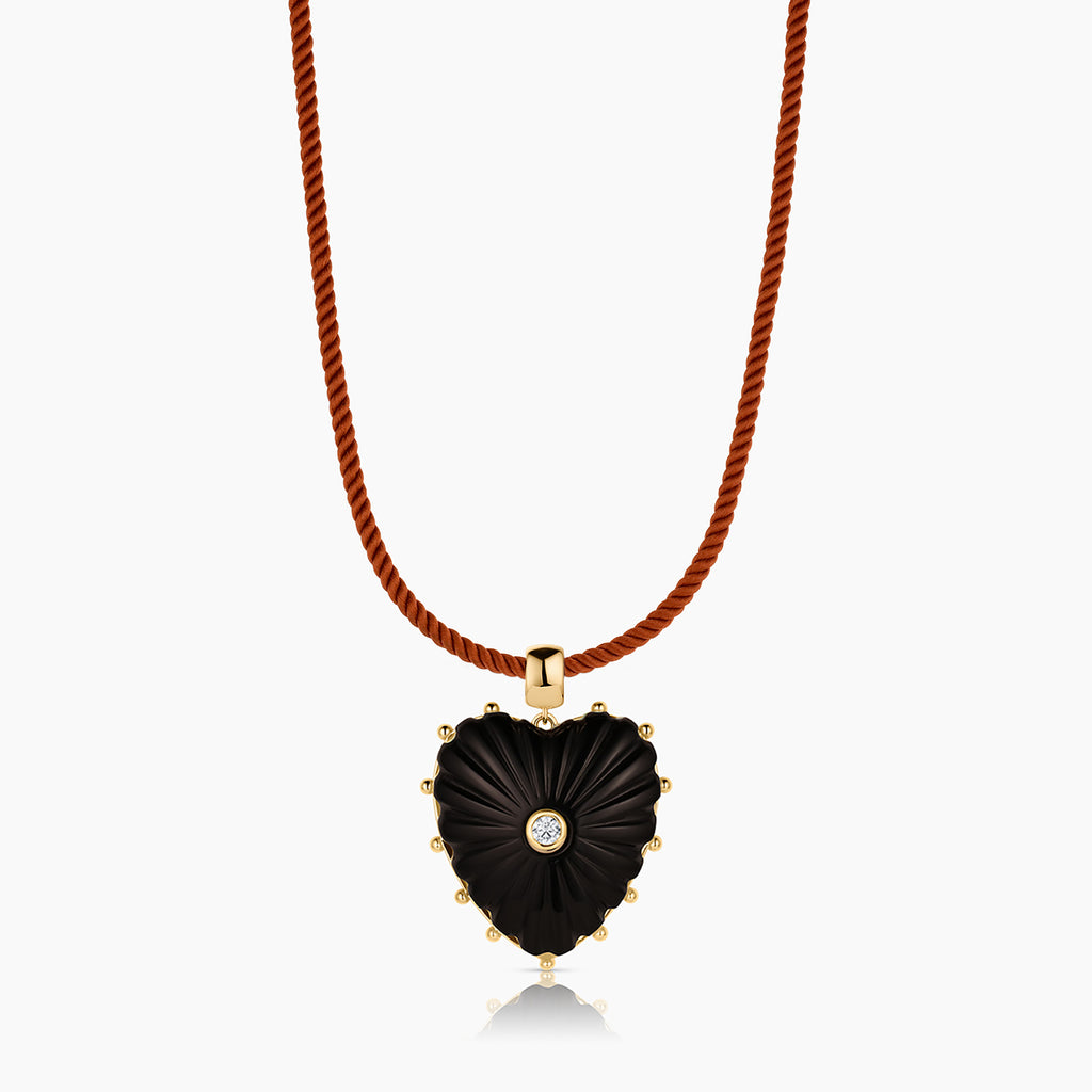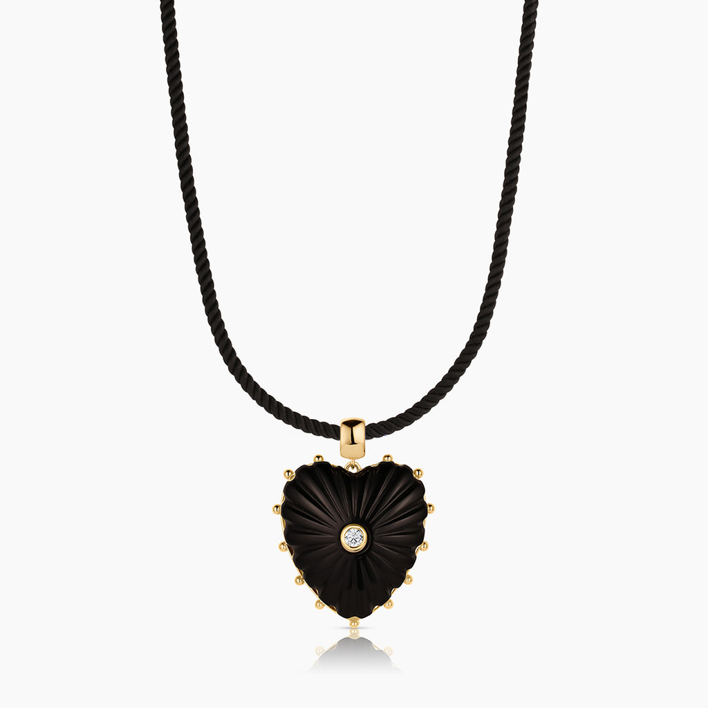 Our Malene heart charm in rich onyx—hand-carved stone, cubic zirconia, and high-shine gold on a large round bail for versatility. Everything you want and need in a statement necklace.