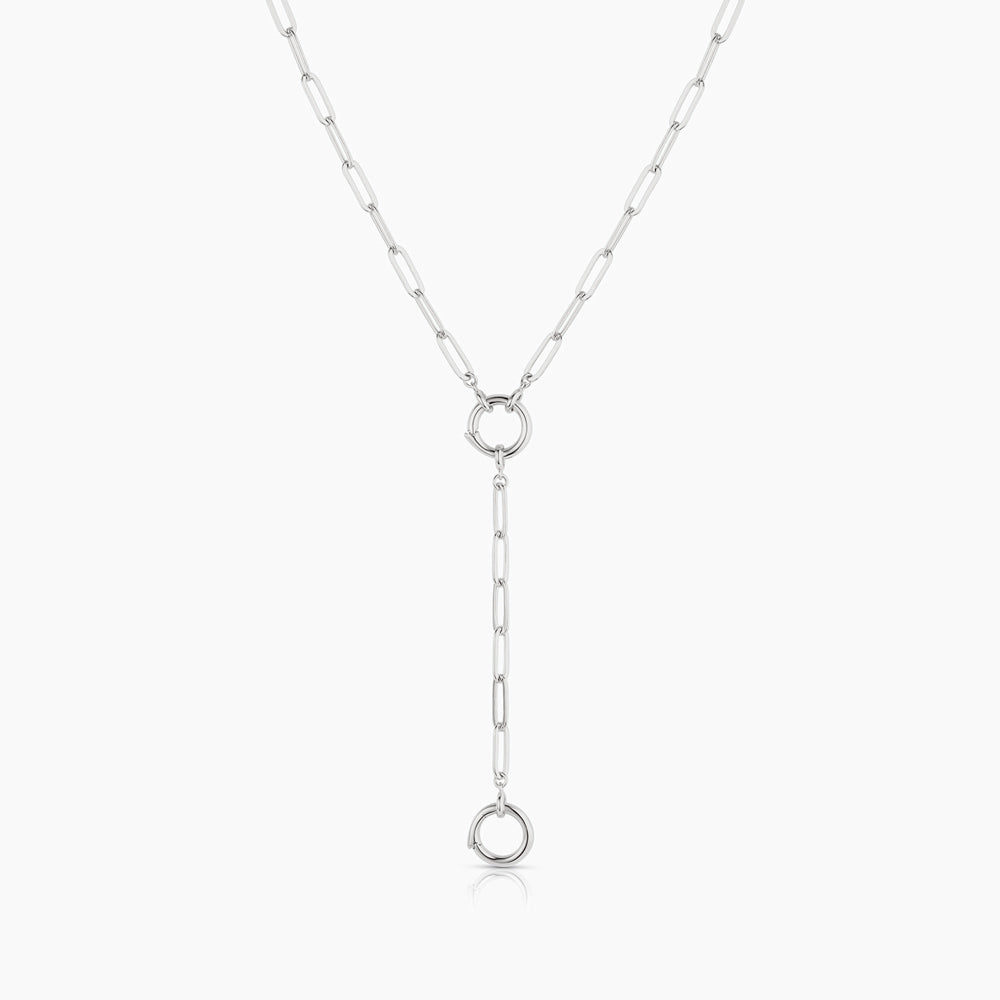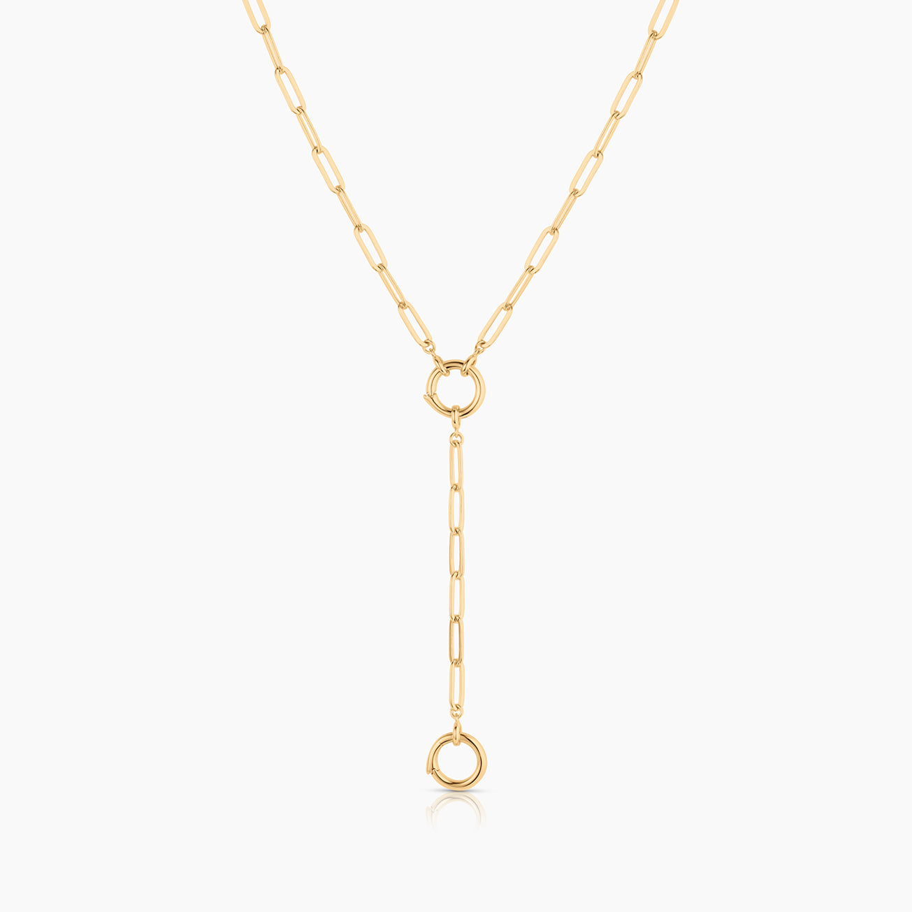 Made for play, this paperclip necklace chain offers endless possibilities with two charm clasps and a removable lariat extender. Layer patterned gemstone hearts into a mix of pearls and beads. Cluster fish charms, shells, and golden coins together for a playful take on the sea. A necklace to make completely your own.