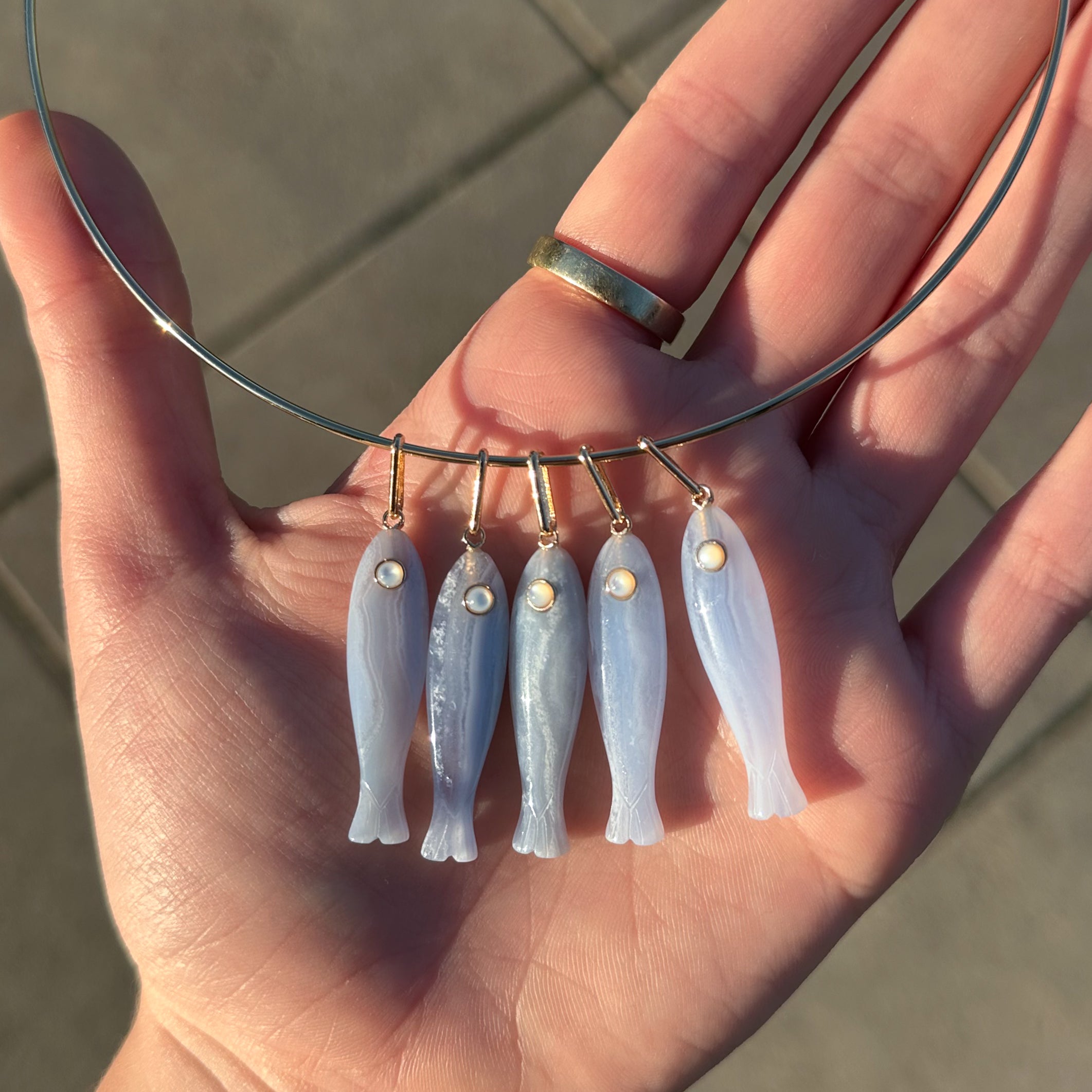 She's a best seller for a reason. Our new favorite hand-carved gemstone fish charm has quickly become the must-have charm of the season. This blue lace fish (with a mother of pearl eye!) can be worn alone on our Monet Choker or necklace chains, or layered with your other favorite charms. Our Fortuna isn't just a cute charm, it's a little amulet for good fortune and luck.