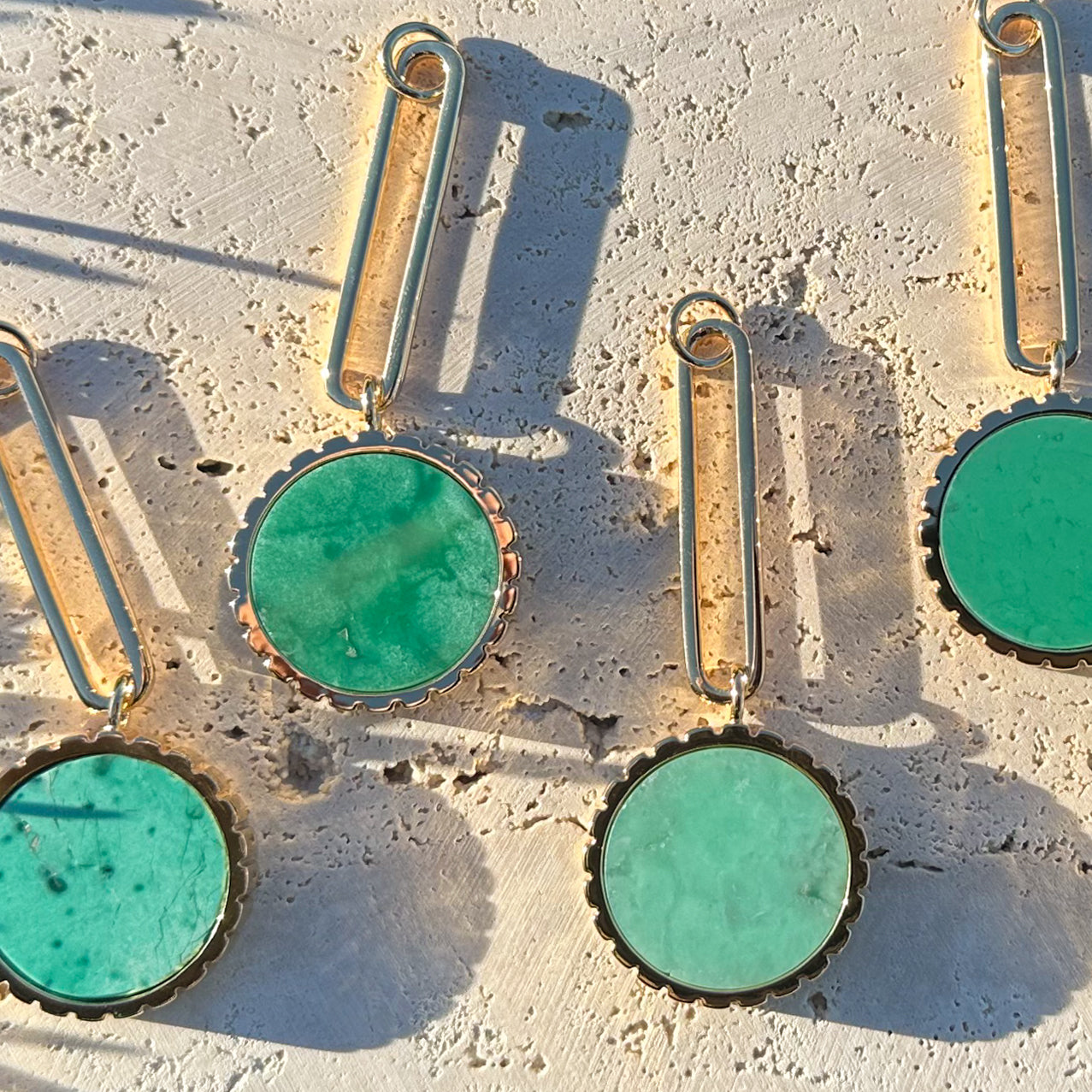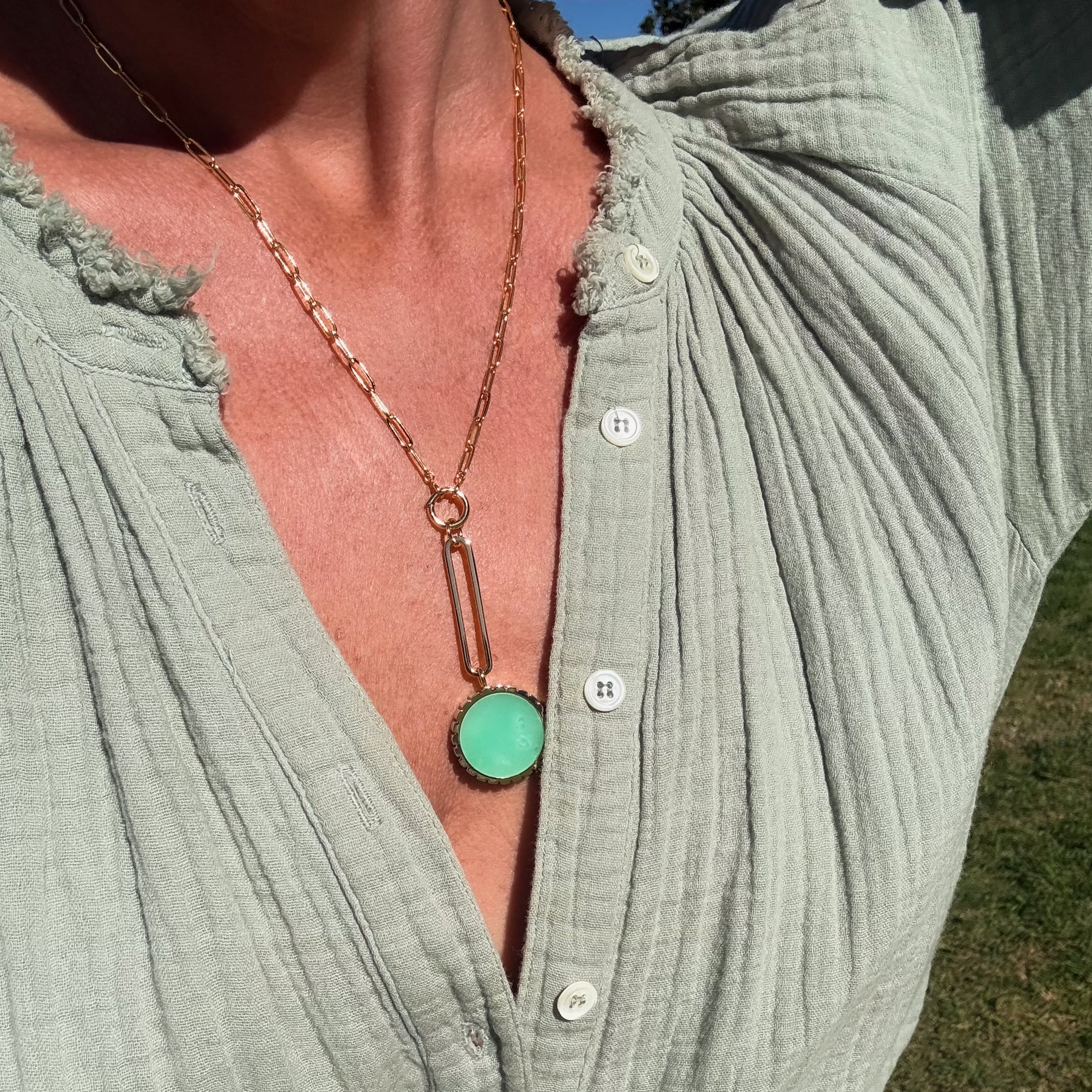 Embrace the beauty of our 100% natural gemstones with this exaggerated and modern drop charm made with hand-carved chrysoprase. Perfect for extra long chains, deep V-necks, and coastal getaways.
