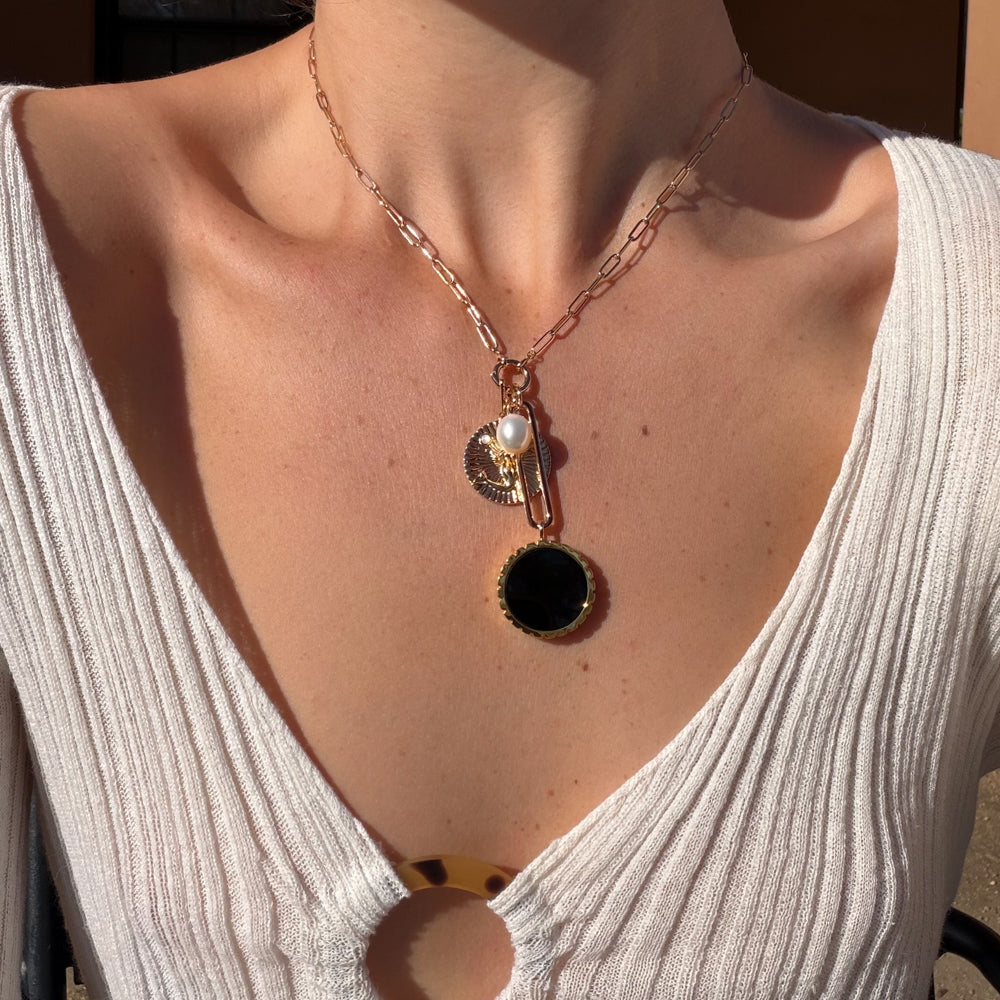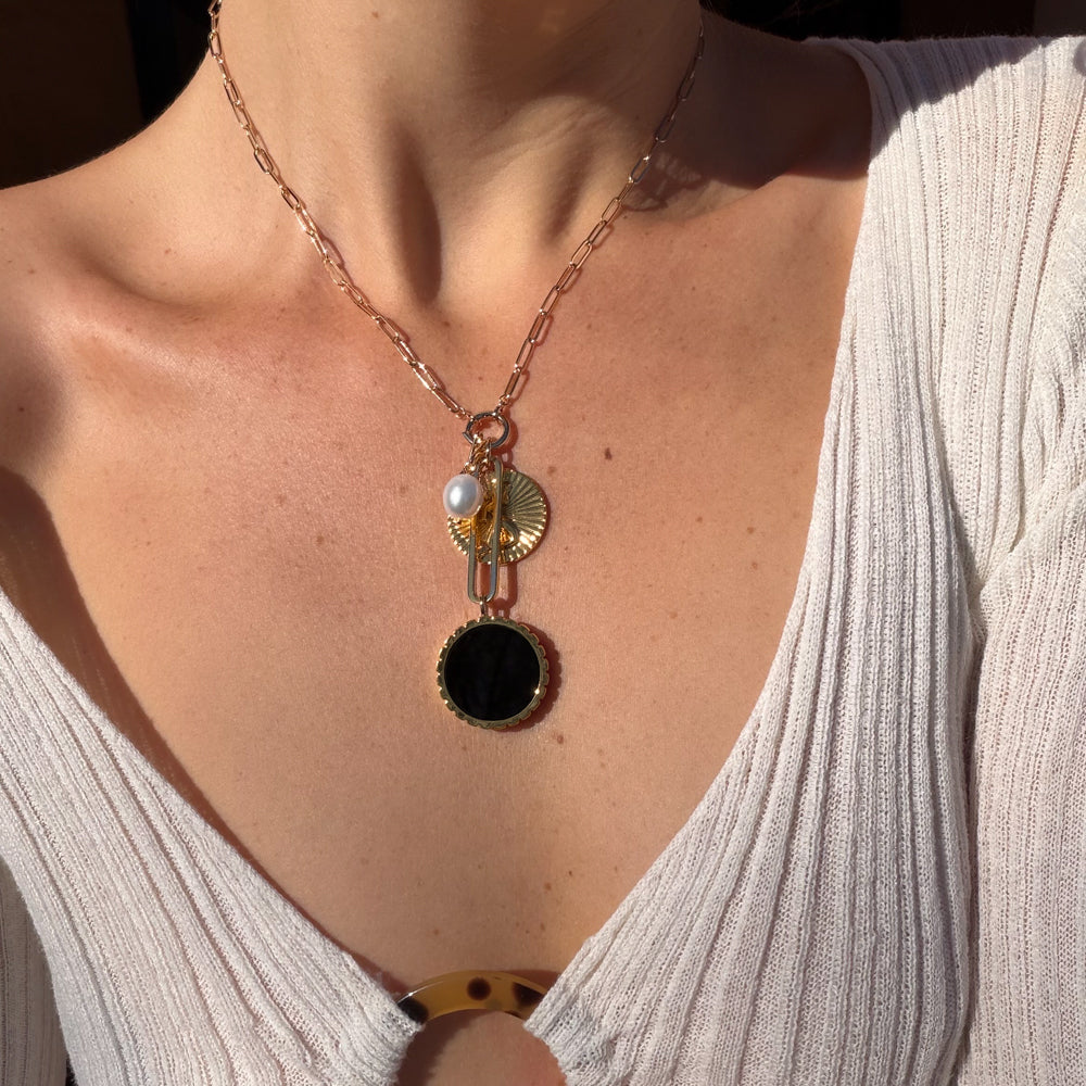 A mix of gemstone and wanderlust charms on our newest Finn Charm chain, featuring hand-carved onyx and a freshwater pearl. Paradiso instantly adds playful dimension to every look. Charms are removable for ultimate transformability.