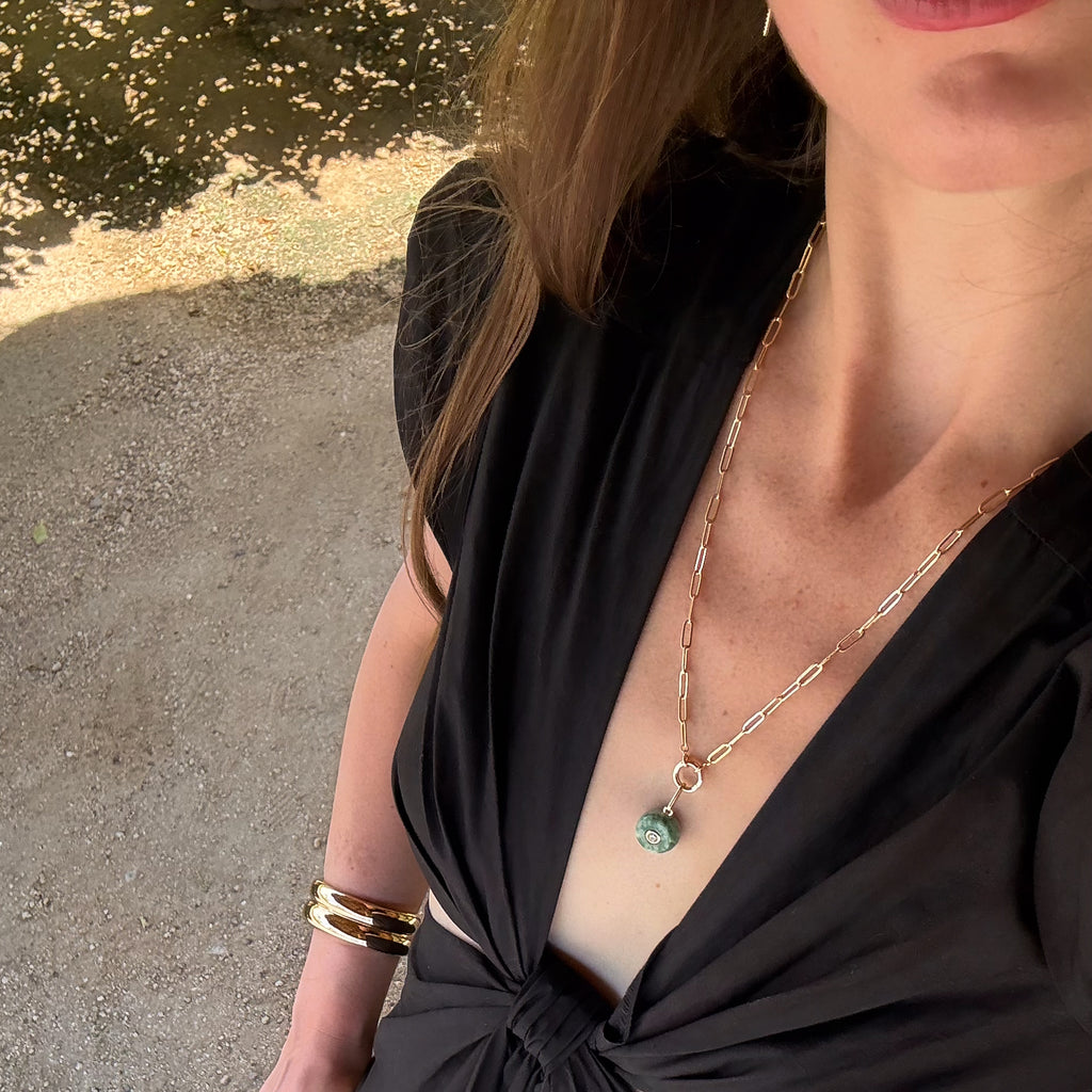Materials: 14k gold plated, hand-carved green dot, cubic zirconia