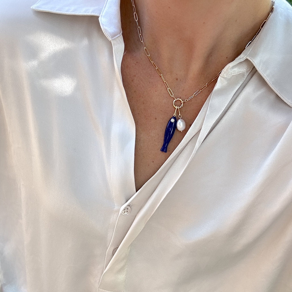 A combination so winning, you'll be grabbing this for the everyday and your weekend escapes alike. Our best selling hand-carved gemstone fish charm paired with a pretty little freshwater pearl. The duo of the season.