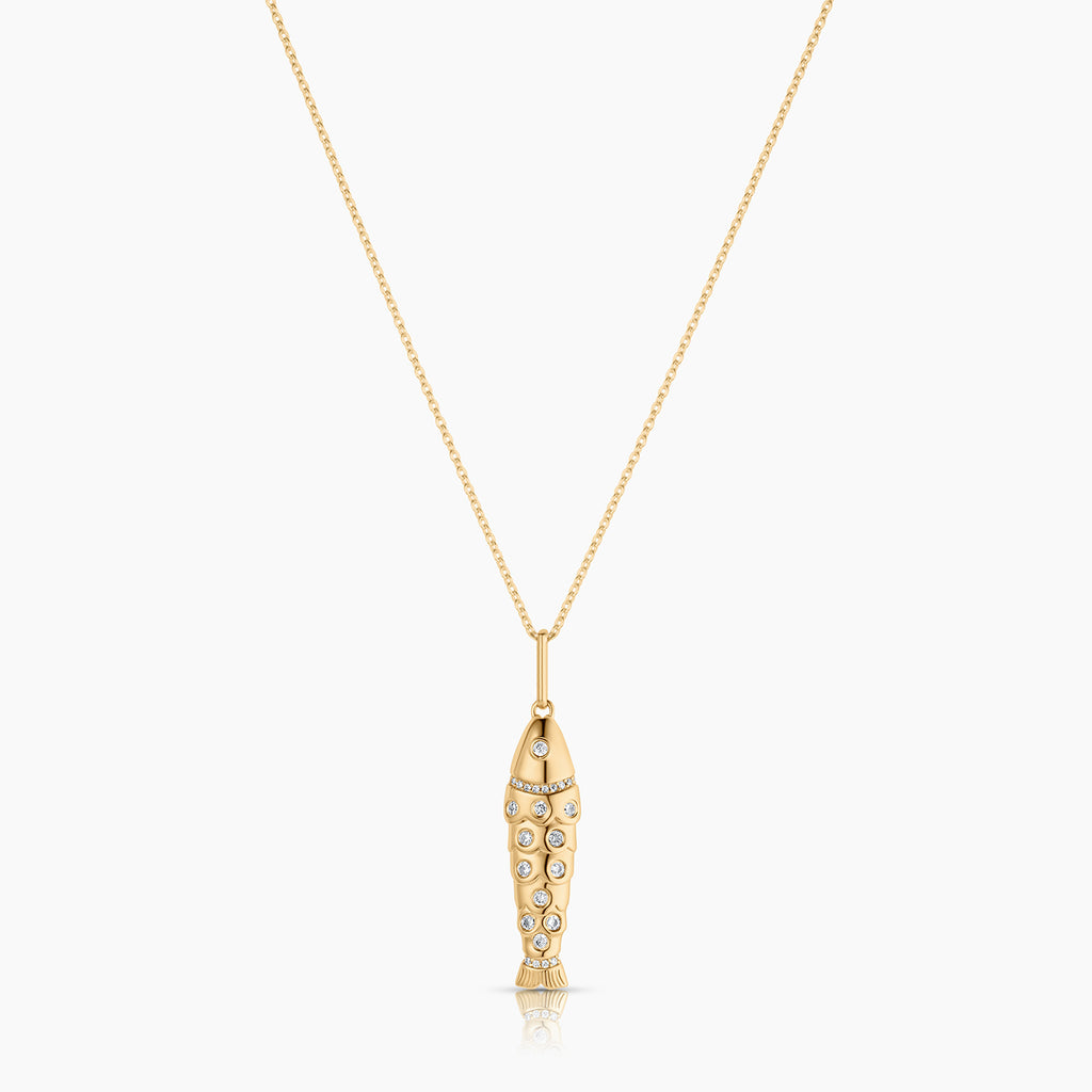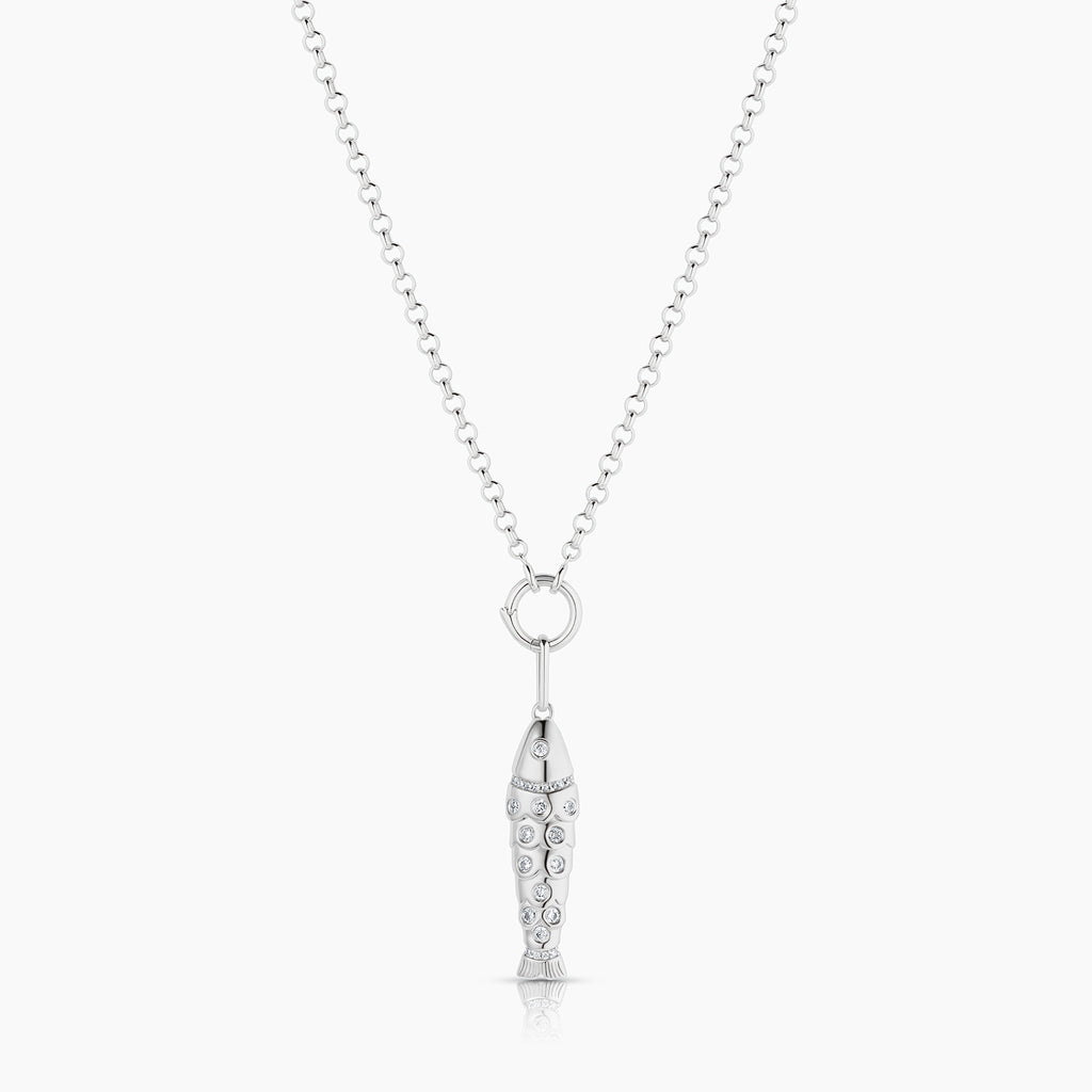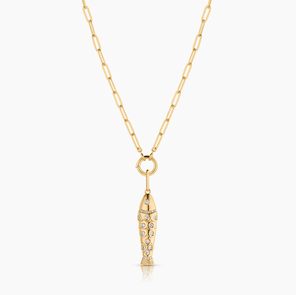 An all-metal fish charm enveloped in glittering scales and fine details. She blends seamlessly into a mix of beads and CZ charms, or layered into a nautical neck stack. Textured, sparkly, and everything you ever dreamed of.