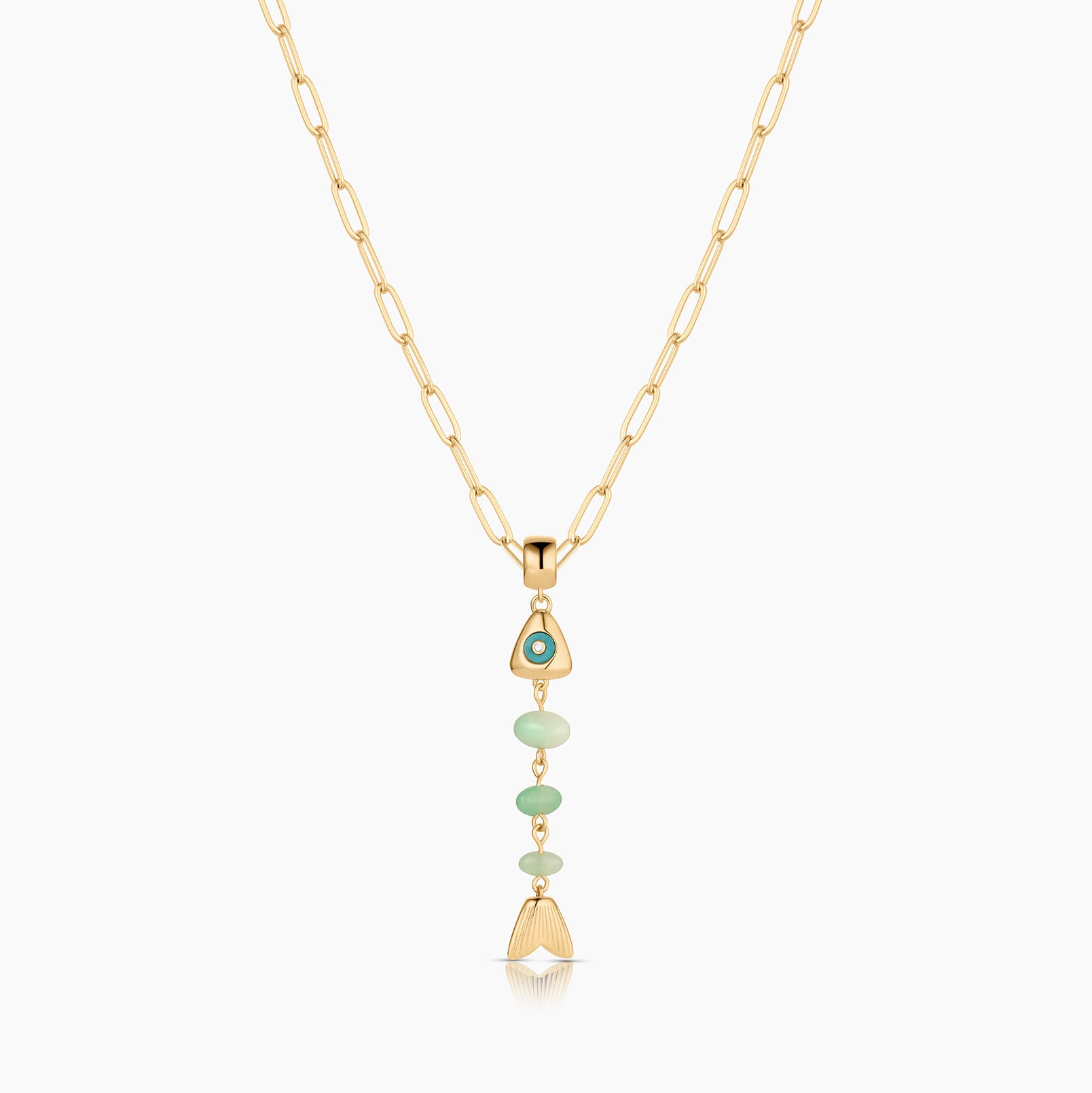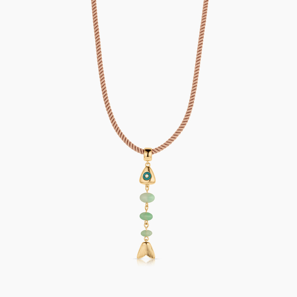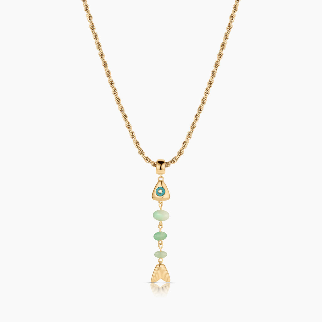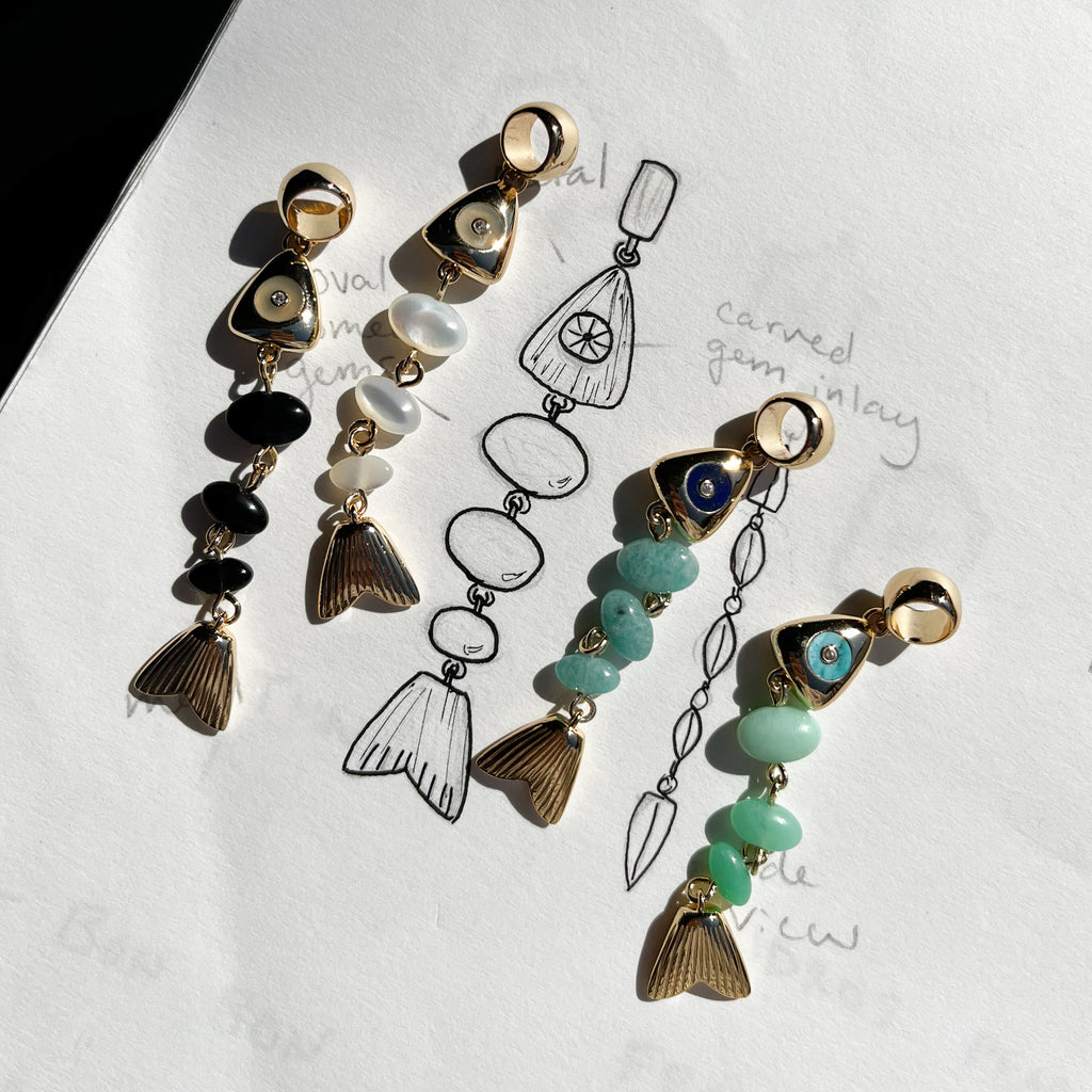 This skeletal fish charm is unlike any you've seen before. A fish bone-inspired silhouette created with hand-carved drop gemstones and a contrasting gemstone eye, complete with CZ sparkle. This delicate beauty adds movement and sparkle, and has become our new favorite treasure from our jewelry box.