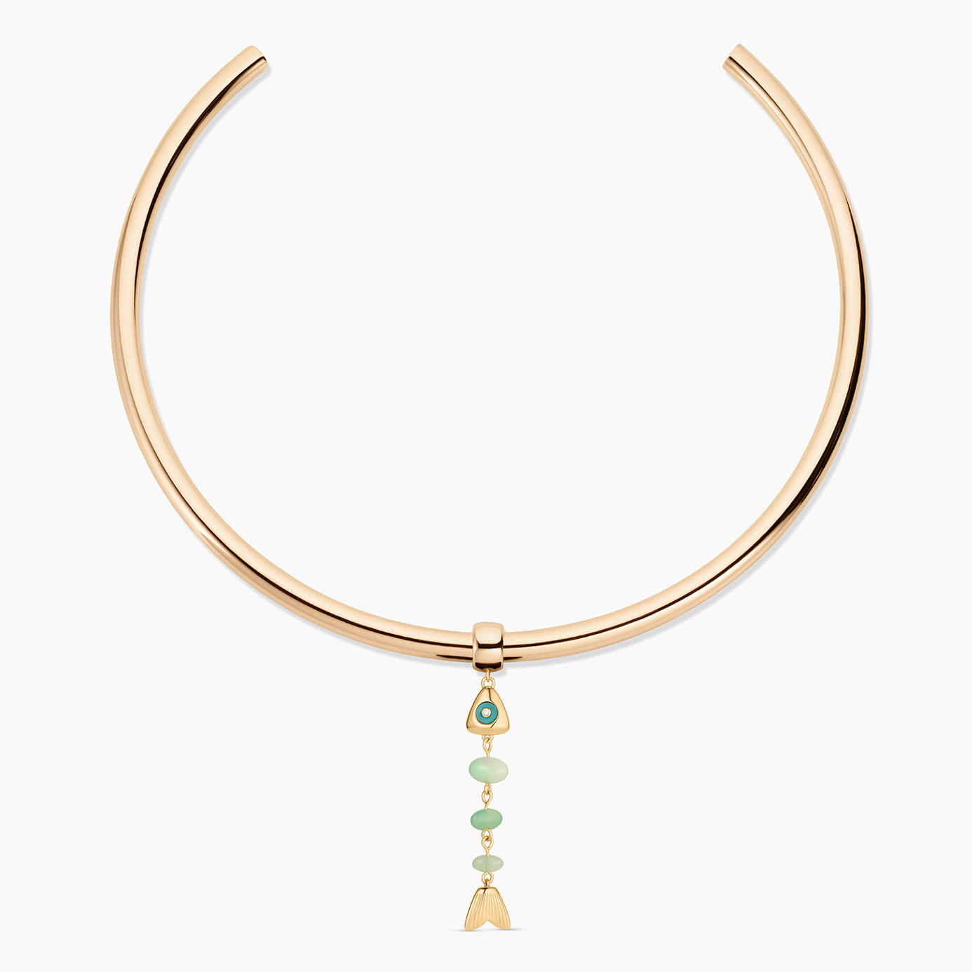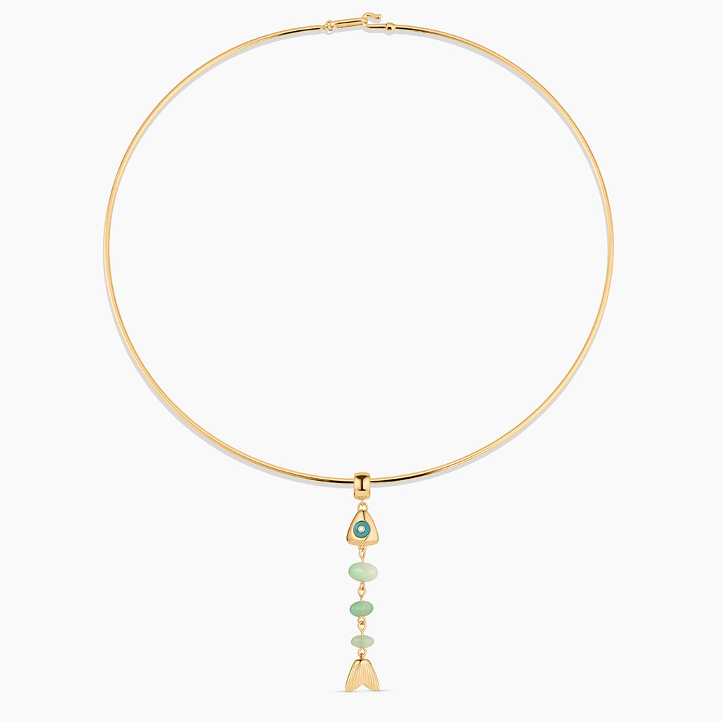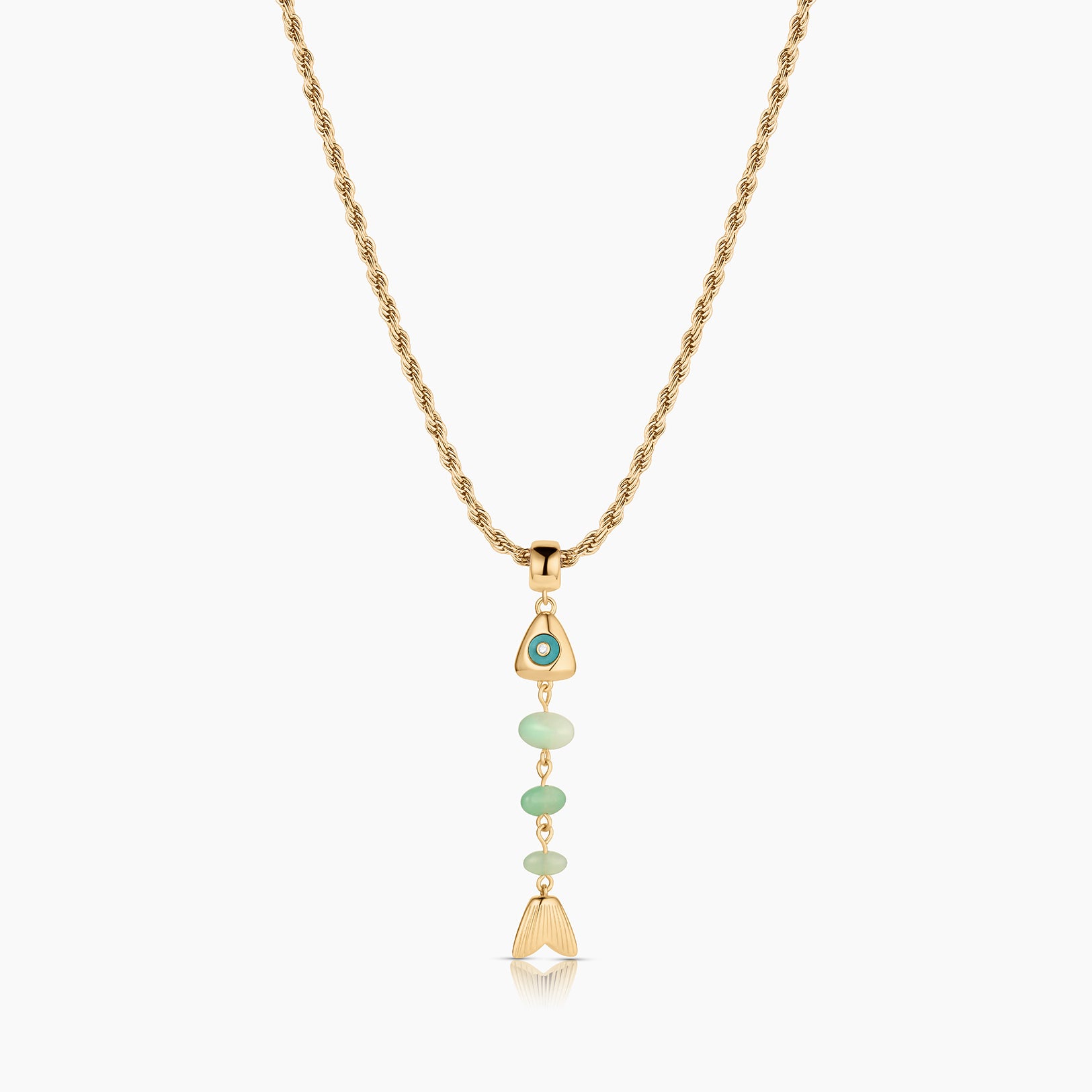 This skeletal fish charm is unlike any you've seen before. A fish bone-inspired silhouette created with hand-carved drop gemstones and a contrasting gemstone eye, complete with CZ sparkle. This delicate beauty adds movement and sparkle, and has become our new favorite treasure from our jewelry box.