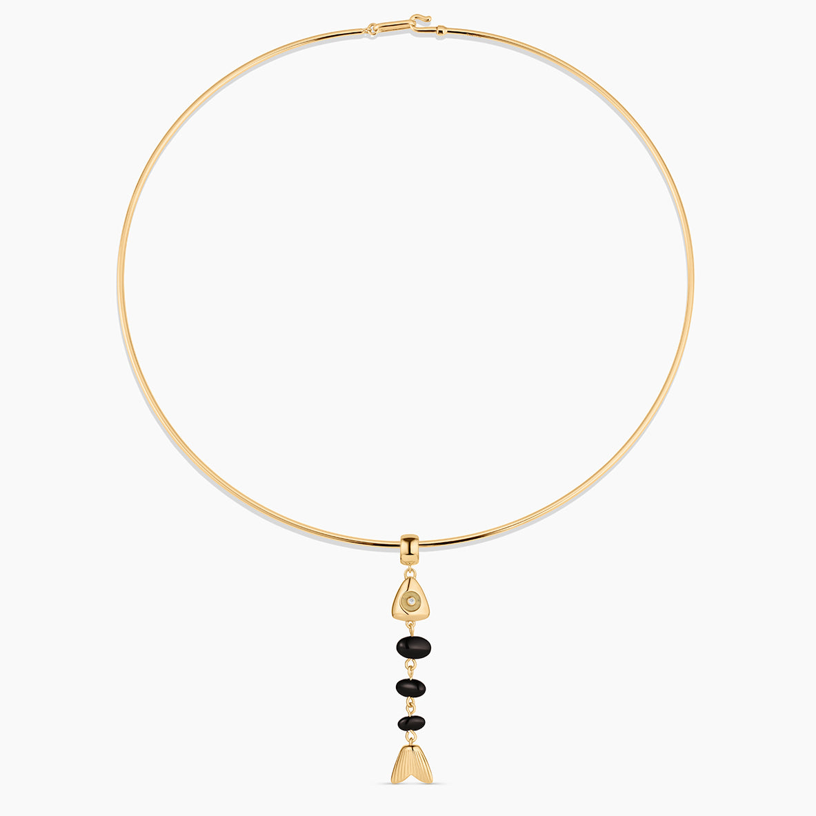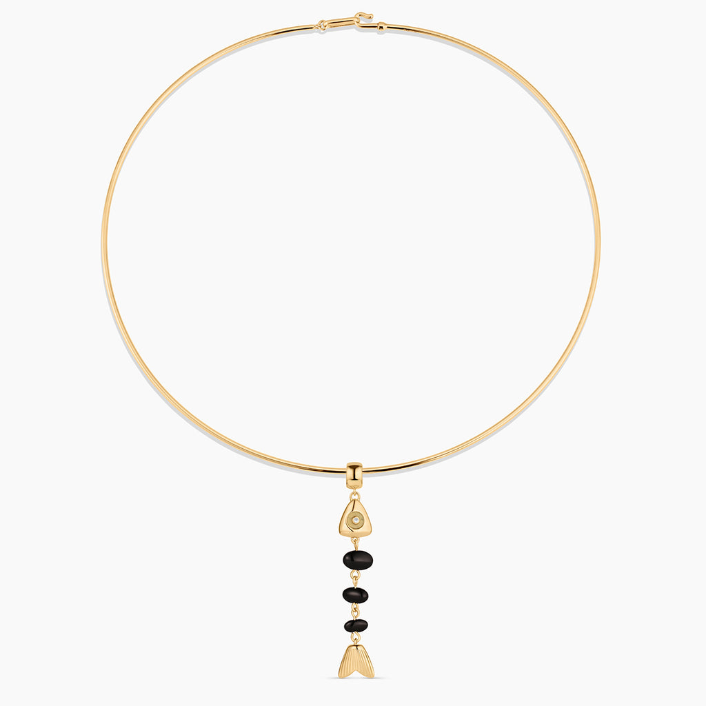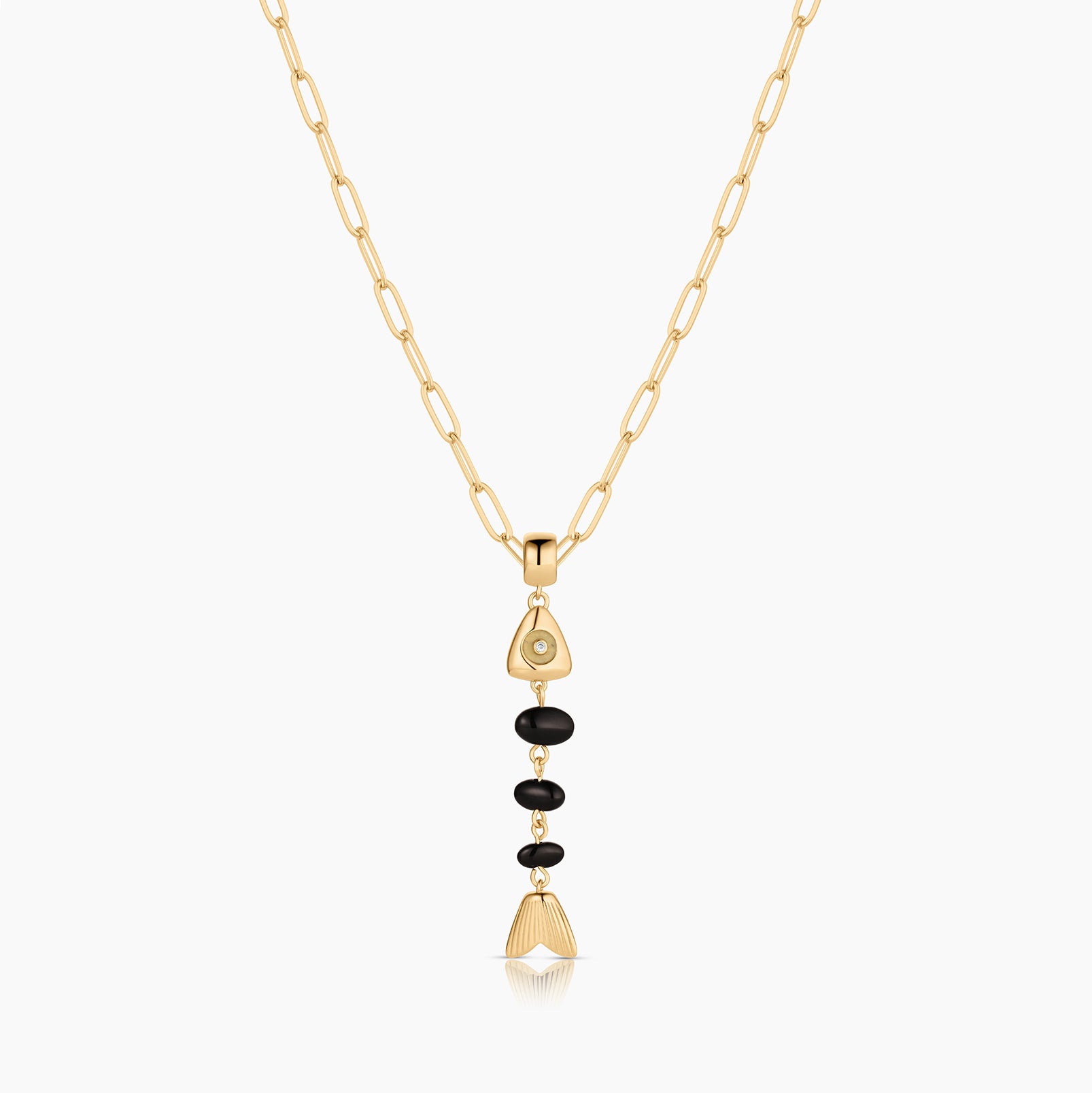 This skeletal fish charm is unlike any you've seen before. A fish bone-inspired silhouette created with hand-carved drop gemstones and a contrasting gemstone eye, complete with CZ sparkle. This delicate beauty adds movement and sparkle, and has become our new favorite treasure from our jewelry box.