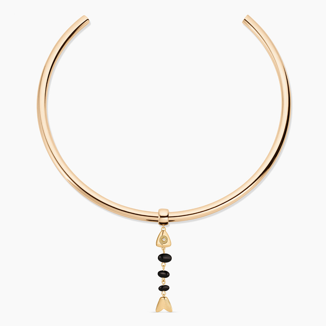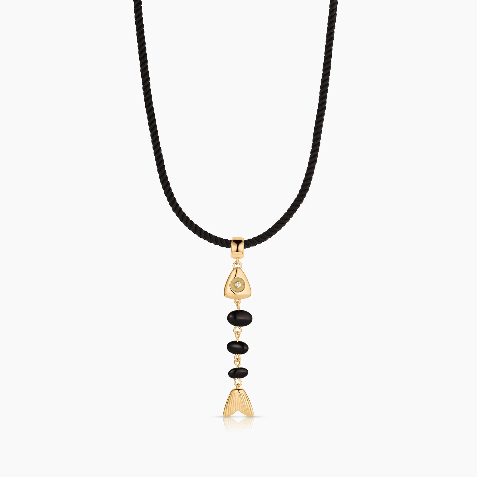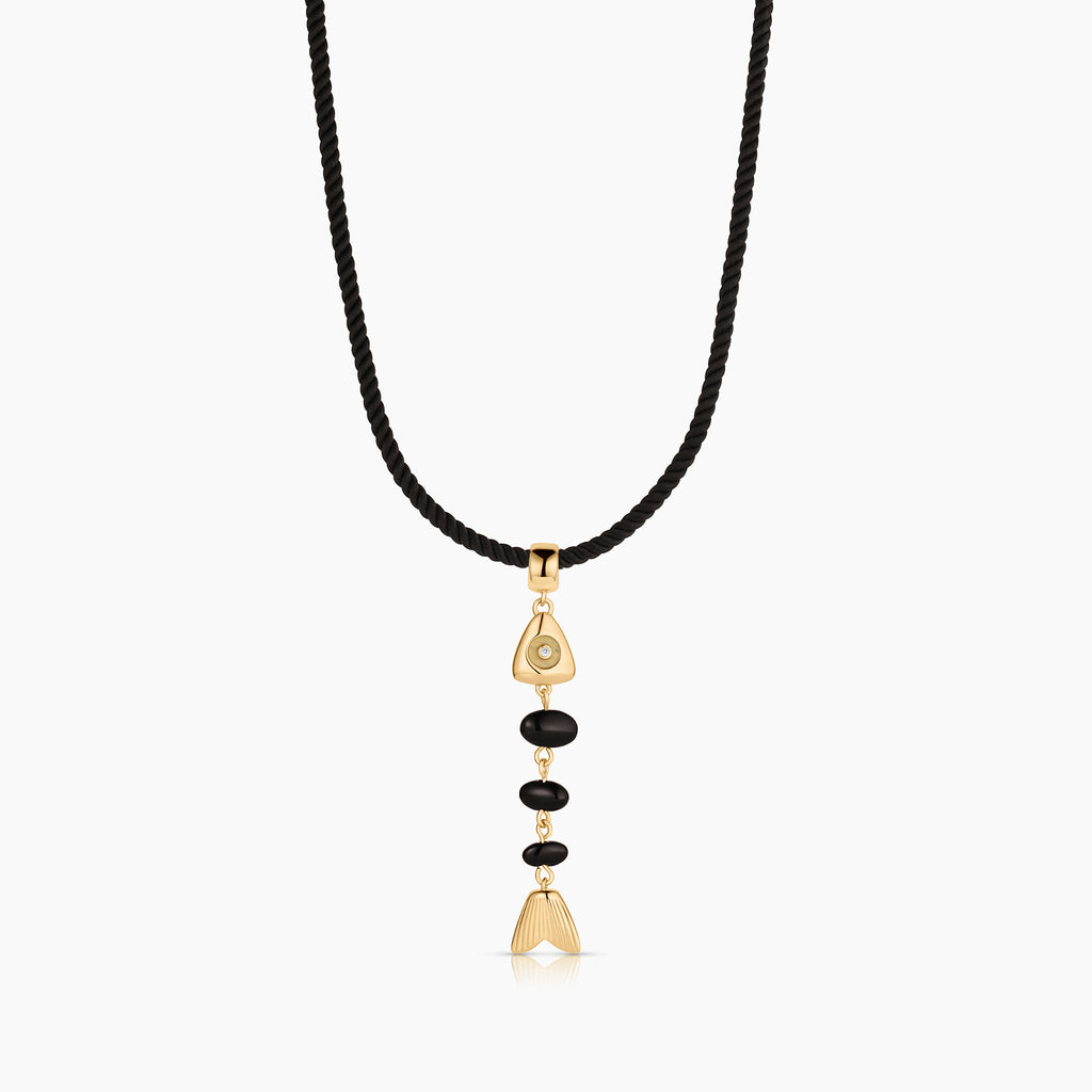This skeletal fish charm is unlike any you've seen before. A fish bone-inspired silhouette created with hand-carved drop gemstones and a contrasting gemstone eye, complete with CZ sparkle. This delicate beauty adds movement and sparkle, and has become our new favorite treasure from our jewelry box.