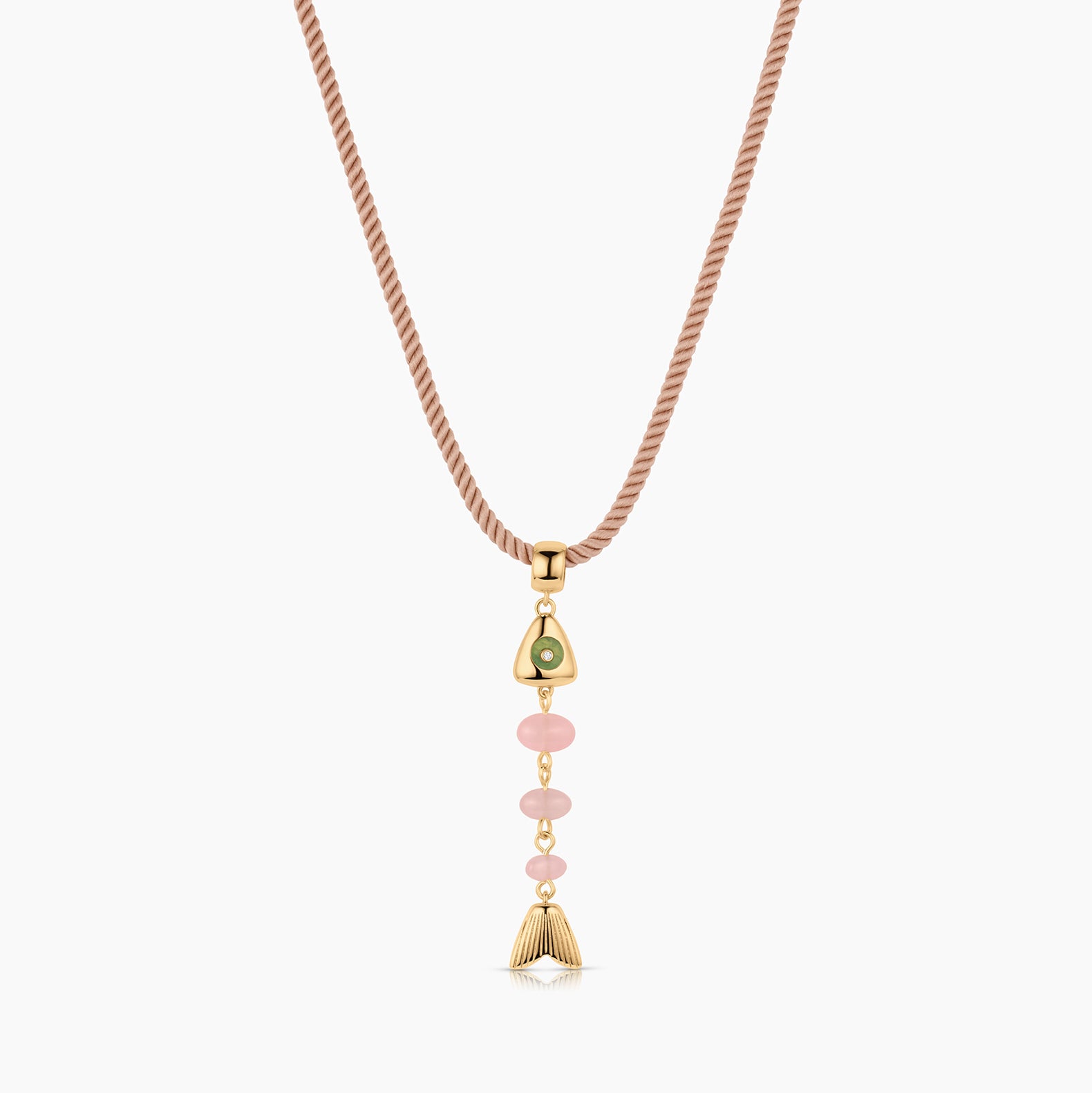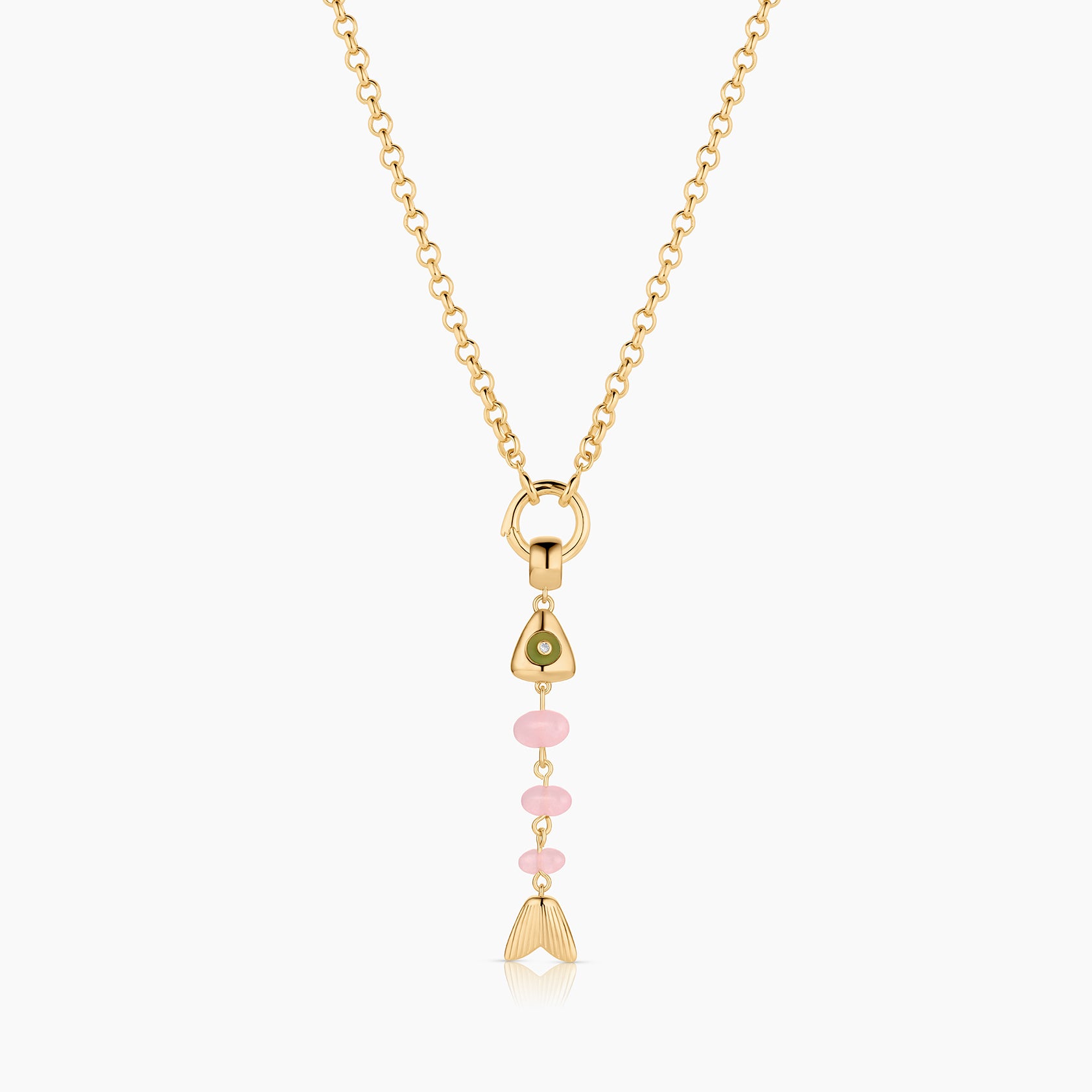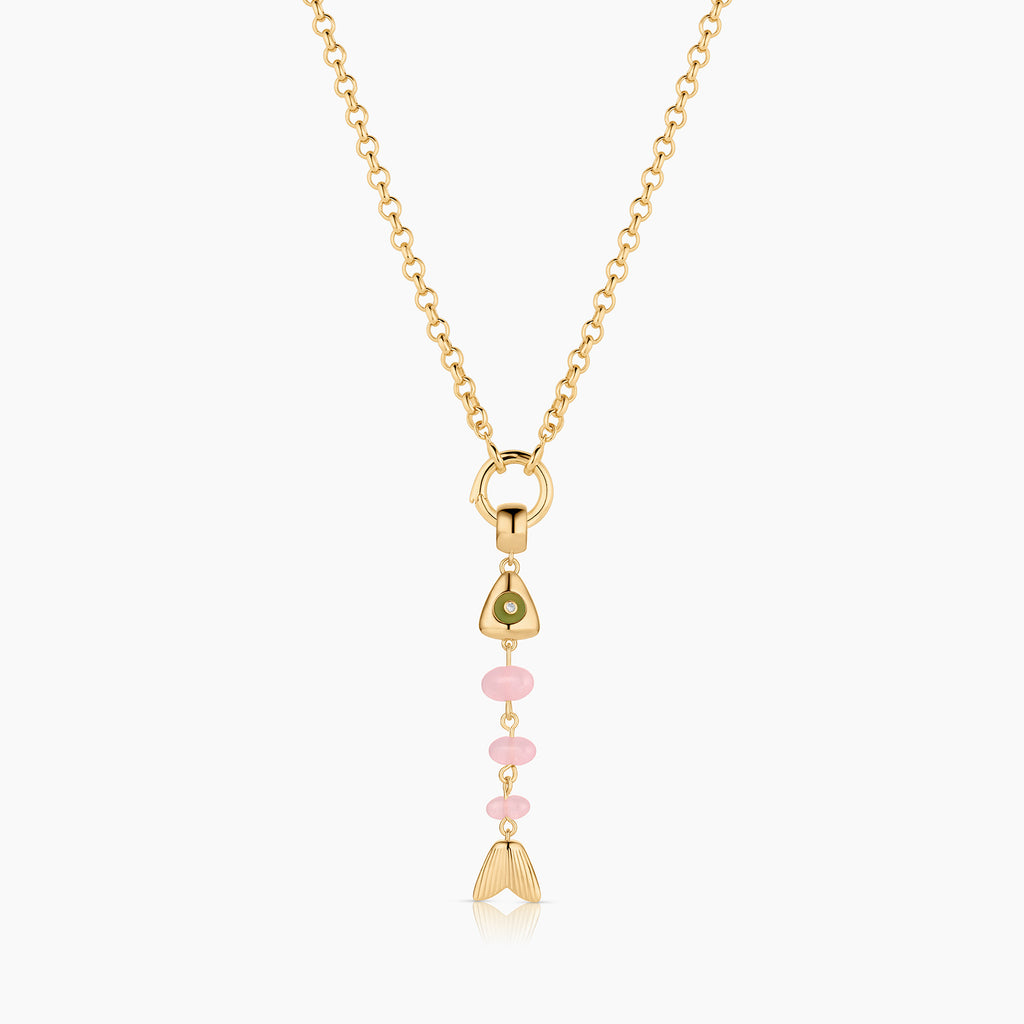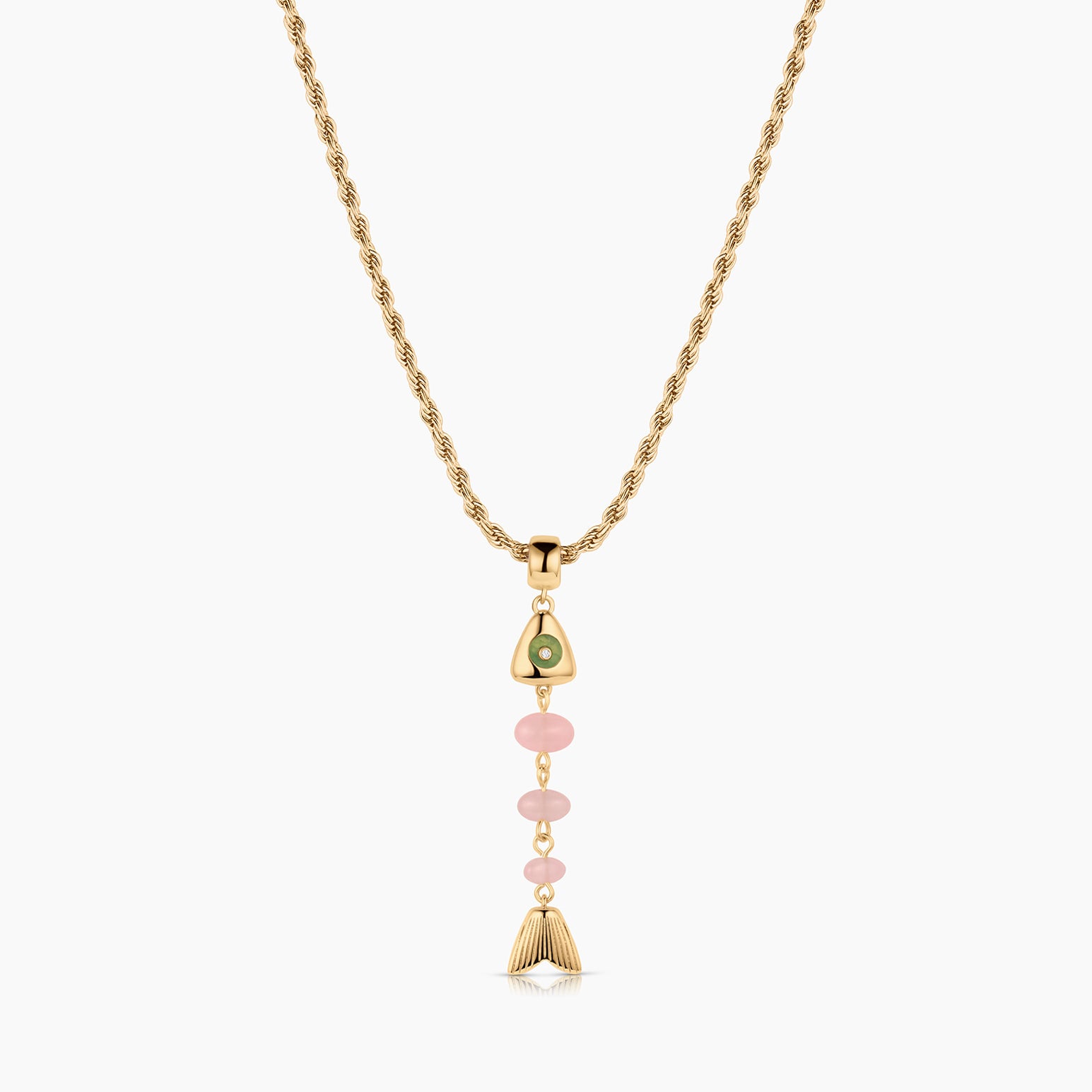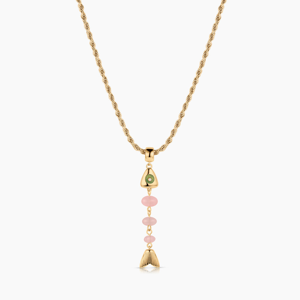 Materials: 14k gold plated, hand-carved pink jade with a chrysoprase eye, cubic zirconia