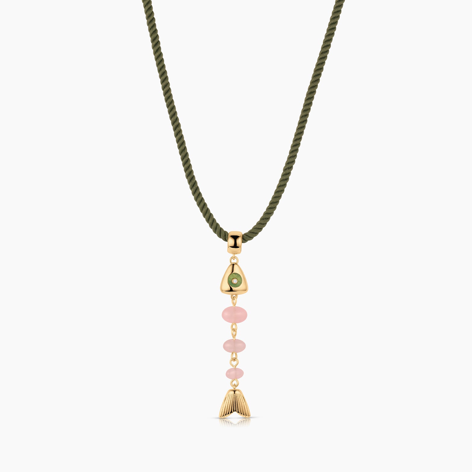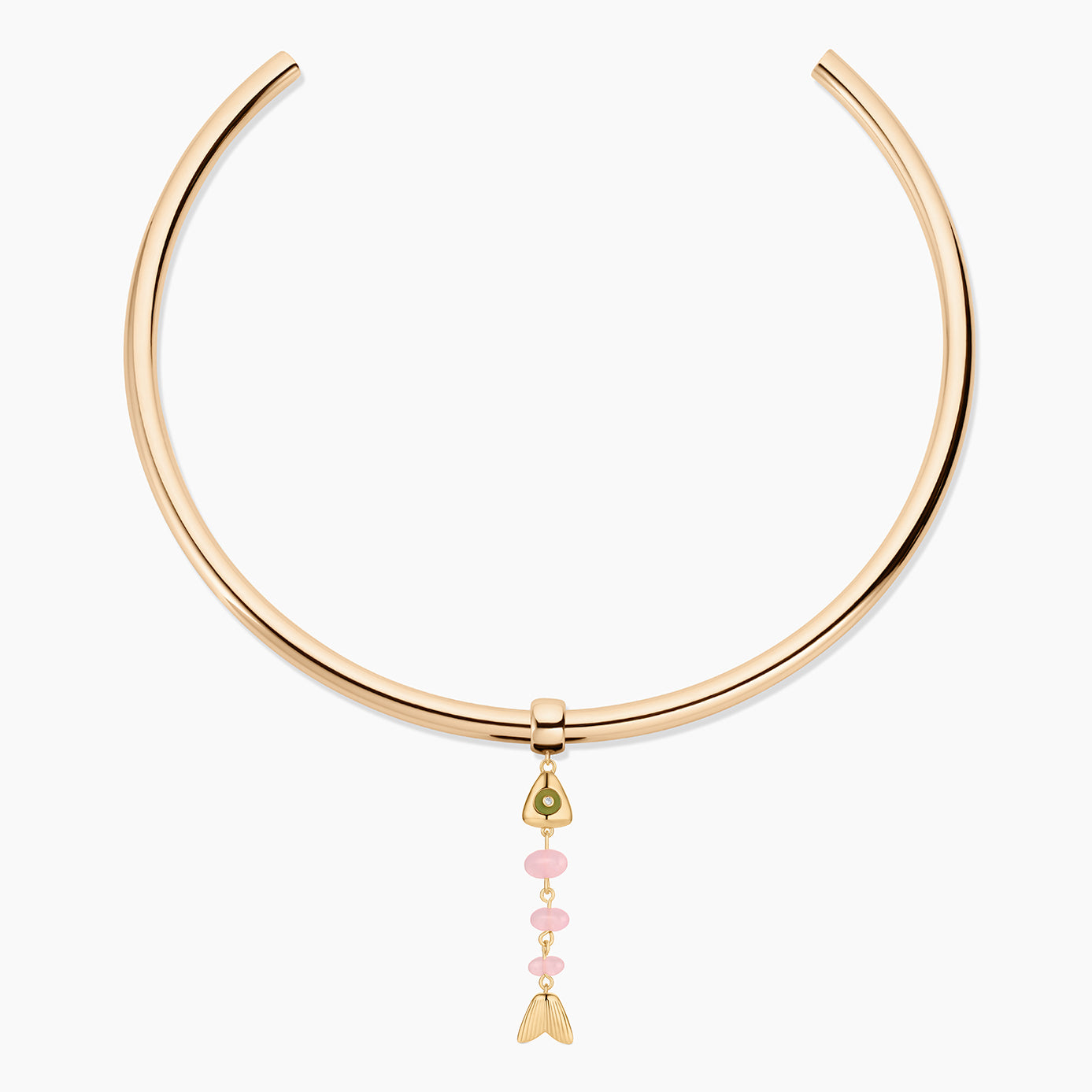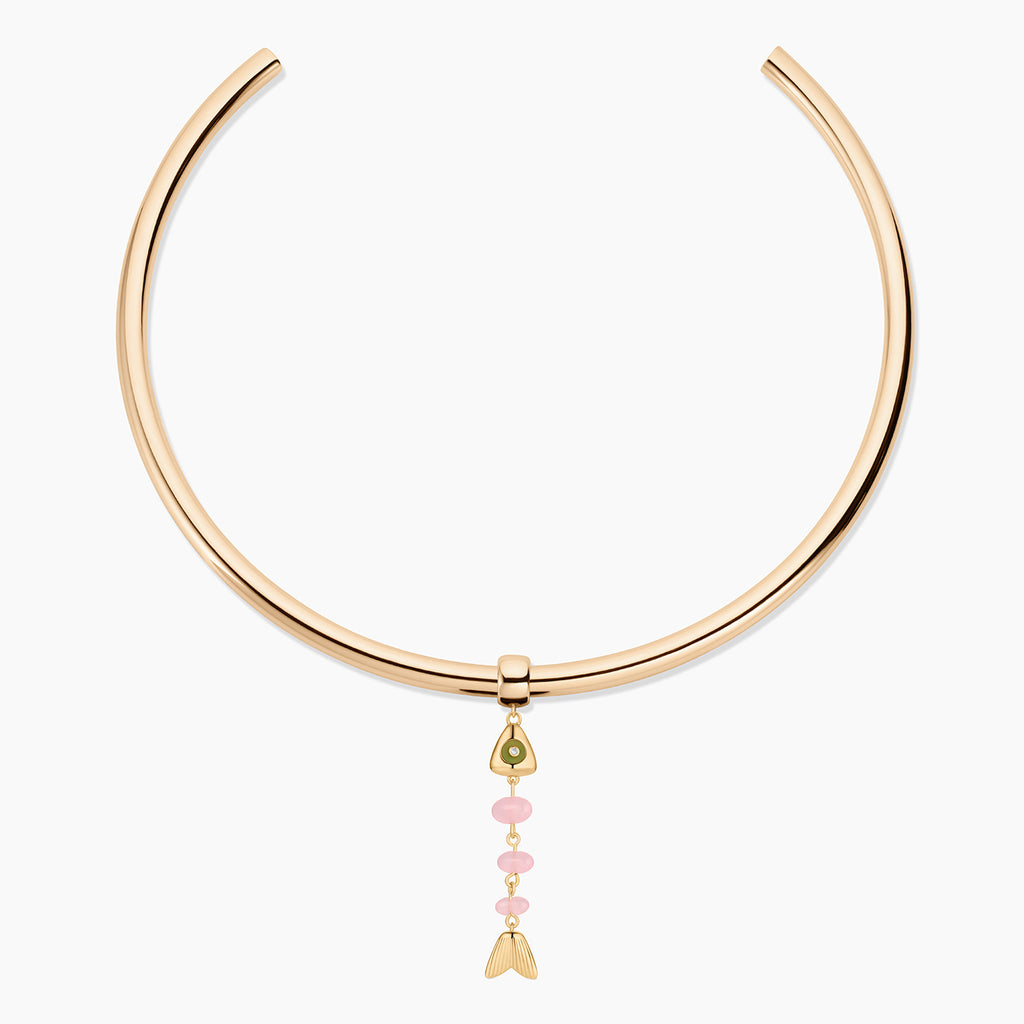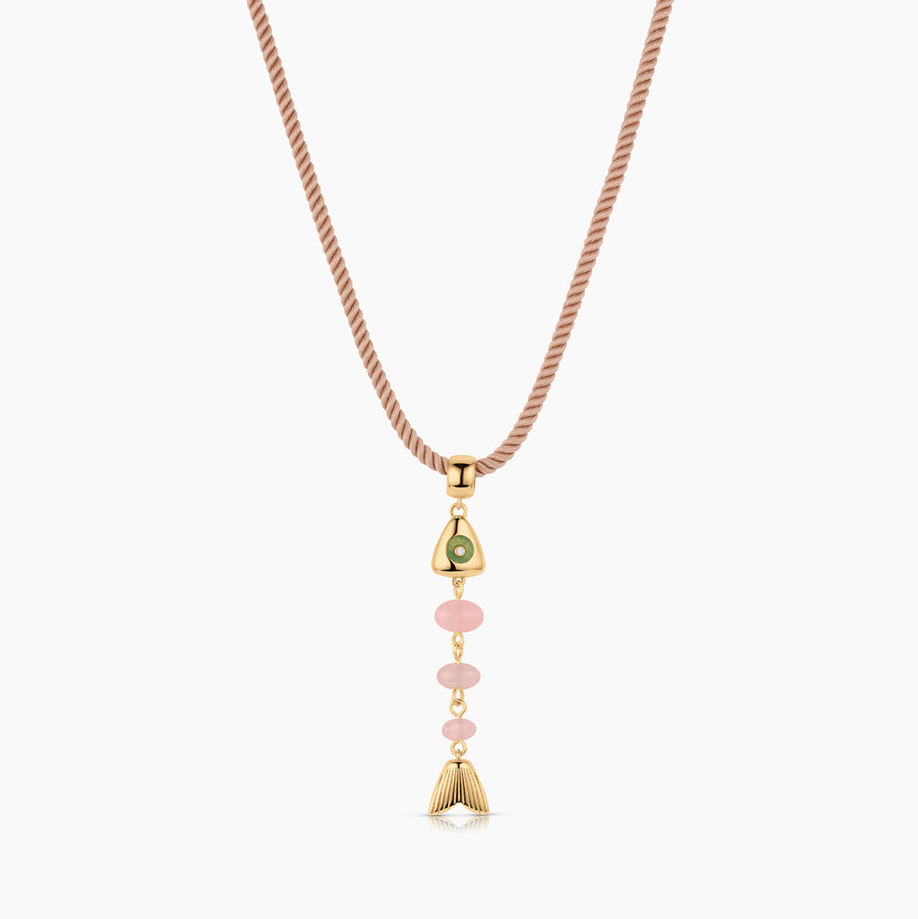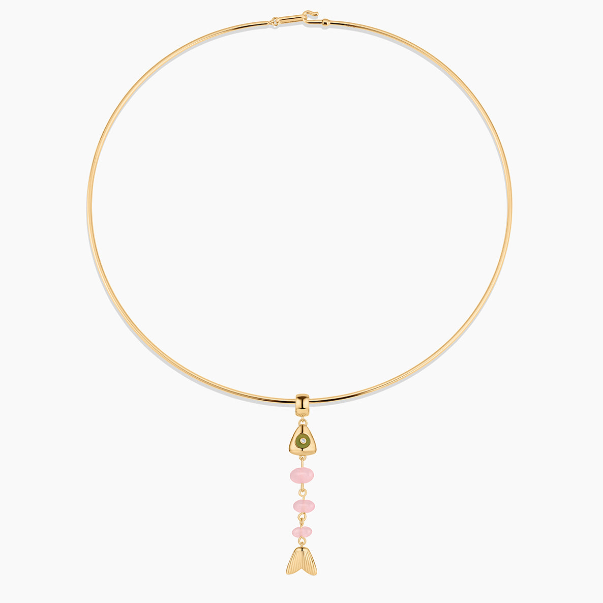 Materials: 14k gold plated, hand-carved pink jade with a chrysoprase eye, cubic zirconia