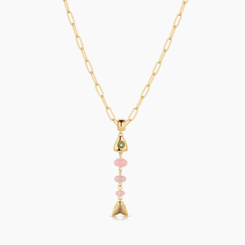 This skeletal fish charm is unlike any you've seen before. A fish bone-inspired silhouette created with hand-carved drop gemstones and a contrasting gemstone eye, complete with CZ sparkle. This delicate beauty adds movement and sparkle, and has become our new favorite treasure from our jewelry box.