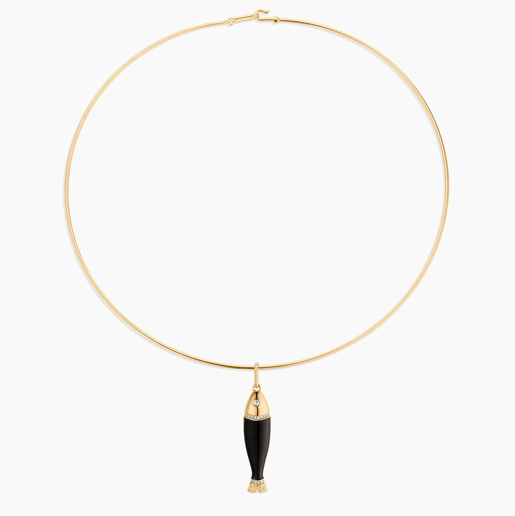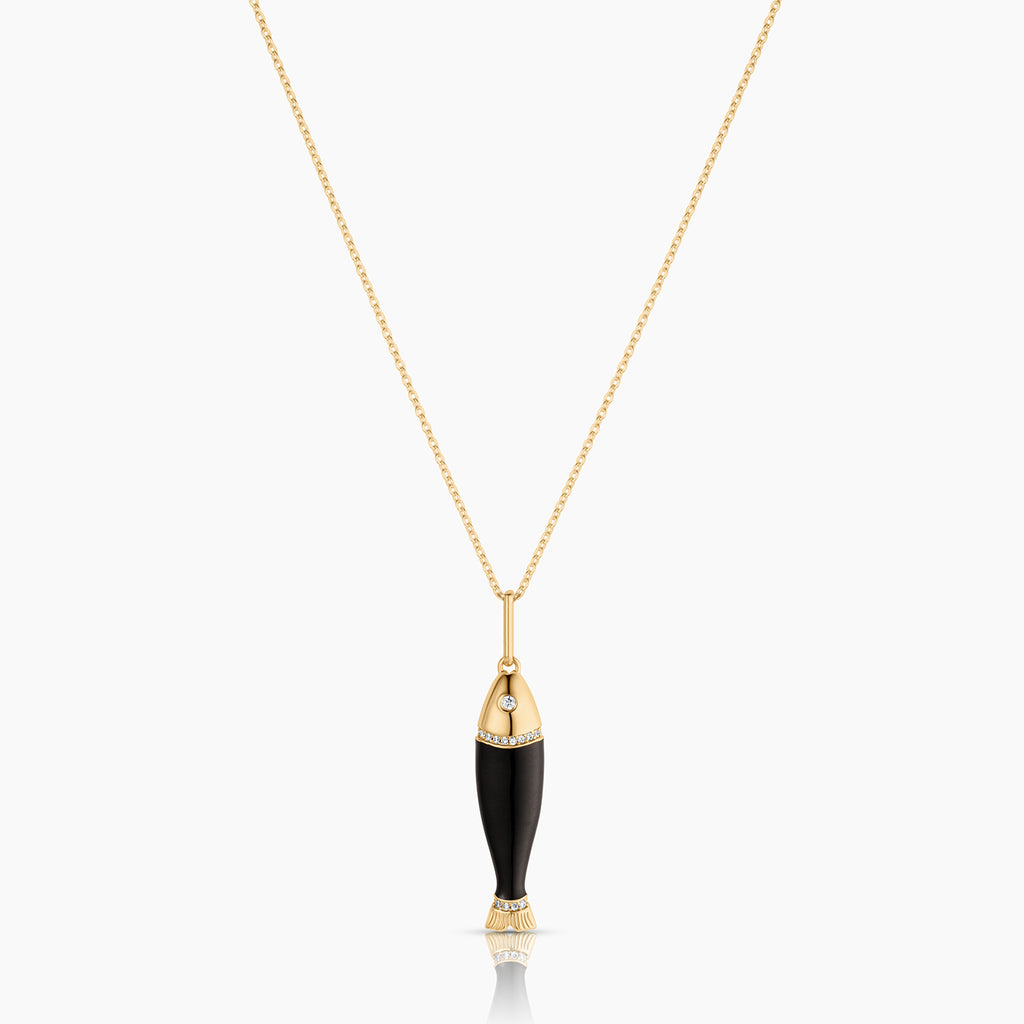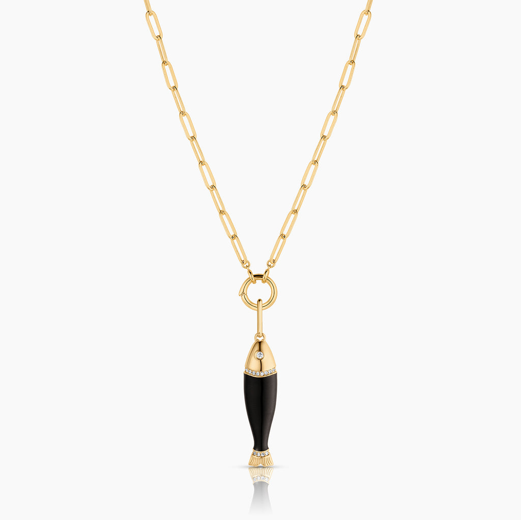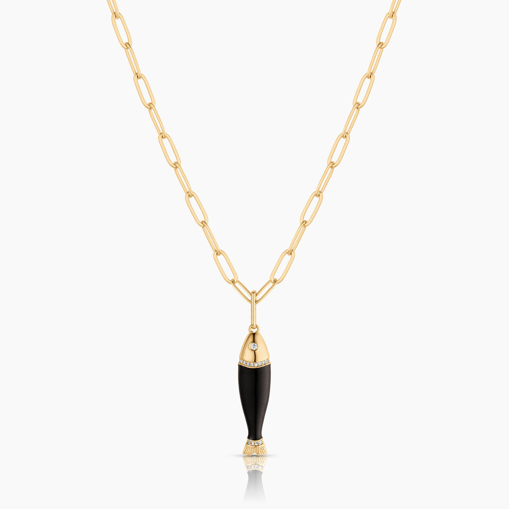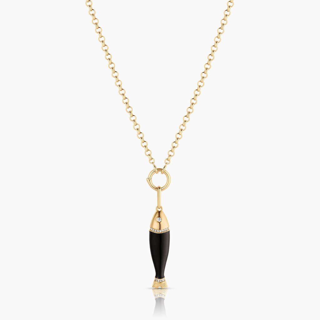 Dive into a sea of black enamel and pavé with Marin, our modern, sleek fish charm. Slid on a slim choker or paired with black CZ earrings, she was designed with the cool girls in mind.