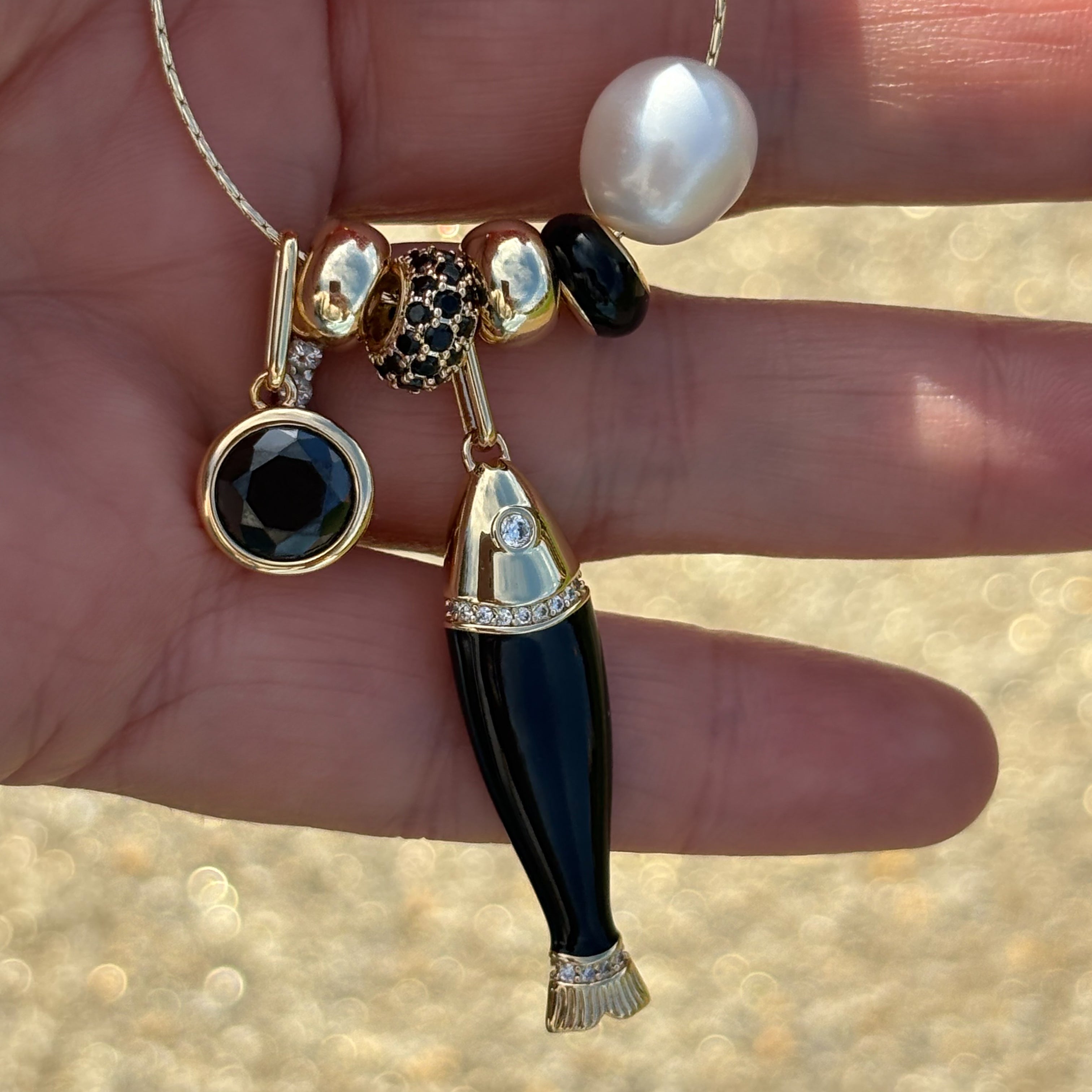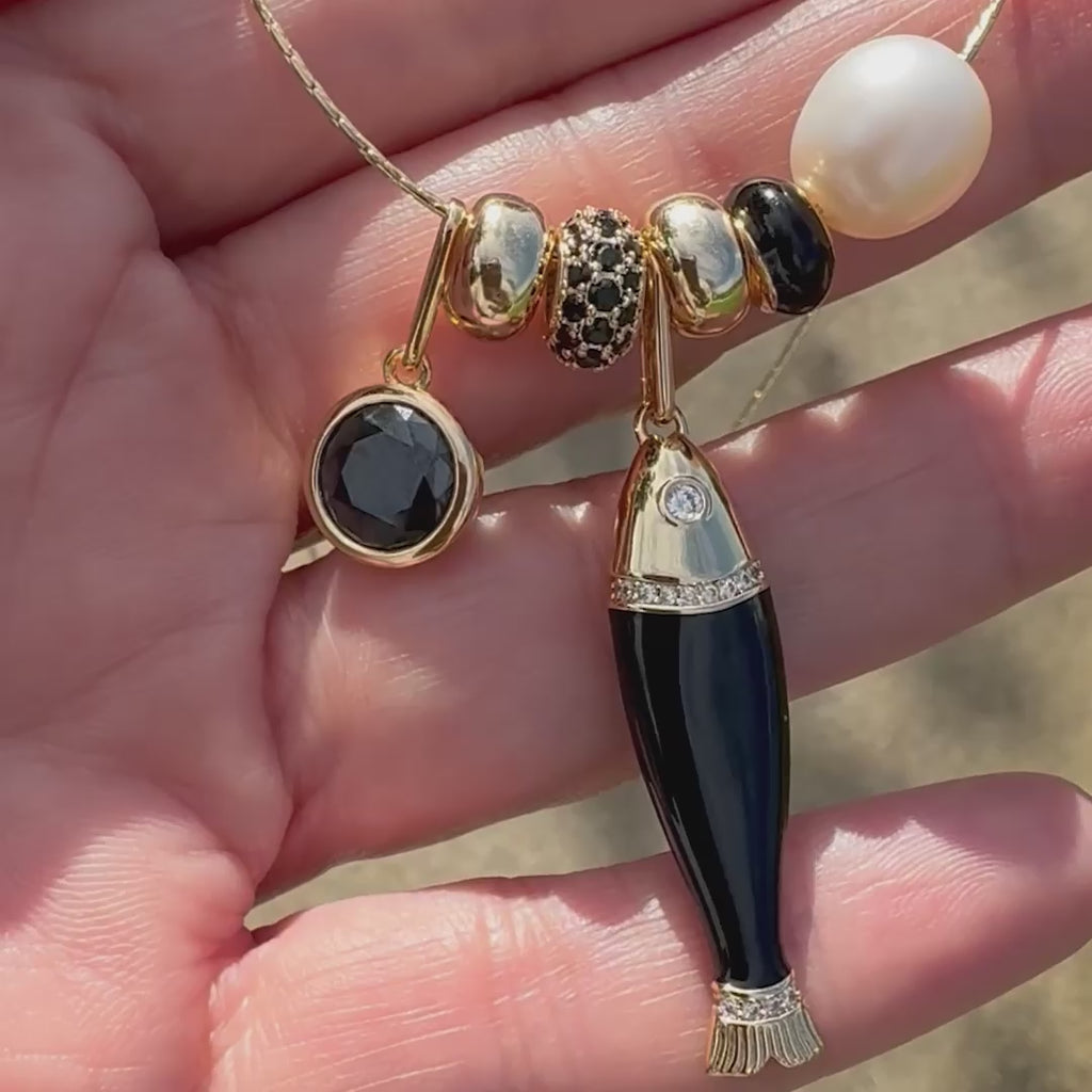 Charm Dimensions: 10 mm (pearl), 2 mm x 4 mm (Astra), 2 mm x 5 mm (Astra Black Pavé), 8 mm x 3.5 mm (Dottie Black CZ), 34 mm x 9 mm x 4 mm (Marin Black Enamel Fish)