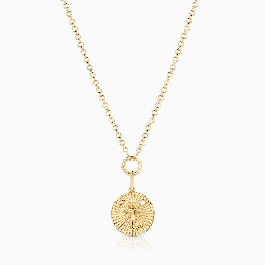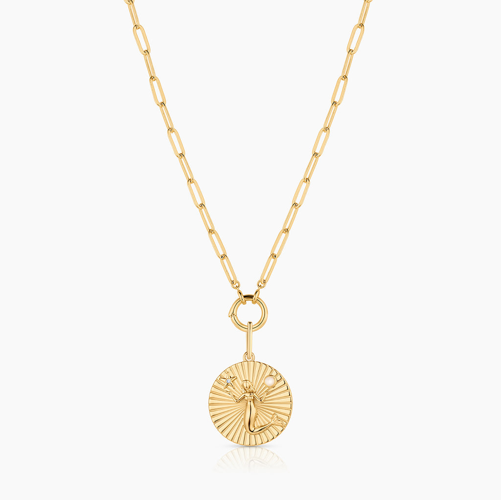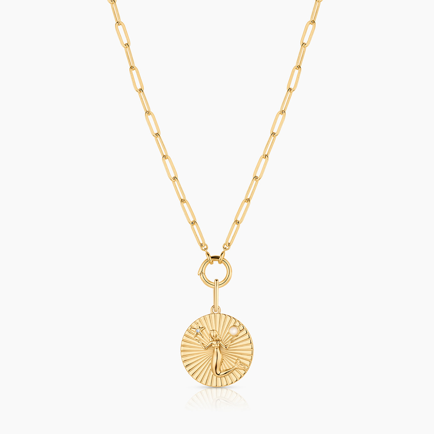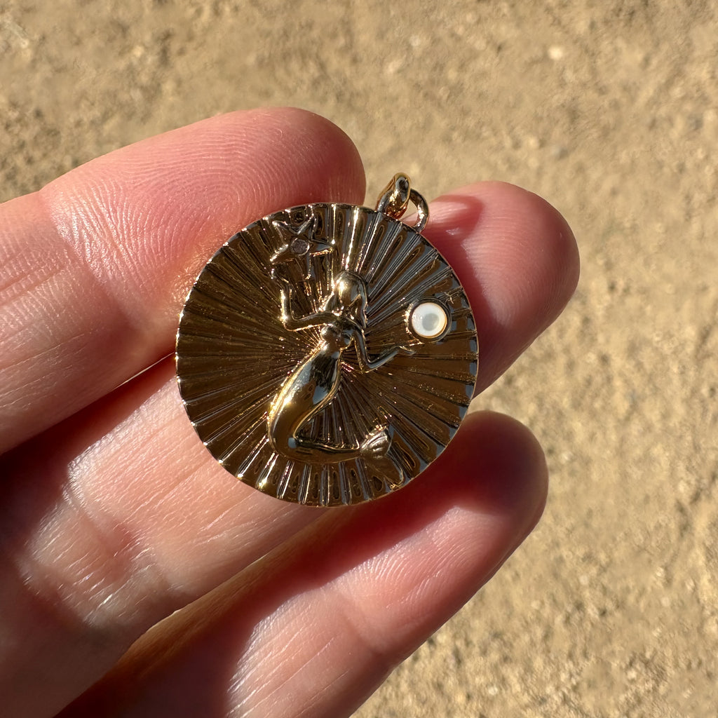 Introducing Naiad, a symbol of freedom and femininity. This mermaid balances a CZ-centered star and mother of pearl stone, bringing this fresh coin charm design to life. A great addition to a charm cluster or layered with pearls and colorful gems.