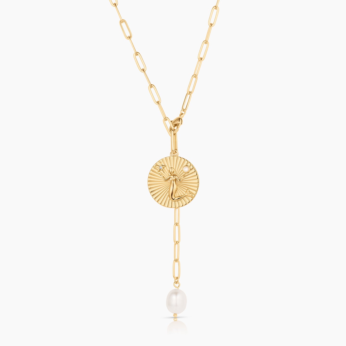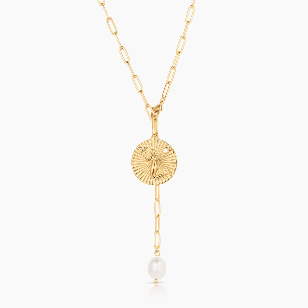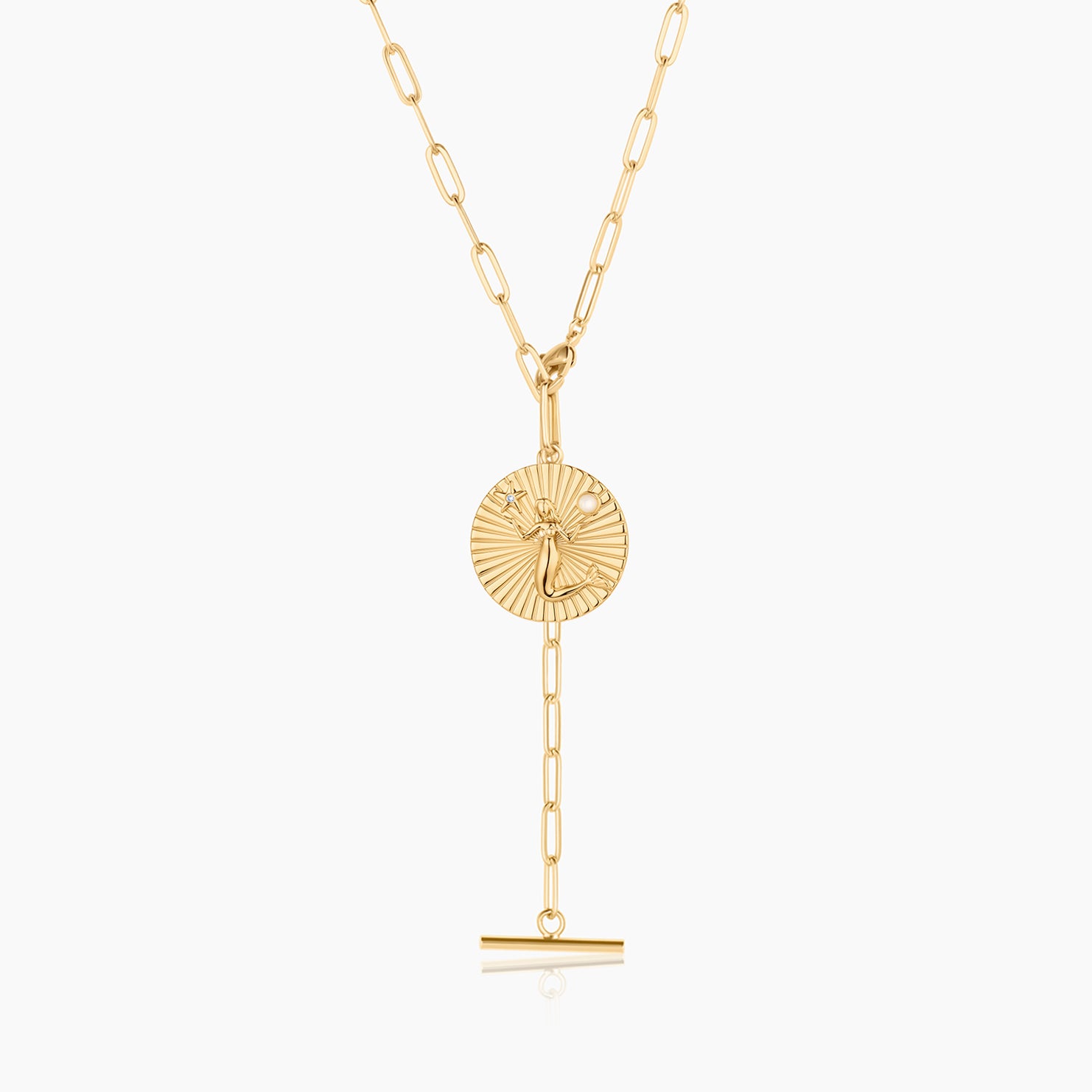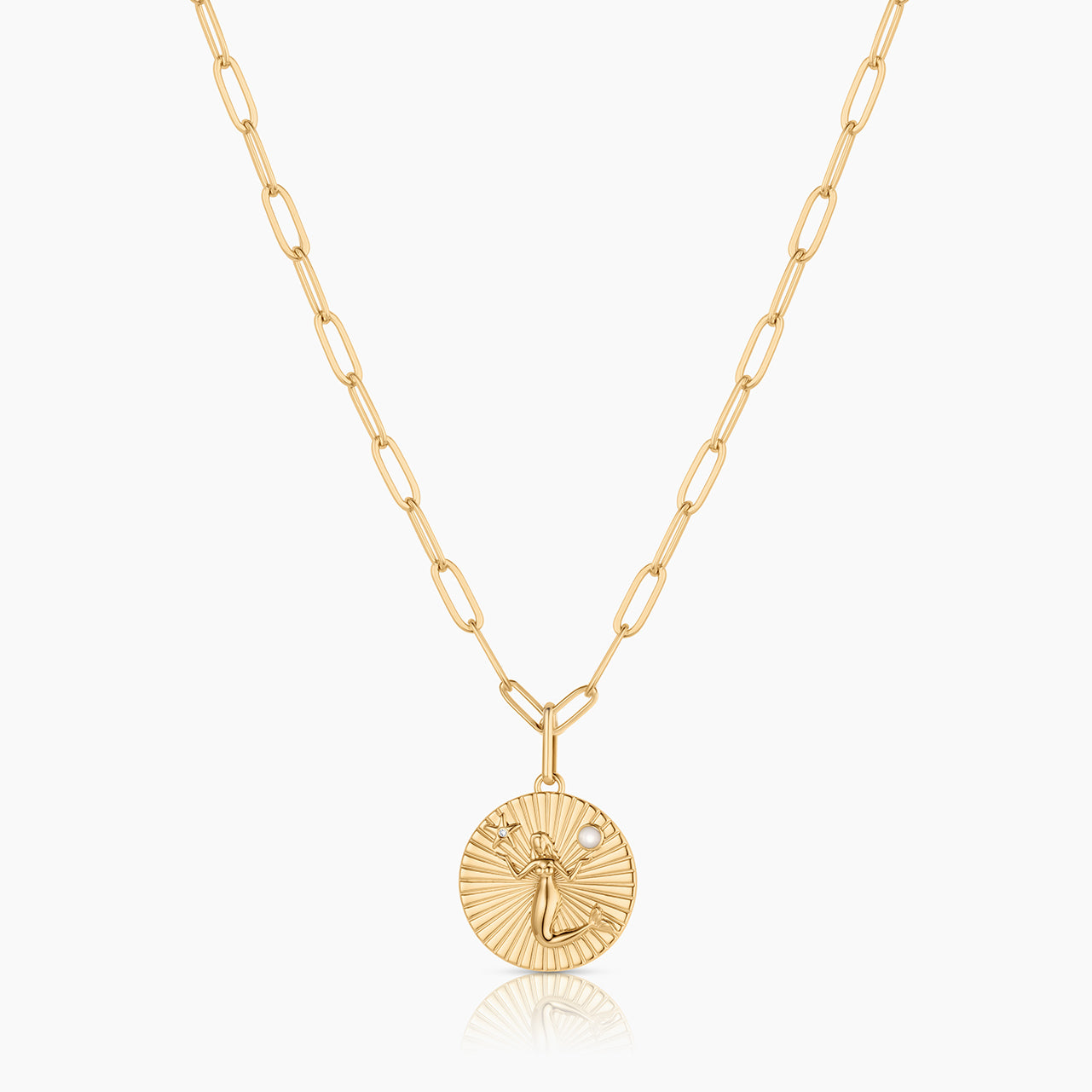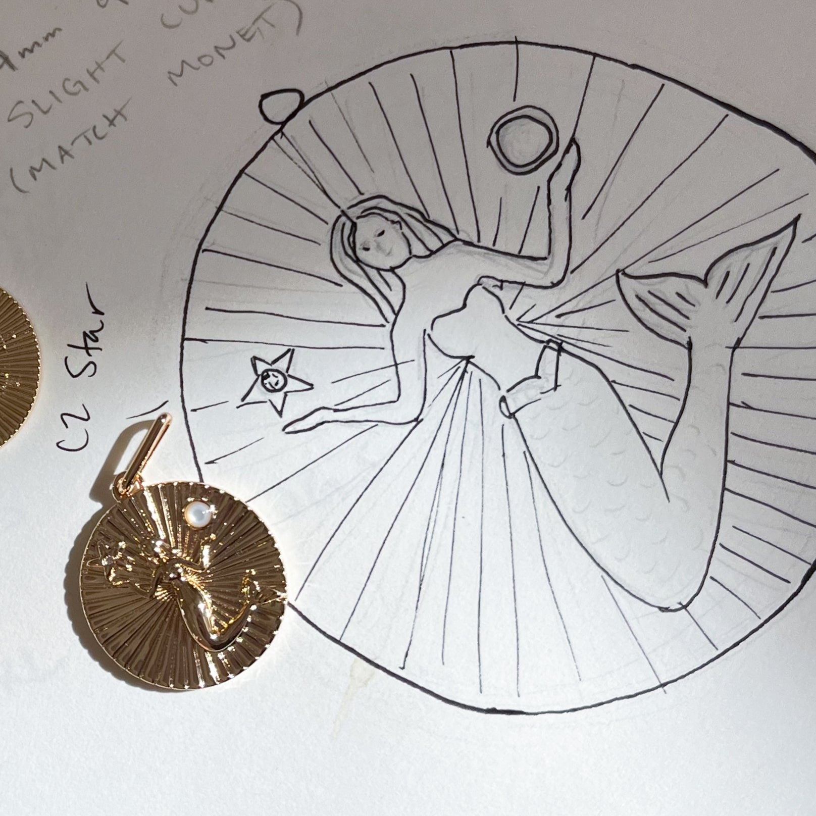 Introducing Naiad, a symbol of freedom and femininity. This mermaid balances a CZ-centered star and mother of pearl stone, bringing this fresh coin charm design to life. A great addition to a charm cluster or layered with pearls and colorful gems.