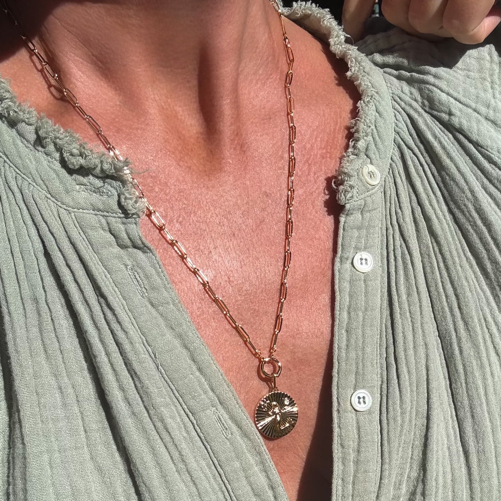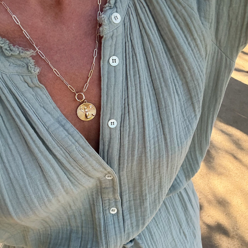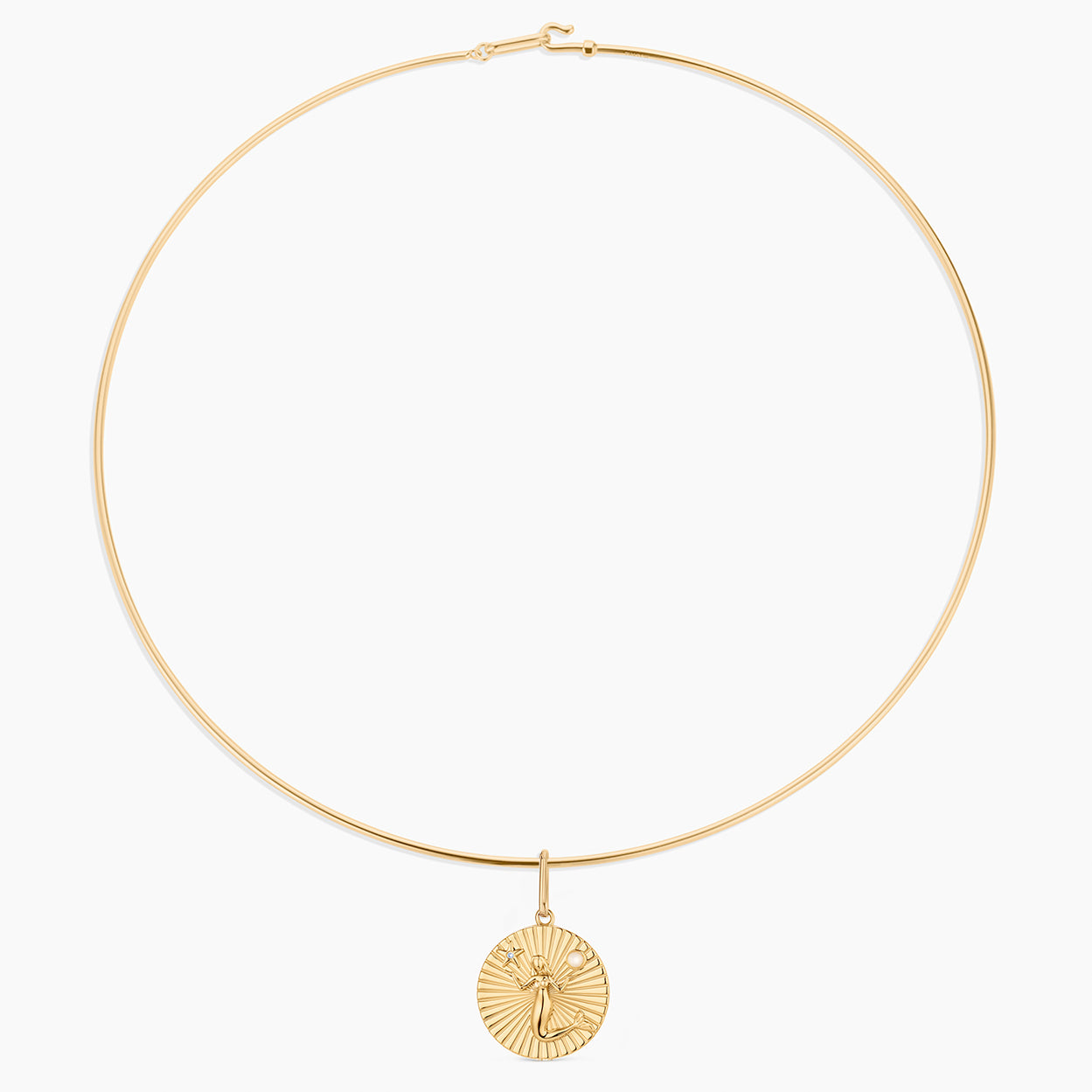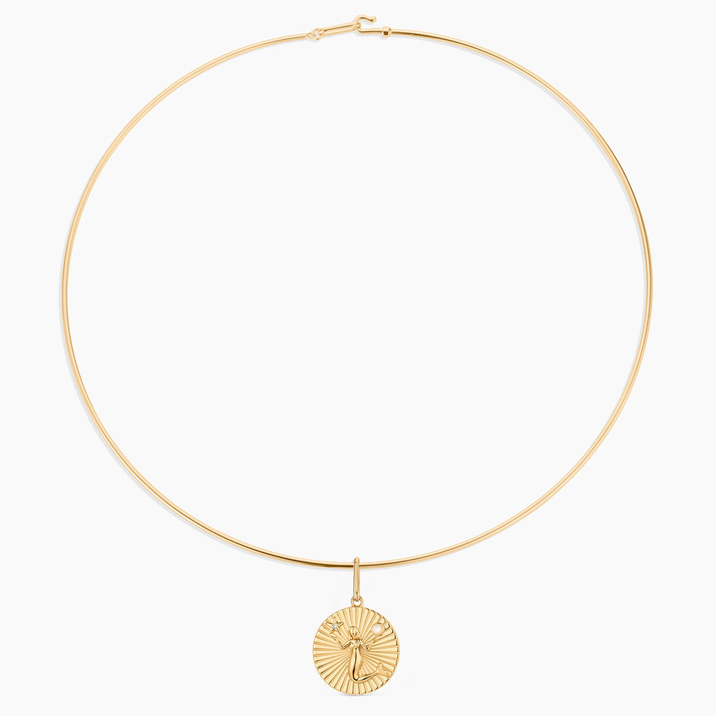 Introducing Naiad, a symbol of freedom and femininity. This mermaid balances a CZ-centered star and mother of pearl stone, bringing this fresh coin charm design to life. A great addition to a charm cluster or layered with pearls and colorful gems.