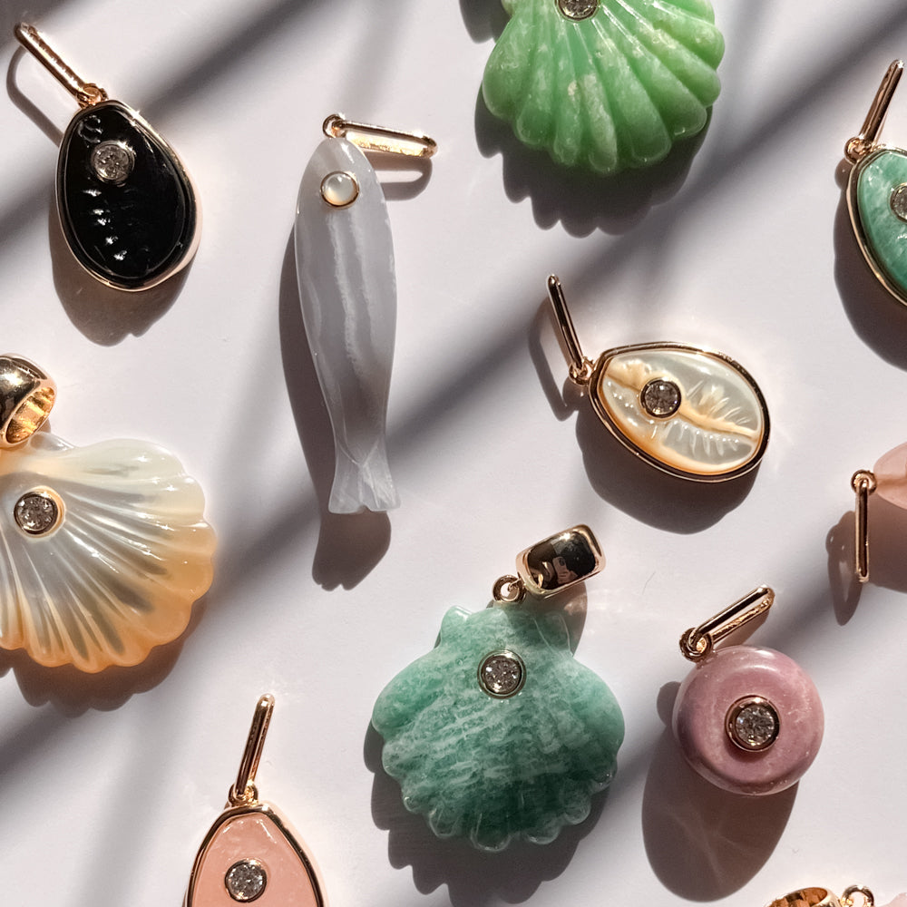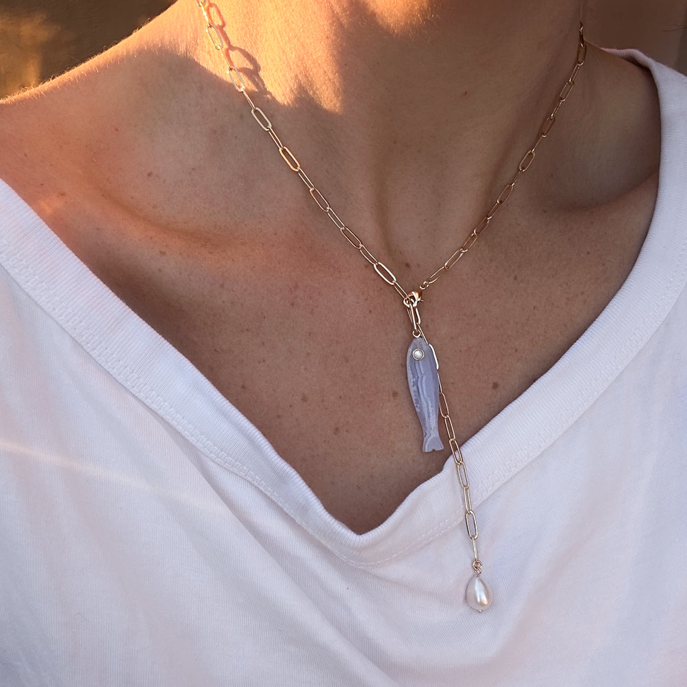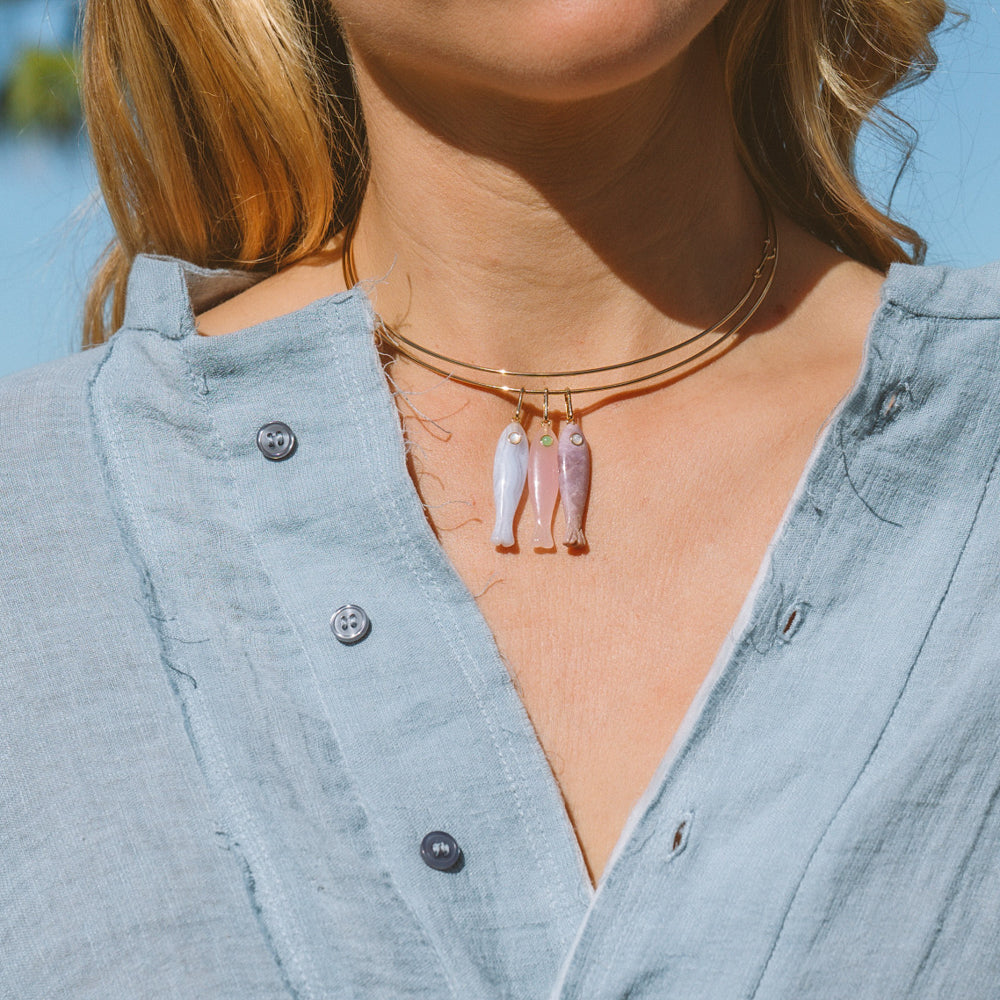 She's a best seller for a reason. Our new favorite hand-carved gemstone fish charm has quickly become the must-have charm of the season. This blue lace agate fish (with a mother of pearl eye!) can be worn alone on our Monet Choker or necklace chains, or layered with your other favorite charms. Our Fortuna isn't just a cute charm, it's a little amulet for good fortune and luck.