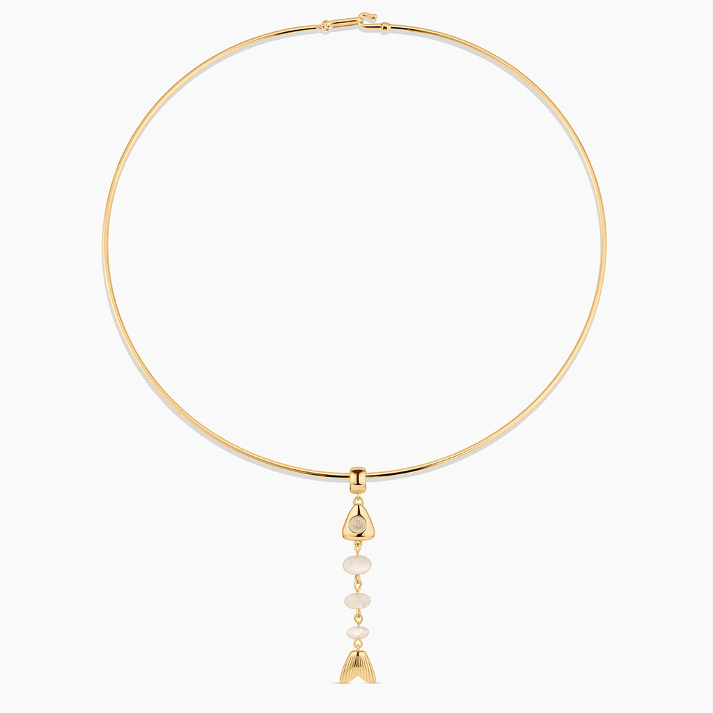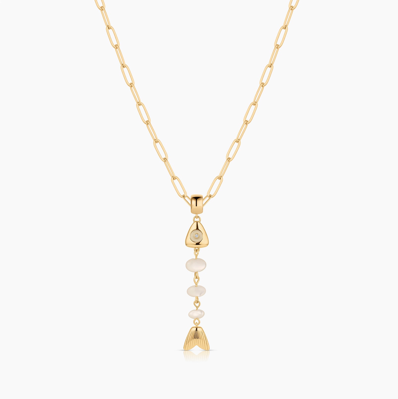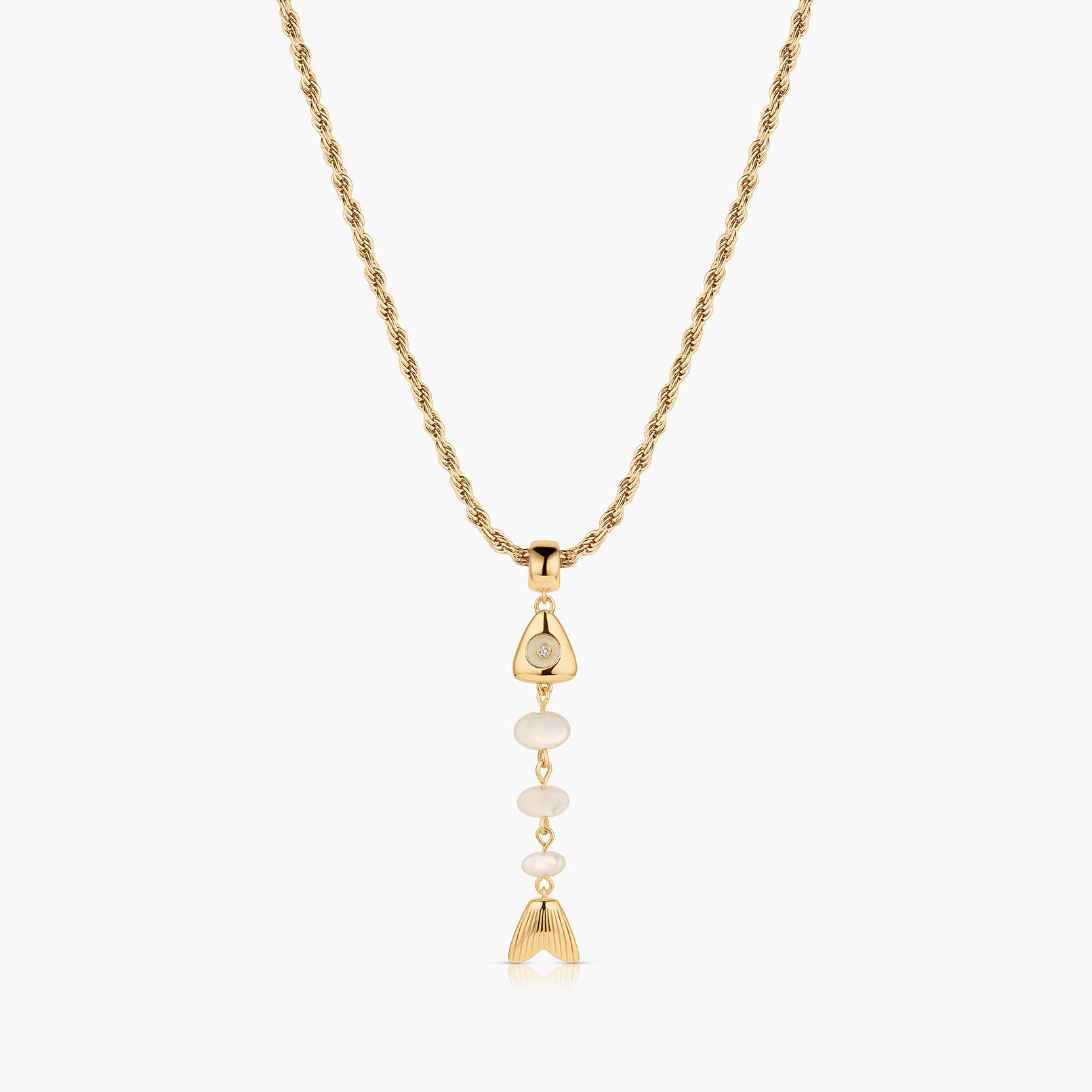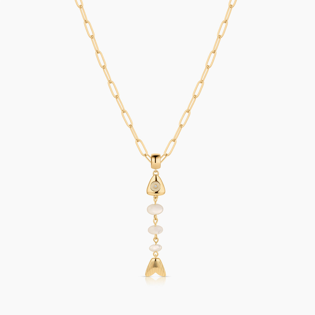 This skeletal fish charm is unlike any you've seen before. A fish bone-inspired silhouette created with hand-carved drop gemstones and a contrasting gemstone eye, complete with CZ sparkle. This delicate beauty adds movement and sparkle, and has become our new favorite treasure from our jewelry box.
