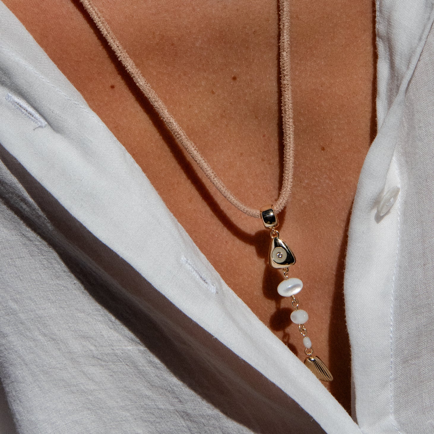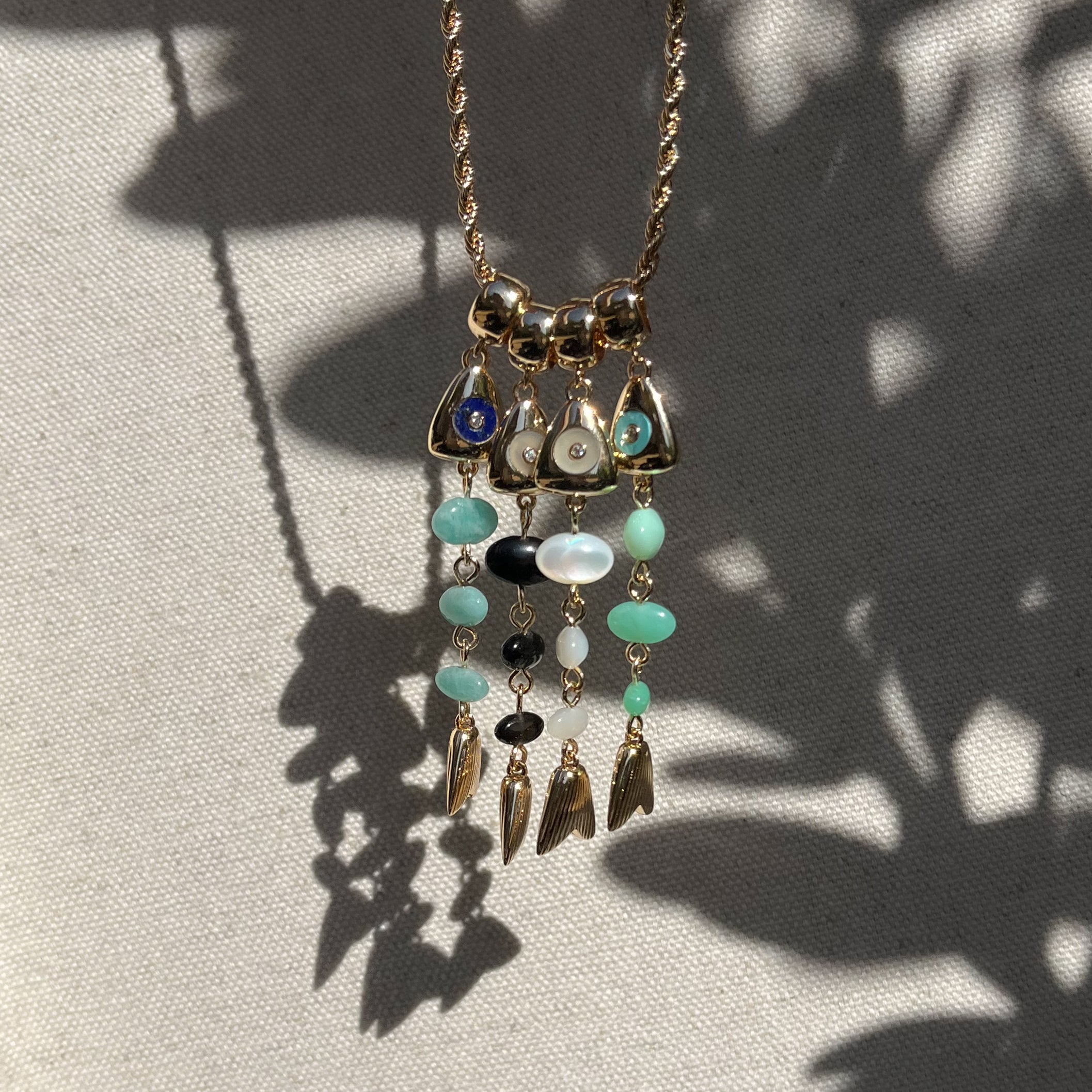 Materials: 14k gold plated, hand-carved mother of pearl with an amazonite eye, cubic zirconia