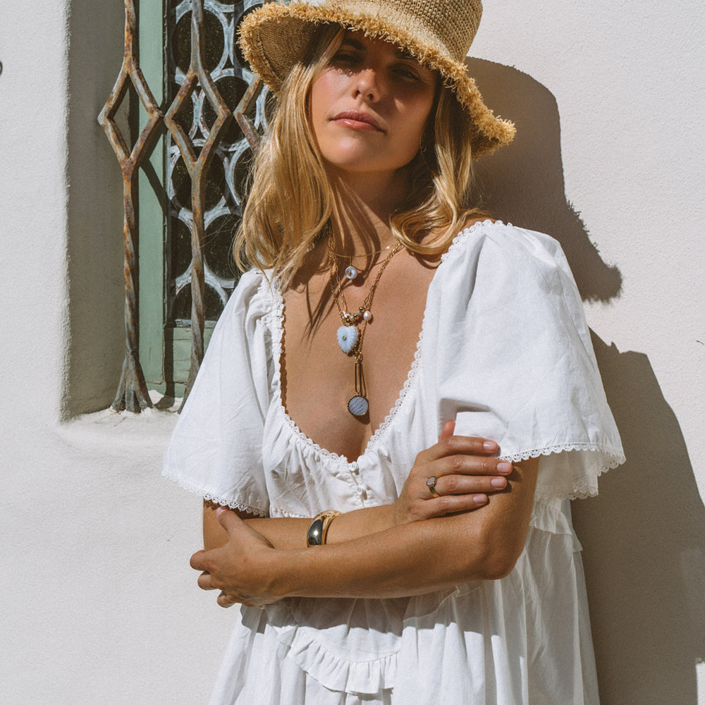 Materials: 14k gold plated, hand-carved blue lace agate, cubic zirconia, 100% natural freshwater pearl