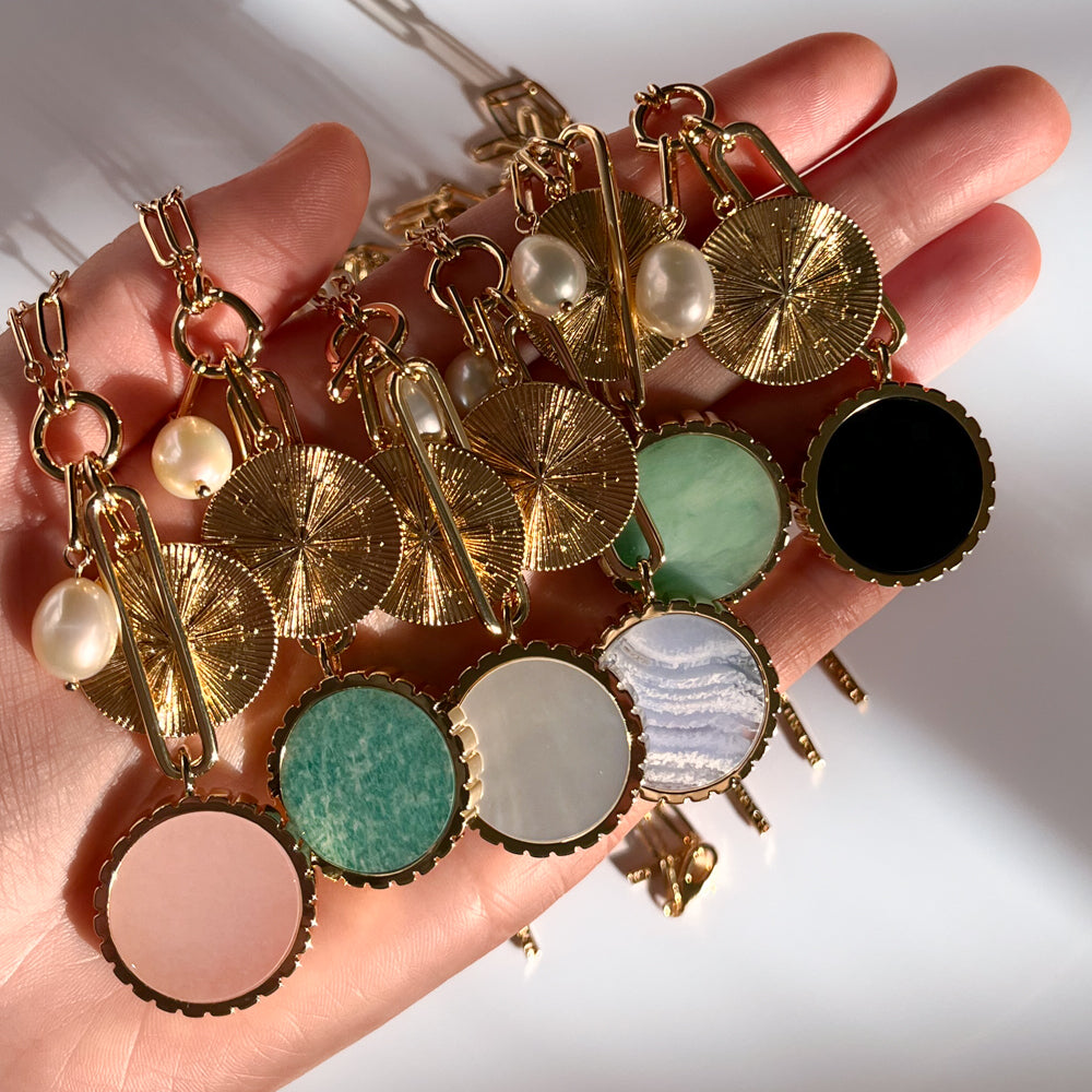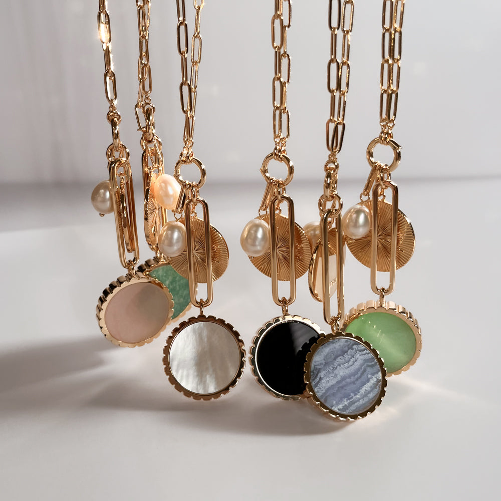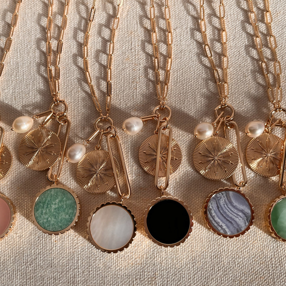 Luminescent natural stone and golden charms layered seamlessly on our best-selling charm chain — Solario instantly adds shine and dimension to every look. Charms are removable for ultimate transformability.