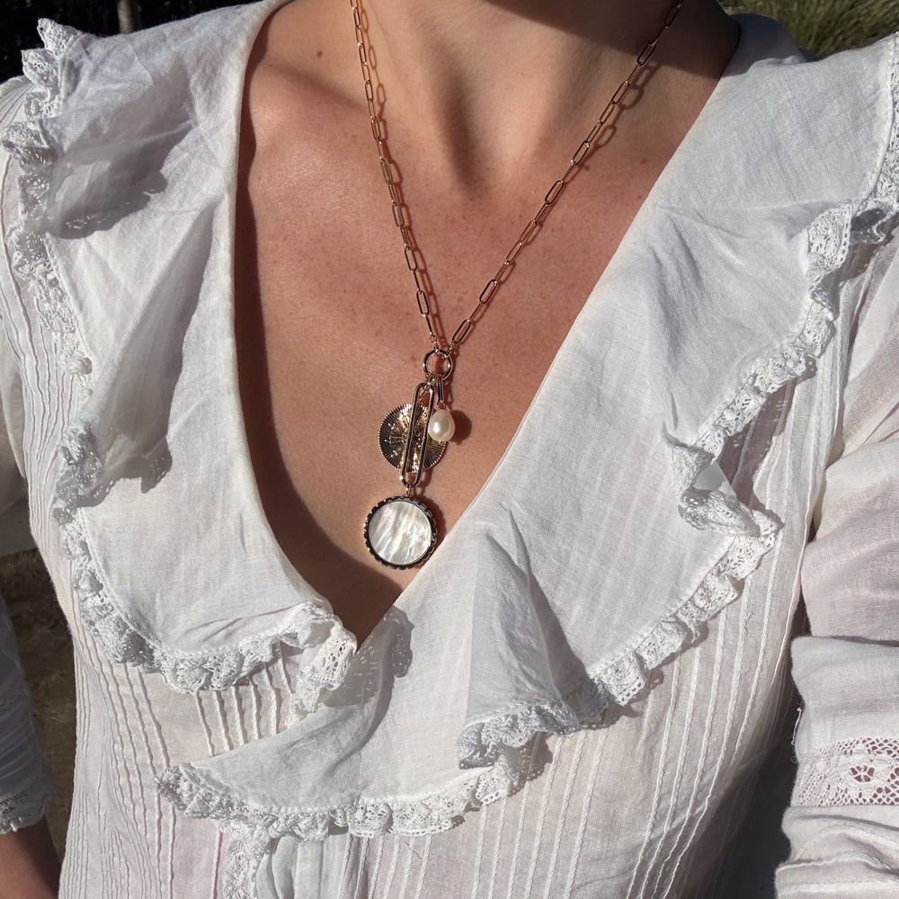 Materials: 14k gold plated, hand-carved mother of pearl, 100% natural freshwater pearl