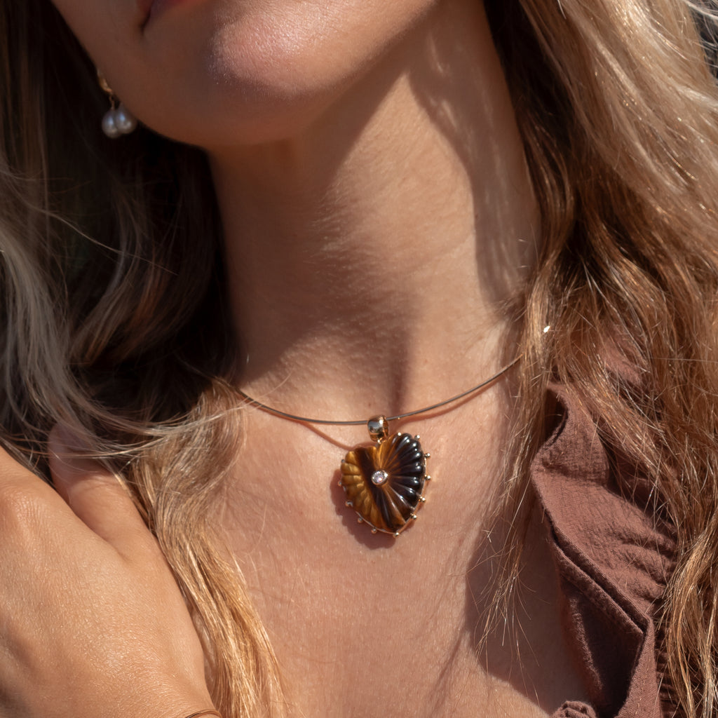 Our Malene heart charm in luxe tiger's eye—hand-carved stone, cubic zirconia, and high-shine gold on a large round bail for versatility. Everything you want and need to make a statement.