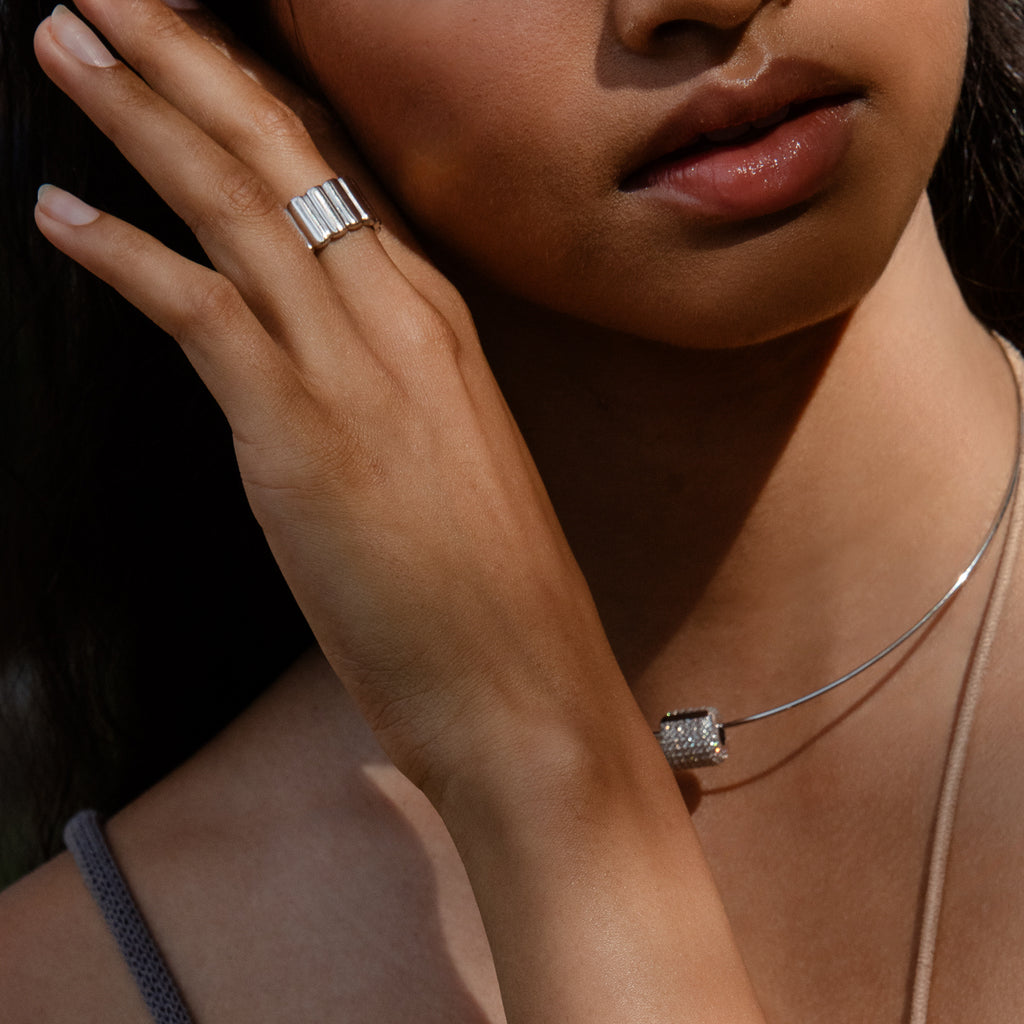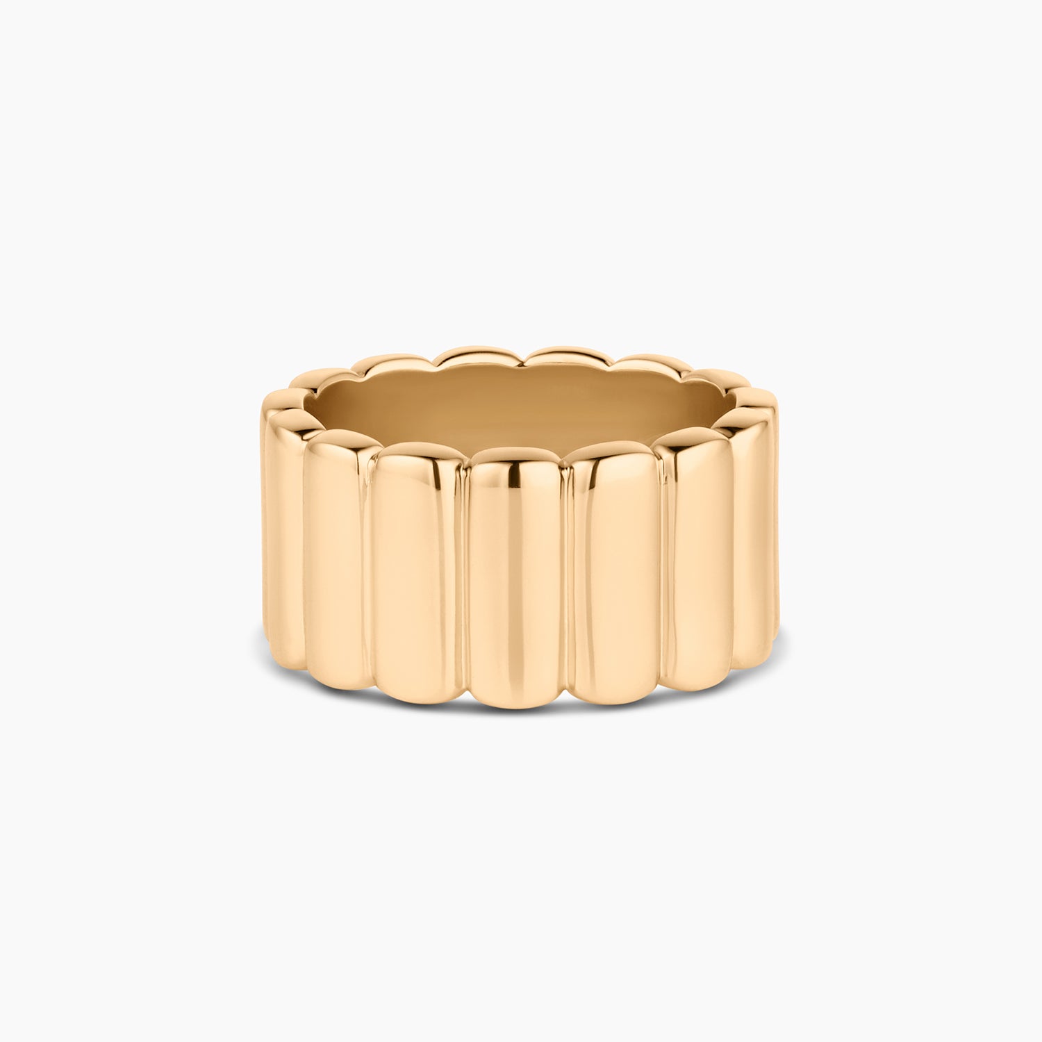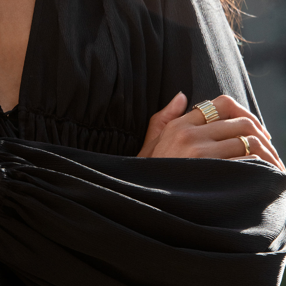 Elevate your stack with the Cierra ring. Inspired by our ridged bead charm, this ring is full of texture, shine, and a little art deco.