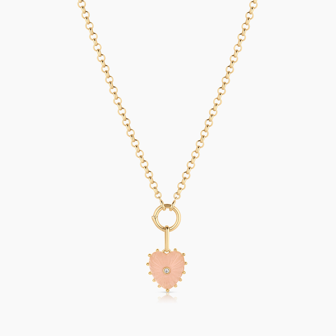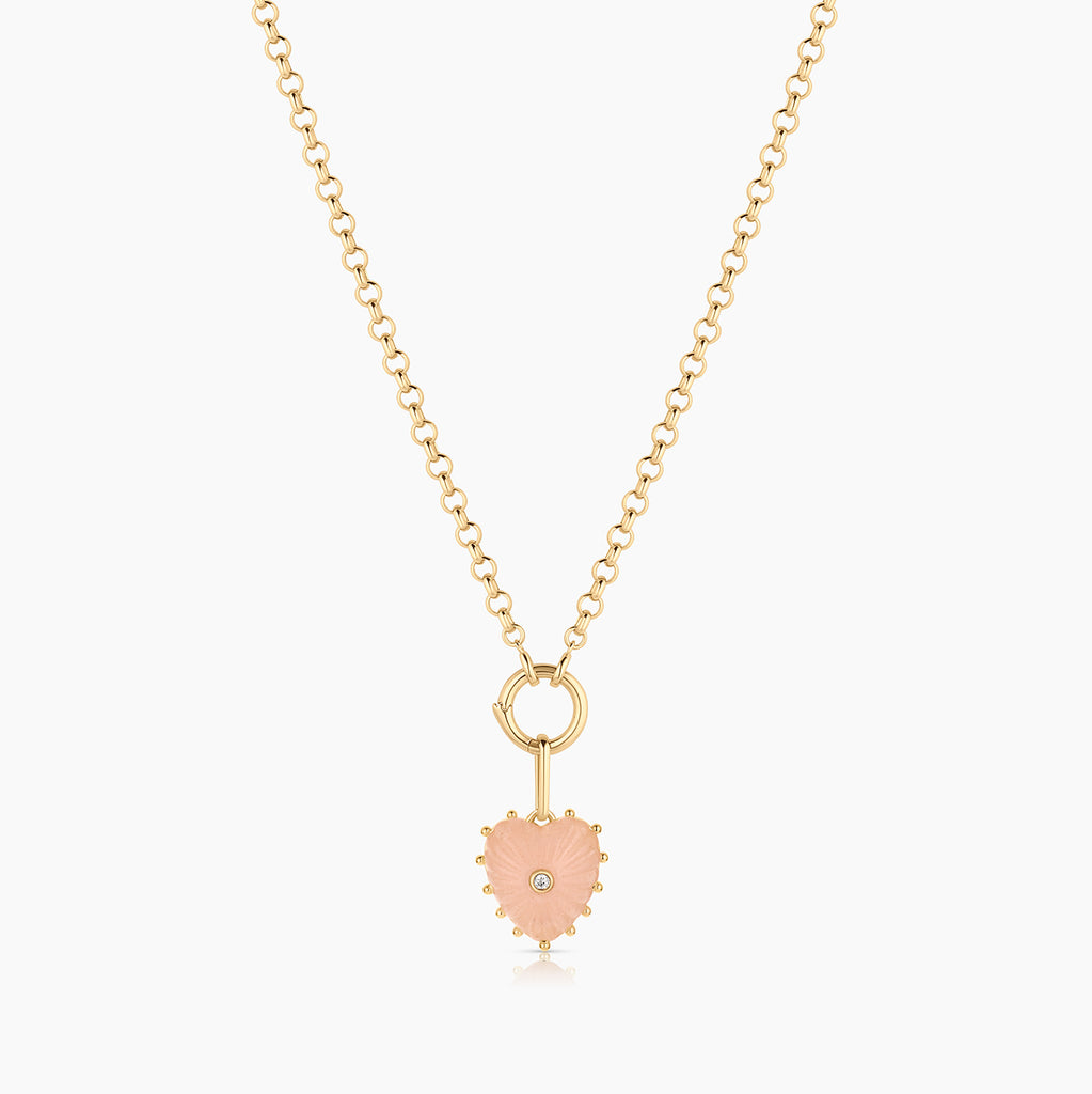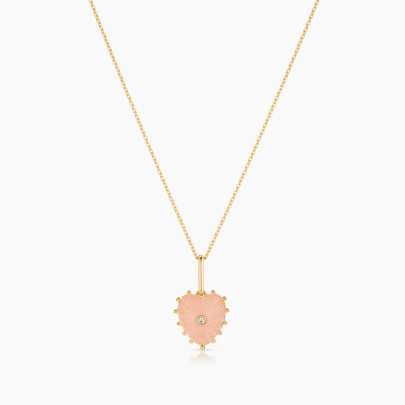 She's Malene's baby sister, a smaller hand-carved pink jade heart charm with a sparkling center stone. A favorite for gifting and layering.