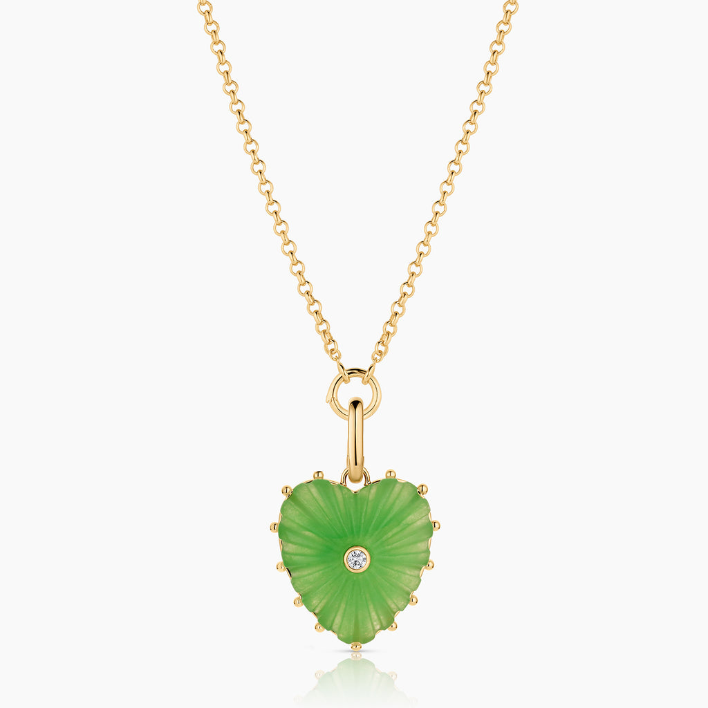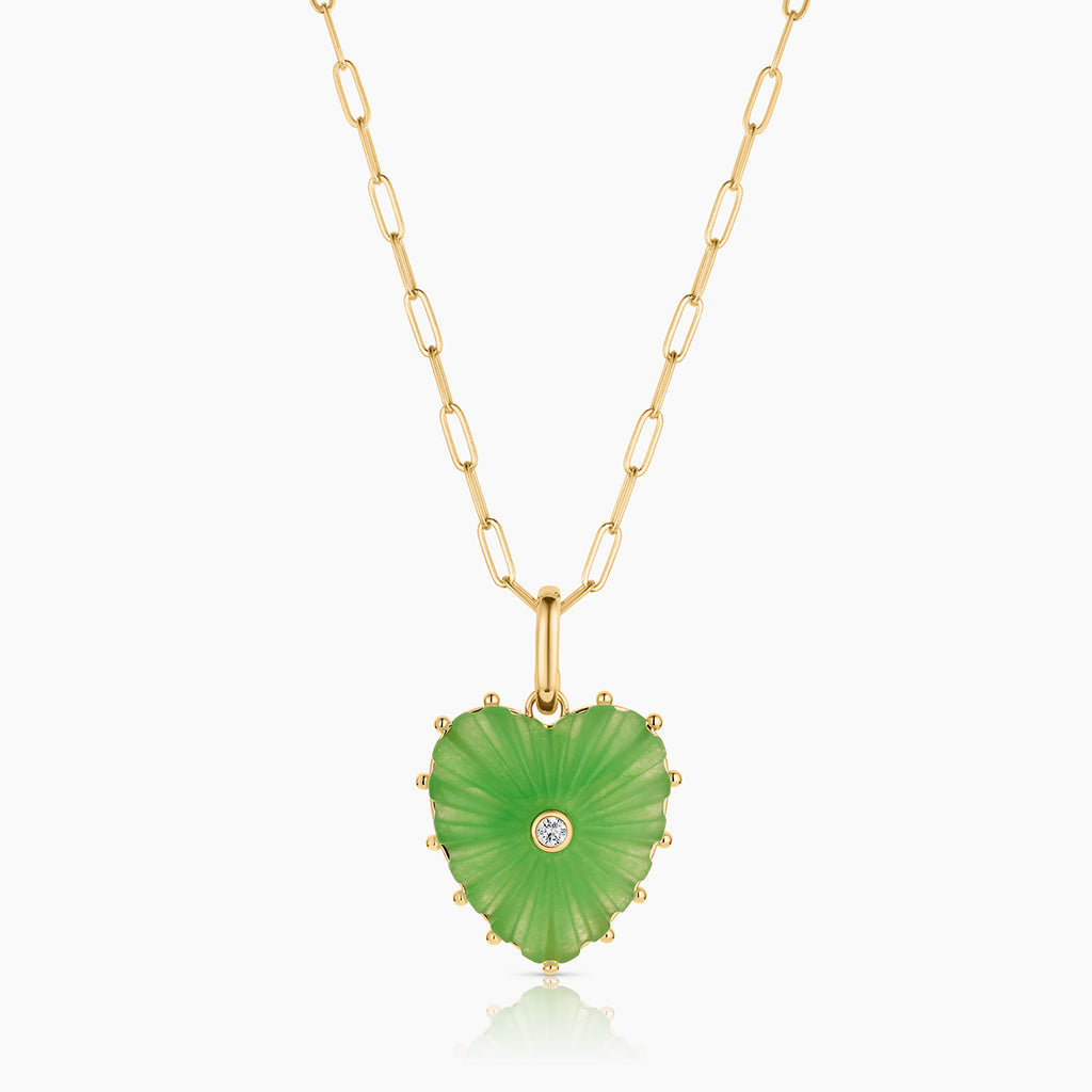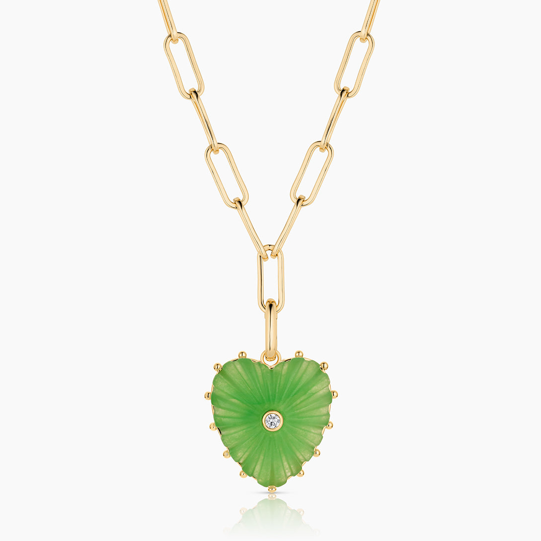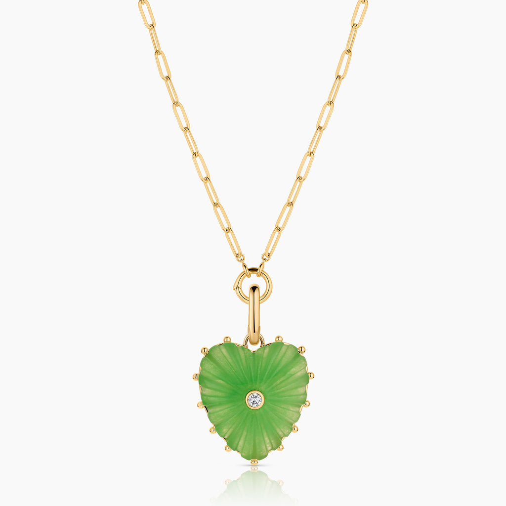 Our Malene heart charm in radiant light green jade — hand-carved stone, cubic zirconia, and high-shine gold on a hinge clip for removability. Everything you want and need to make a statement.
