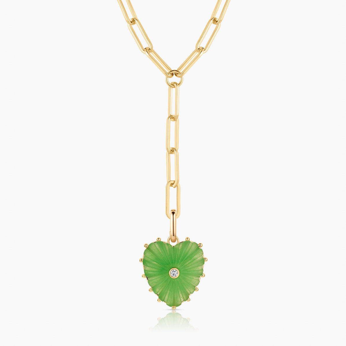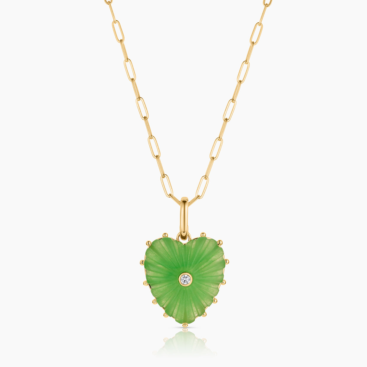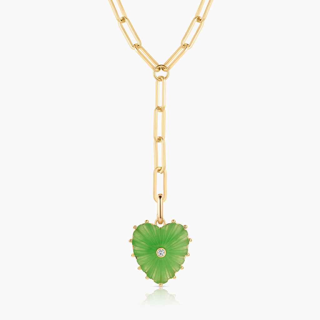 Our Malene heart charm in radiant light green jade — hand-carved stone, cubic zirconia, and high-shine gold on a hinge clip for removability. Everything you want and need to make a statement.