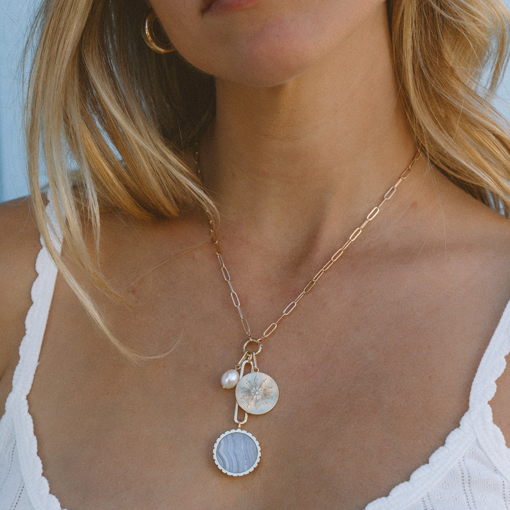 Luminescent natural stone and golden charms layered seamlessly on our best-selling charm chain — Solario instantly adds shine and dimension to every look. Charms are removable for ultimate transformability.